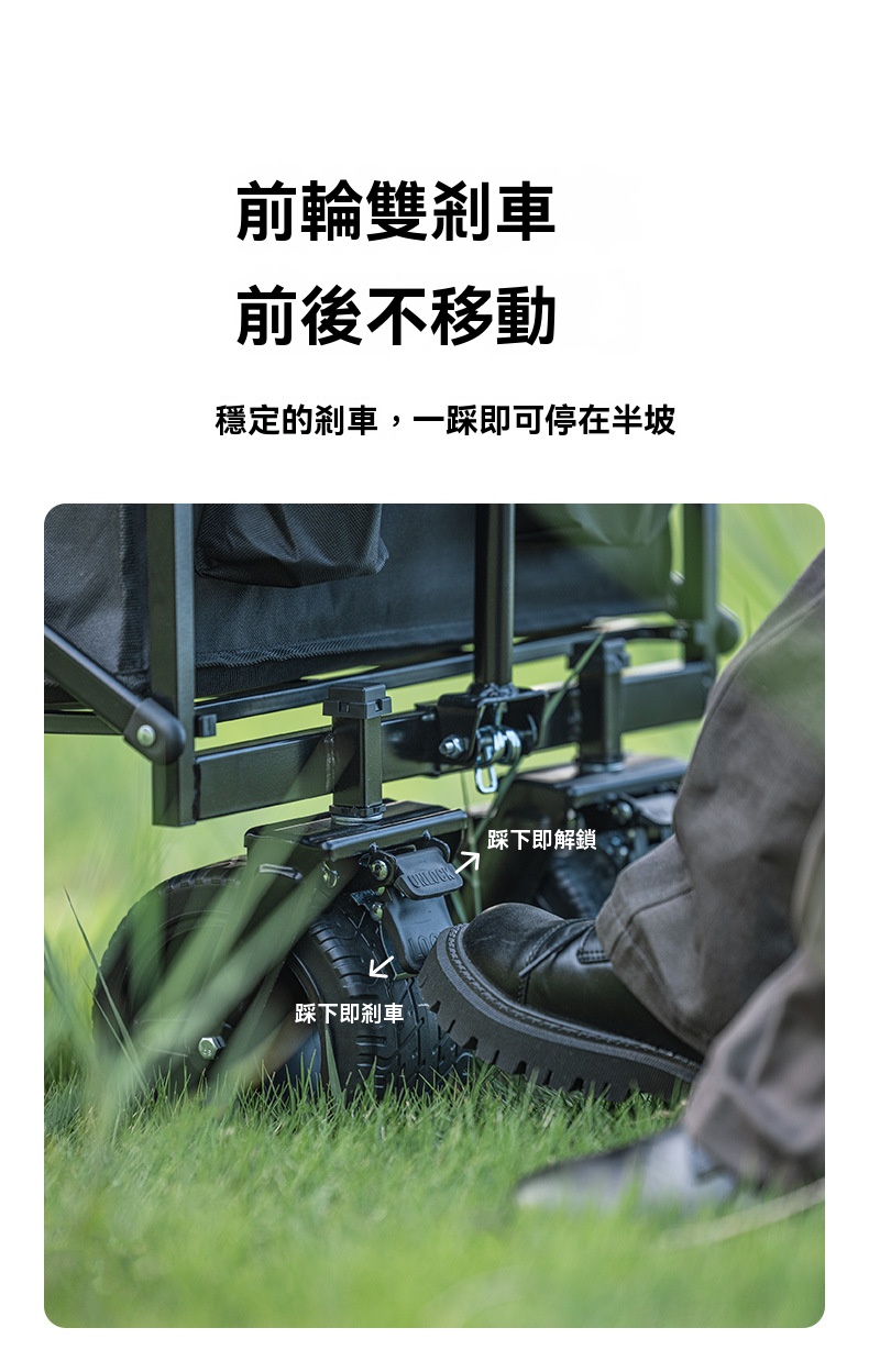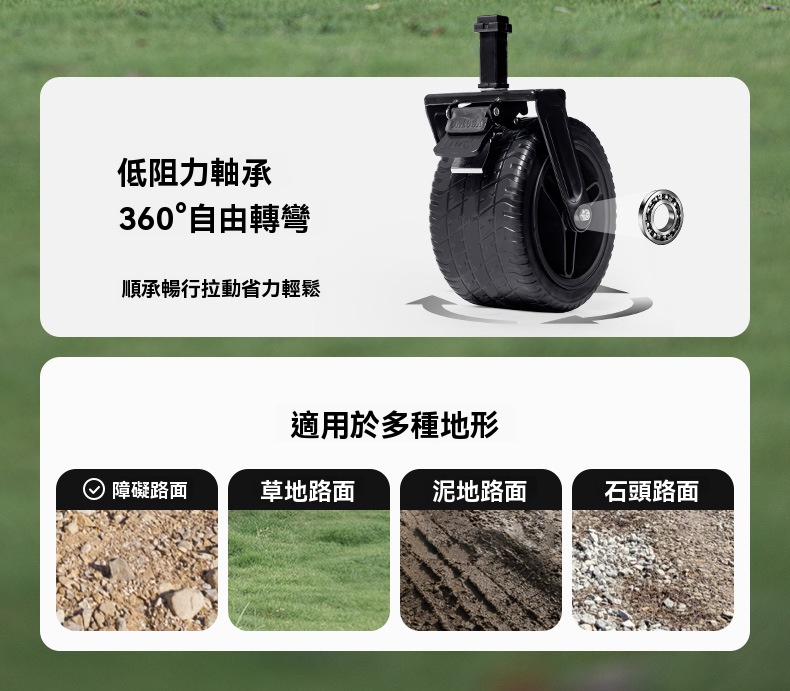 • 靈活萬向輪配置:軸承包覆的萬向輪轉向順滑,前側雙輪 360° 旋轉,搭配全地形車胎,適應草地、沙地等多種戶外路況。