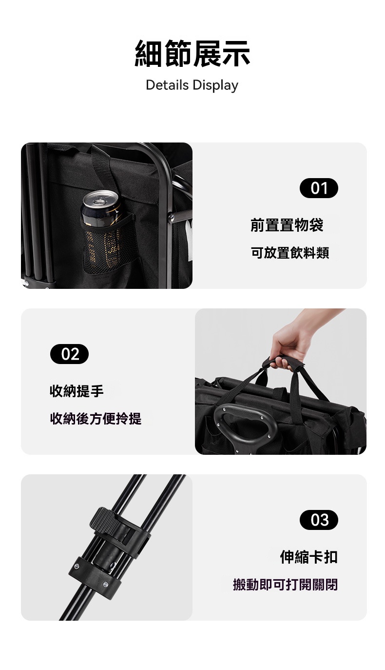 這款BLACKDOG漫遊折疊露營車(CBD2450JJ035)升級款,無疑是露營愛好者的得力助手。其採用黑色酷炫外觀,展現時尚大氣。車配備軸承萬向輪,前側雙輪擁有360°轉向功能,內含10顆萬向珠子軸承,搭配順滑軸承與全地形車胎,轉向靈活,推拉輕鬆省力,一體式車煞車設計,讓停車更安全。同時,它具備可拆洗設計,布兜與支架採用魔術黏扣連接,髒了可輕鬆拆下清洗,隨時保持乾淨整潔。 150L大容量搭配120KG強承重,輕鬆裝下各類露營裝備,滿足旅遊需求。