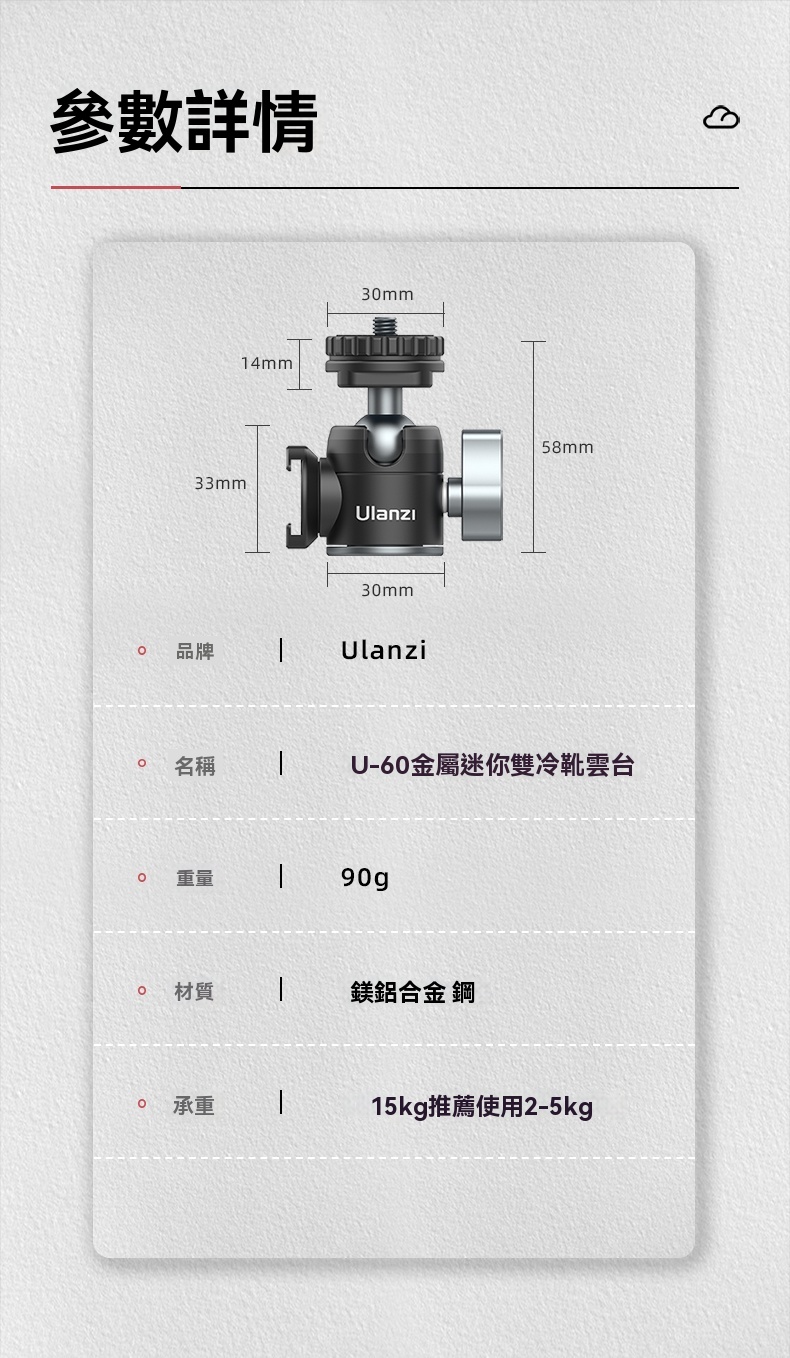 Ulanzi U-60雙冷靴迷你金屬雲台,專為攝影愛好者打造。它採用金屬材質,堅固耐用,能承受一定重量的攝影設備。雙冷靴設計十分實用,可同時安裝麥克風、補光燈等多種配件,滿足多樣化拍攝需求。其雲台部分靈活穩定,可實現多角度旋轉,方便拍攝者輕鬆調整拍攝角度,捕捉理想畫面。小巧的體積便於攜帶,無論是日常出行、旅行拍攝,還是專業創作,它都能隨時為你提供穩定支撐,助力拍攝出高品質的影像作品。