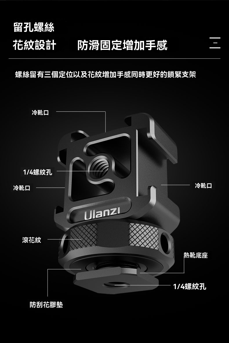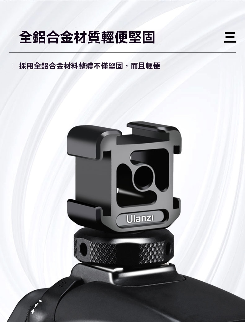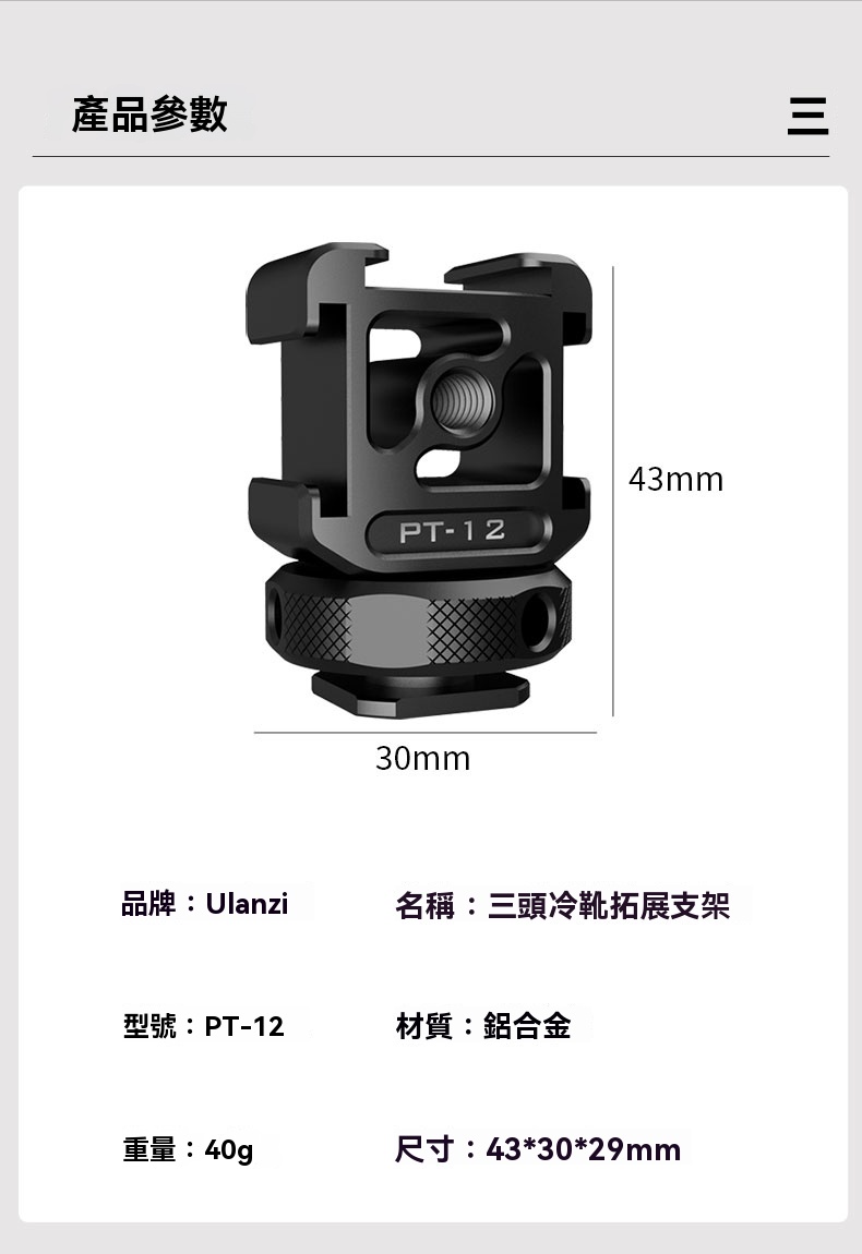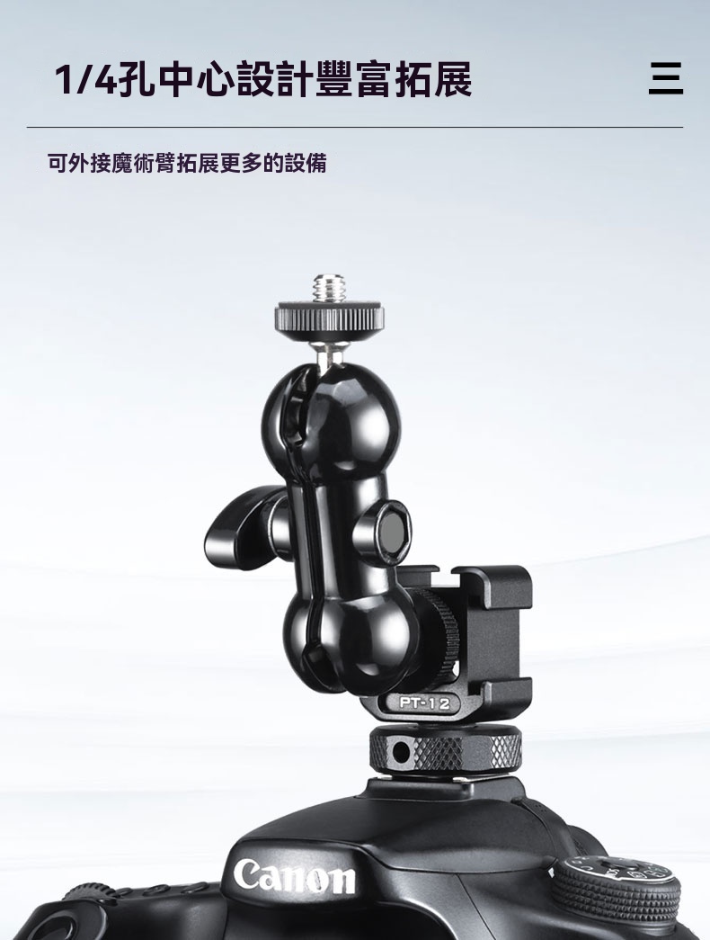 Ulanzi PT-12 三頭冷靴拓展支架採用全鋁合金材質,輕便且堅固耐用。該產品擁有三個冷靴口,可靈活連接麥克風、補光燈等多種設備,滿足專業攝影和錄影需求。此外,支架設計有1/4孔中心,方便外接魔術臂或其他擴展裝置,進一步豐富功能應用。 產品細節方面,螺絲採用獨特的滾花紋設計,不僅增加手感,還能有效防滑固定,確保裝置穩固不鬆動。同時,熱靴底座配備防刮花膠墊,保護相機表面不受損傷。尺寸為43mm x 30mm x 29mm,重量僅40g,攜帶方便,適合戶外或室內使用。 實際應用中,PT-12 可與專業相機完美搭配,例如在拍攝時連接外置監視器、收音麥克風及補光燈,提升錄影效果。其多功能性和穩定性使其成為攝影愛好者和專業人士的理想選擇。