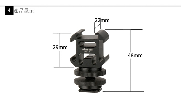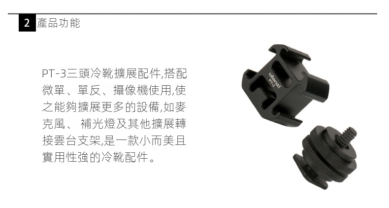 PT-3S 三頭冷靴拓展支架是一款專為攝影和錄影愛好者設計的多功能配件。它採用高品質鋁合金材質,輕巧耐用,僅重90克,長度僅10.5公分,極具便攜性。產品擁有三個標準1/4英寸螺孔,可靈活擴展多種設備,如麥克風、補光燈或其他轉接雲台支架,滿足不同拍攝需求。 該拓展支架適用於各種微單、單反相機及攝像機,通用型設計確保與大多數設備兼容。其迷你小巧的設計不僅方便攜帶,還能有效節省空間,適合戶外或室內使用。此外,產品結構穩固,能夠提供可靠的支撐,確保設備在使用過程中穩定不搖晃。 無論是專業攝影師還是初學者,PT-3S 都是提升拍攝體驗的理想選擇。通過這一配件,您可以根據實際需求自由組合不同的裝備,實現更豐富的創意效果,讓每一次拍攝都更加得心應手。
