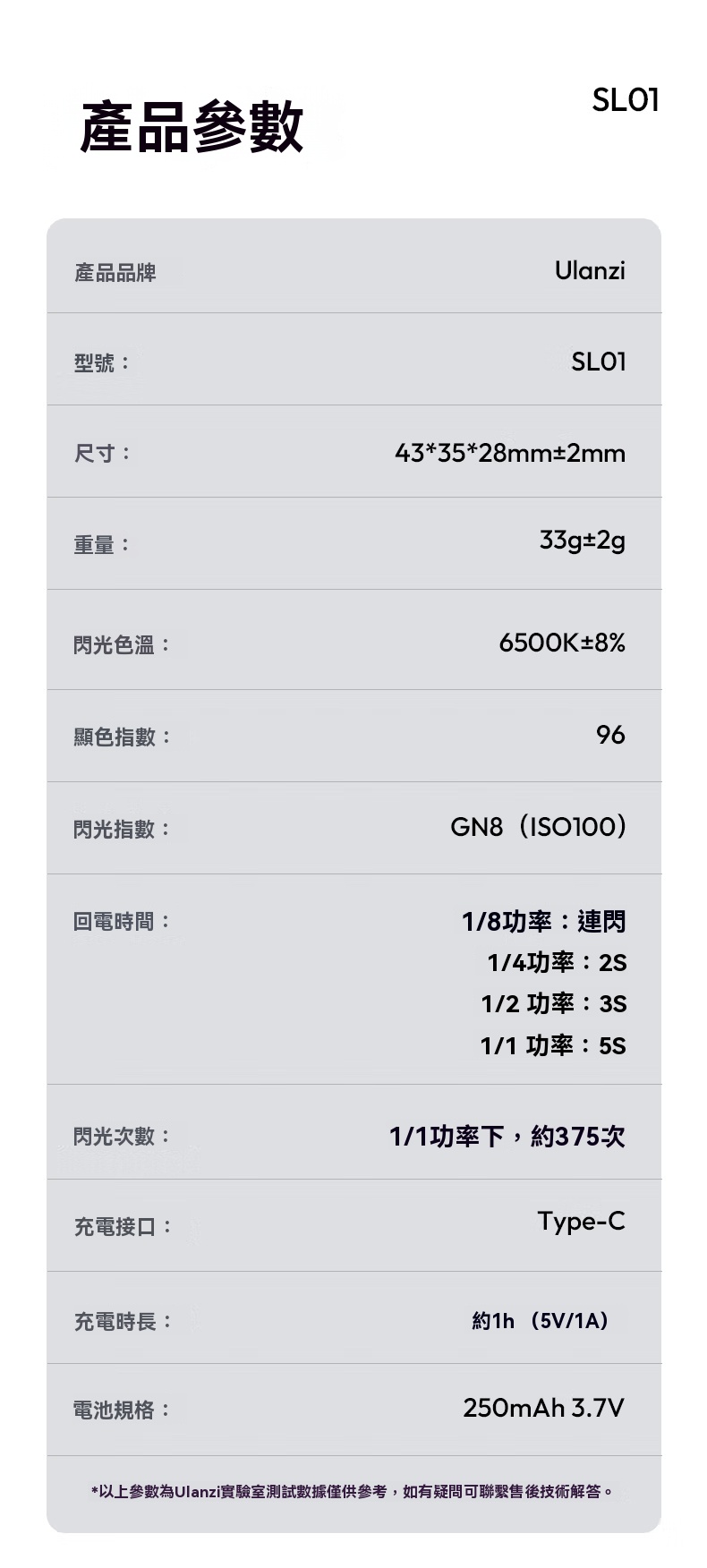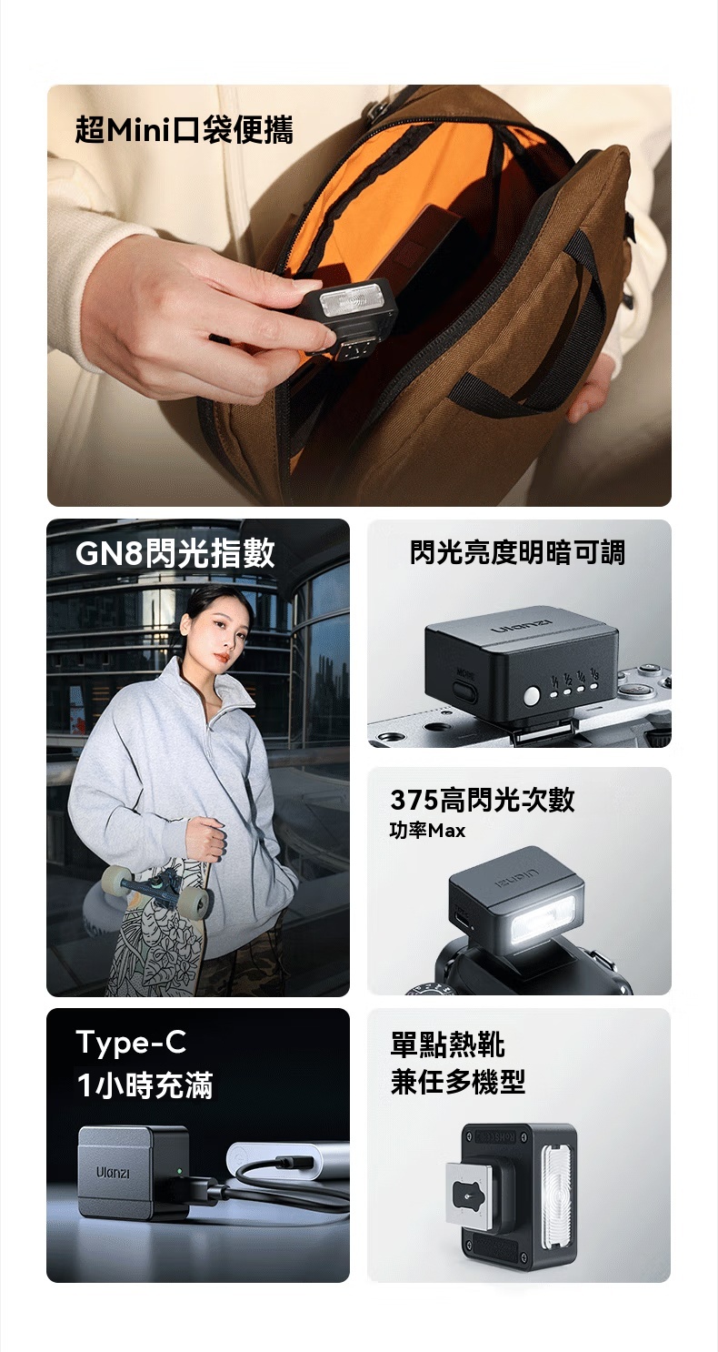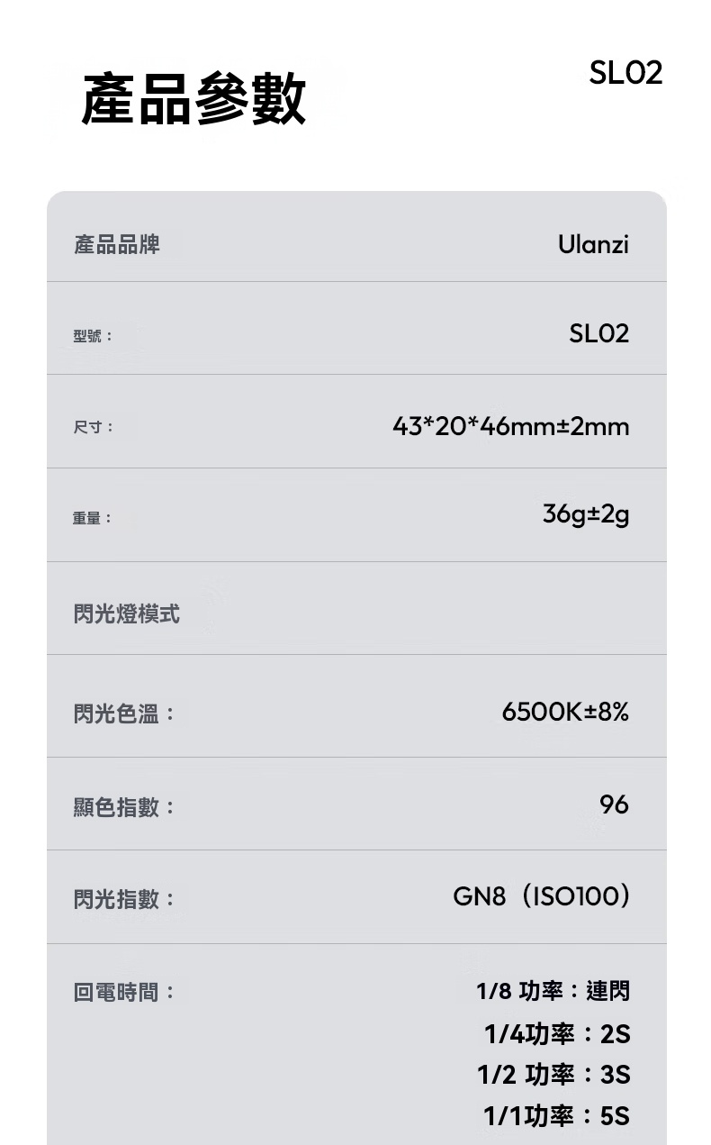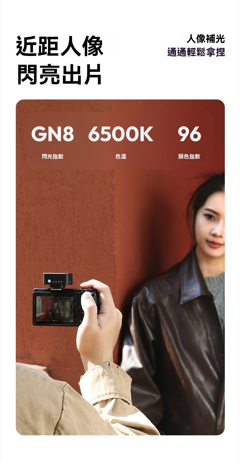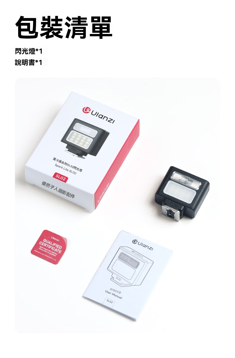 Ulanzi SL02螢火蟲閃光燈,是攝影愛好者的得力夥伴。它身形小巧,尺寸僅46×43×20mm,重量36g ,比耳機倉還小,輕鬆便攜,讓你隨時隨地補光拍攝。內建250mAh電池,Type-C介面約1小時就能充滿,滿電後最大功率可閃光375次,還能用行動電源隨時供電。閃光指數GN8,擁有4檔功率調節,可依據場景靈活切換。顯色指數達96,色溫6500K,能呈現自然、真實且細膩的光線效果,人像、靜物拍攝皆適用。它採用單點通用接點,與索尼、佳能、尼康等市面多數相機的熱靴接口適配,操作簡易,小白也能快速上手 。