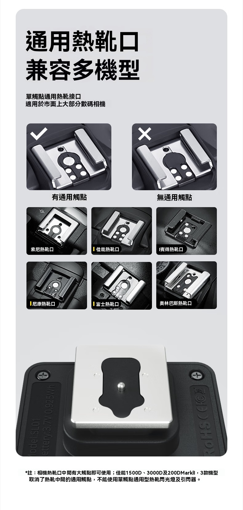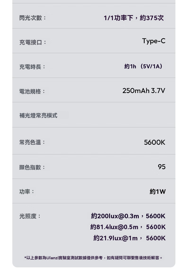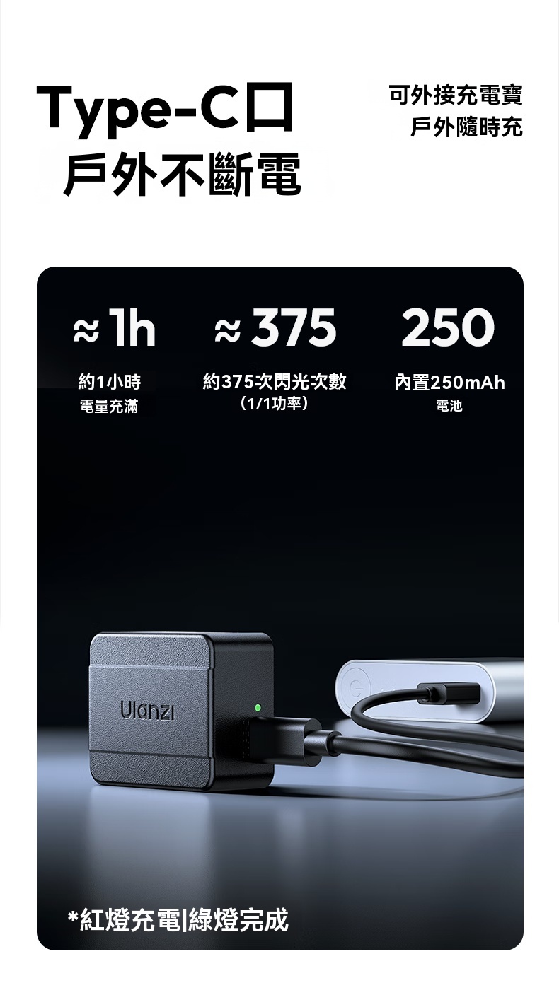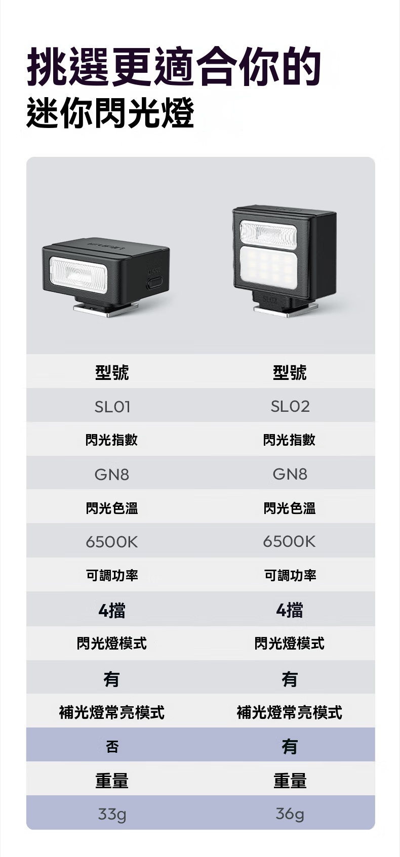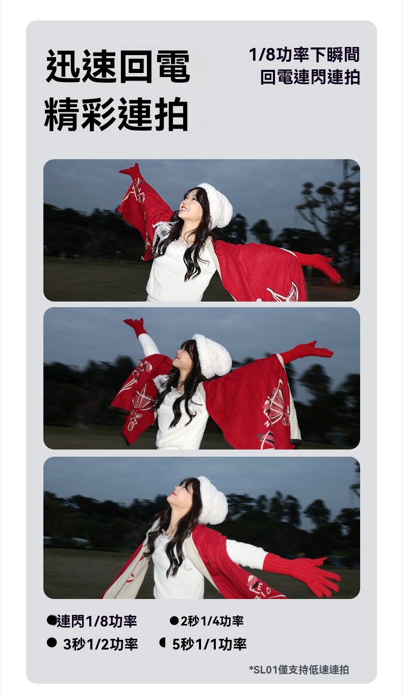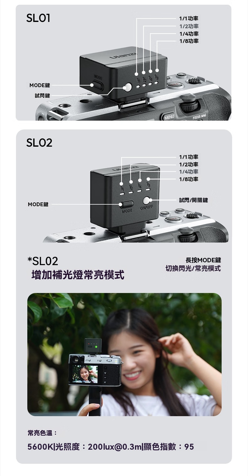 Ulanzi SL02螢火蟲閃光燈,是攝影愛好者的得力夥伴。它身形小巧,尺寸僅46×43×20mm,重量36g ,比耳機倉還小,輕鬆便攜,讓你隨時隨地補光拍攝。內建250mAh電池,Type-C介面約1小時就能充滿,滿電後最大功率可閃光375次,還能用行動電源隨時供電。閃光指數GN8,擁有4檔功率調節,可依據場景靈活切換。顯色指數達96,色溫6500K,能呈現自然、真實且細膩的光線效果,人像、靜物拍攝皆適用。它採用單點通用接點,與索尼、佳能、尼康等市面多數相機的熱靴接口適配,操作簡易,小白也能快速上手 。