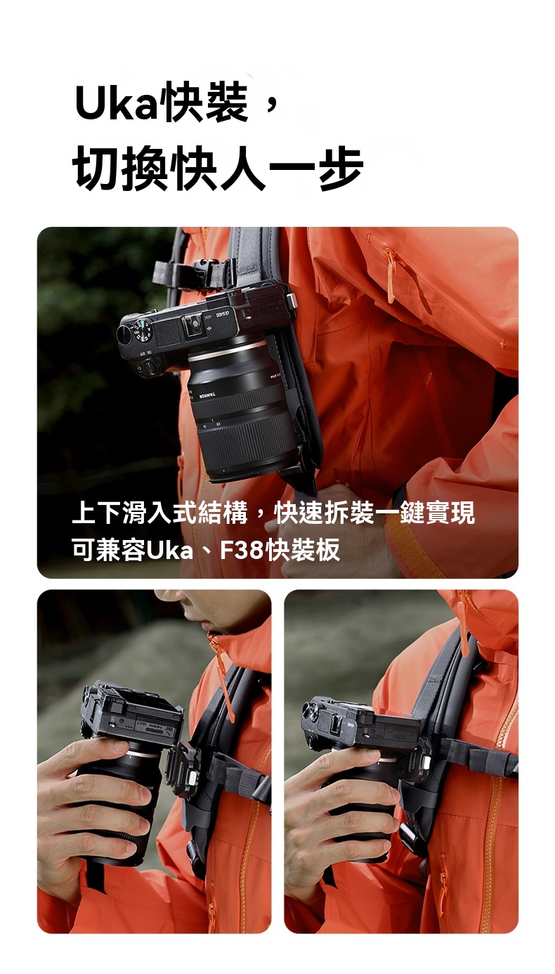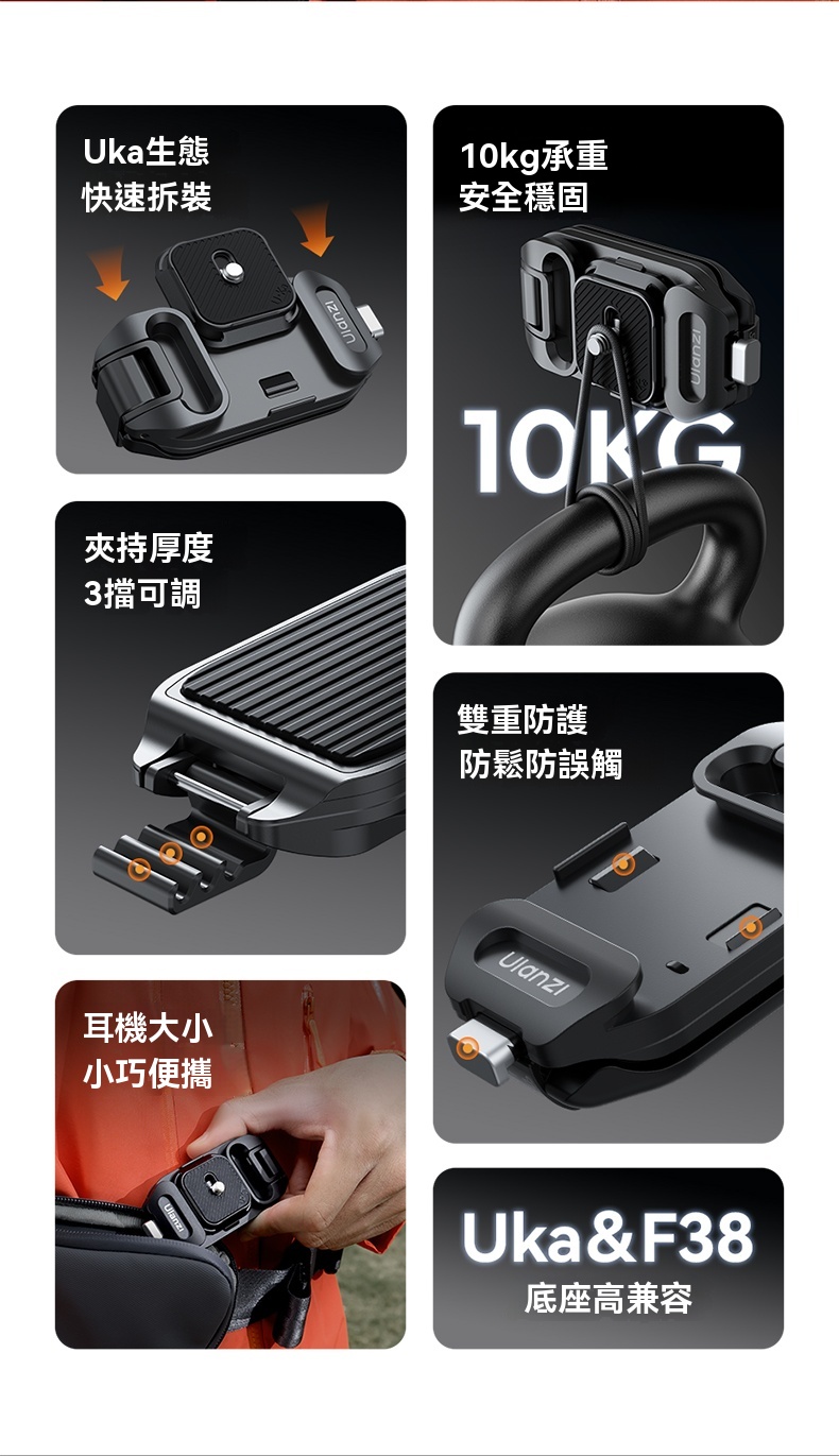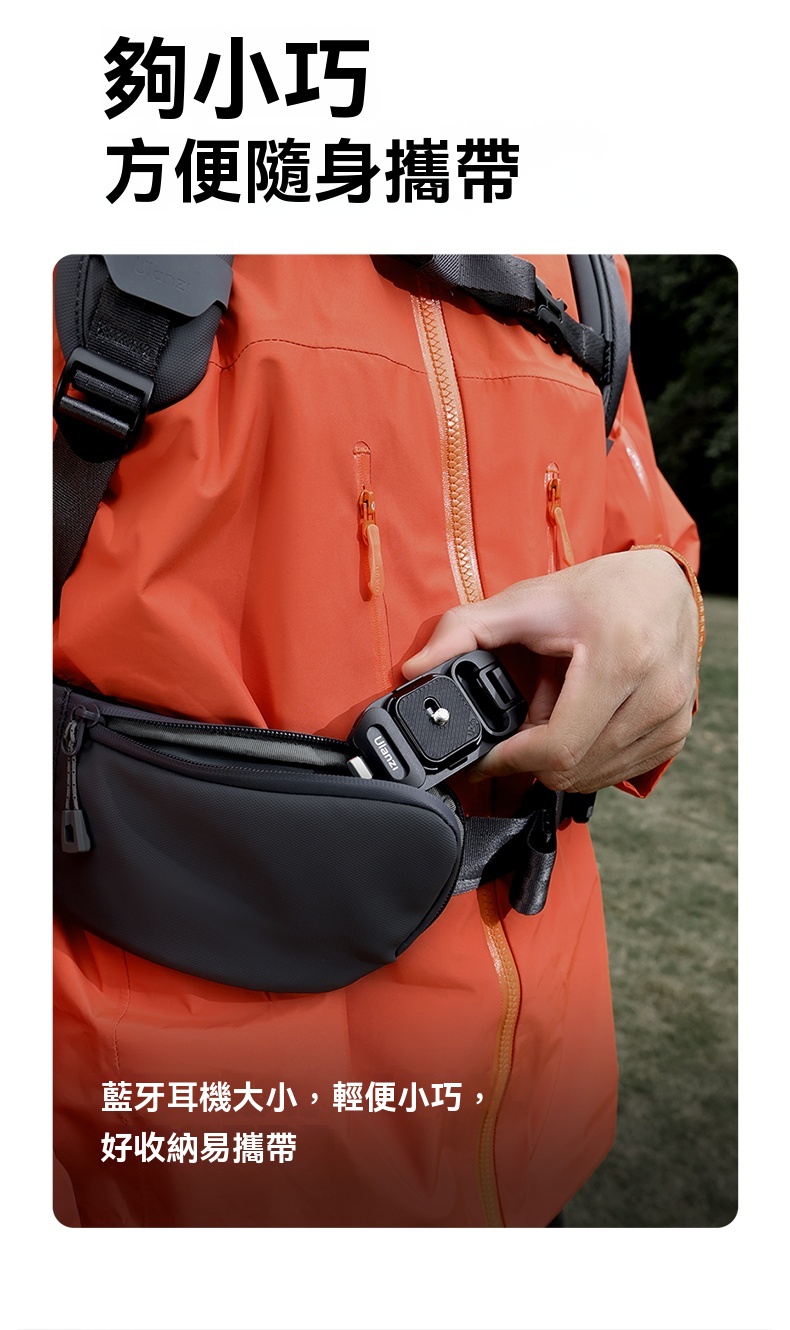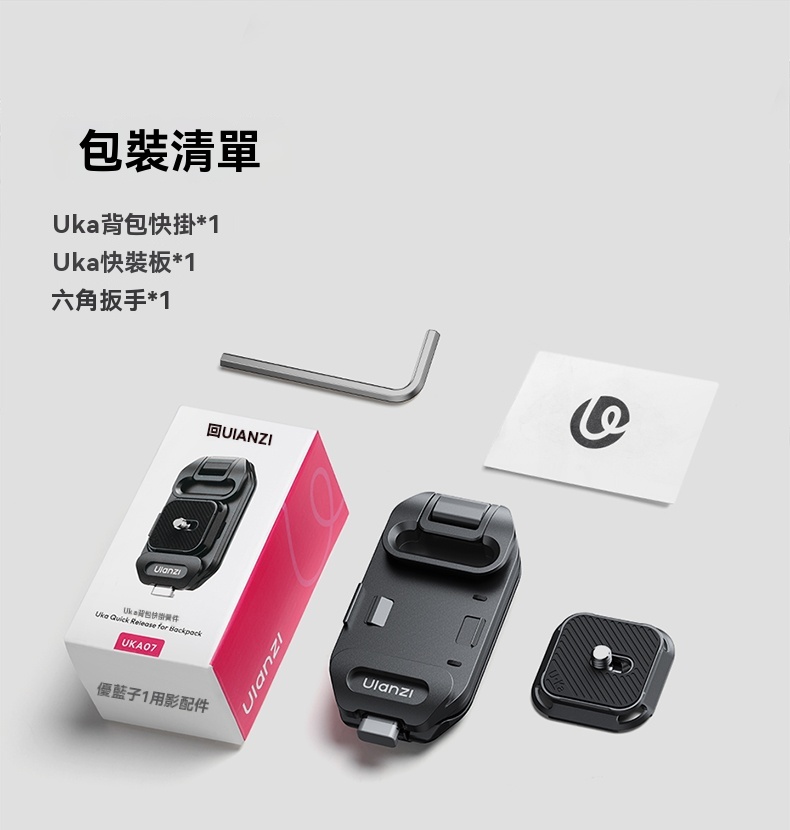 Ulanzi UKA07 背包快掛套件是一款專為戶外攝影愛好者設計的實用裝備。它採用CNC工藝製成,使用高強度鋁合金材質,重量僅94克,卻能承載高達10公斤的重量,兼具輕便與穩固特性。產品採用上下滑入式結構,實現快速拆裝,並可兼容Uka和F38快裝板,極大地提升了使用的靈活性。 UKA07提供多檔位調節功能,適配厚度10mm、寬度70mm範圍內的背帶,並配有防滑硅膠墊,確保設備穩固夾持而不損傷背帶。此外,雙卡扣設計搭配安全鍵,有效防止鬆脫和誤觸,進一步提升使用安全性。產品小巧便攜,大小類似藍牙耳機,方便隨身攜帶,適合各種戶外活動和旅行需求。 Ulanzi UKA07不僅是攝影愛好者的理想選擇,也是追求高效與便捷生活的最佳夥伴。其優異的性能和精巧的設計,讓每一次出行都更加輕鬆自如。