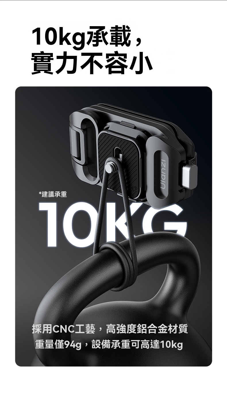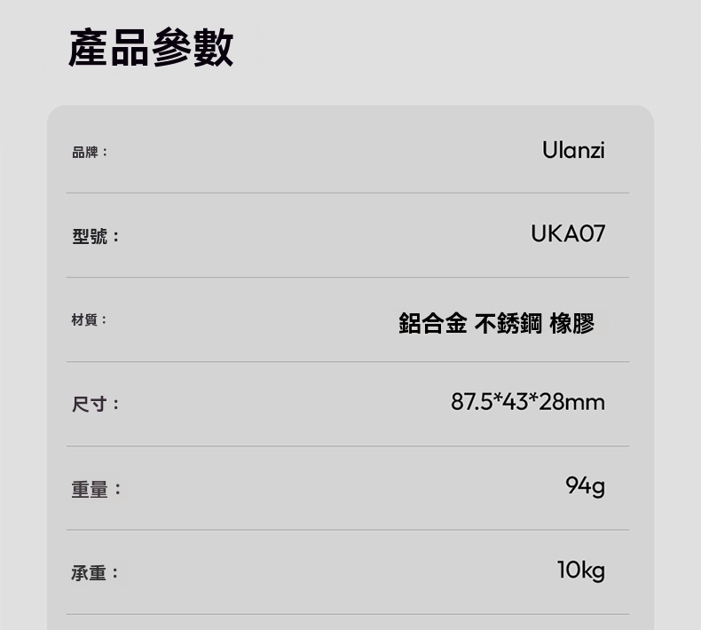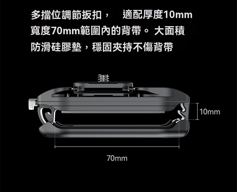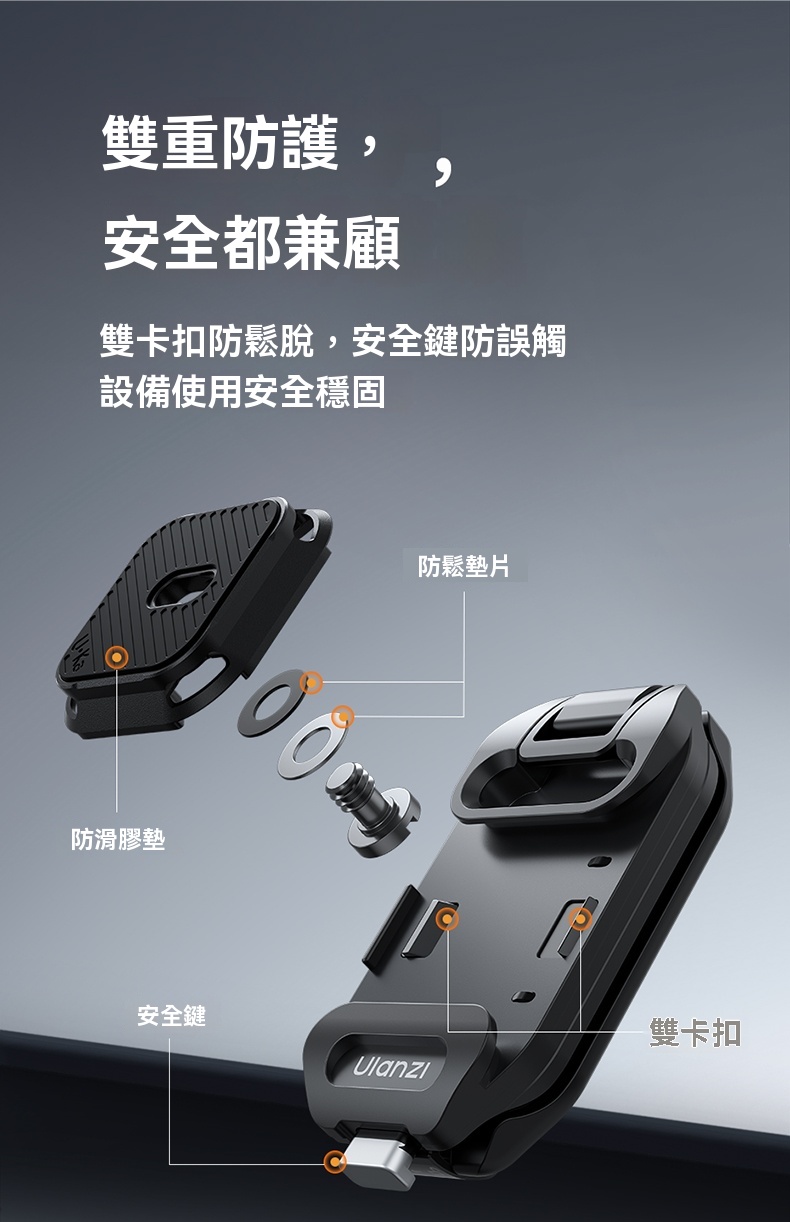 Ulanzi UKA07 背包快掛套件是一款專為戶外攝影愛好者設計的實用裝備。它採用CNC工藝製成,使用高強度鋁合金材質,重量僅94克,卻能承載高達10公斤的重量,兼具輕便與穩固特性。產品採用上下滑入式結構,實現快速拆裝,並可兼容Uka和F38快裝板,極大地提升了使用的靈活性。 UKA07提供多檔位調節功能,適配厚度10mm、寬度70mm範圍內的背帶,並配有防滑硅膠墊,確保設備穩固夾持而不損傷背帶。此外,雙卡扣設計搭配安全鍵,有效防止鬆脫和誤觸,進一步提升使用安全性。產品小巧便攜,大小類似藍牙耳機,方便隨身攜帶,適合各種戶外活動和旅行需求。 Ulanzi UKA07不僅是攝影愛好者的理想選擇,也是追求高效與便捷生活的最佳夥伴。其優異的性能和精巧的設計,讓每一次出行都更加輕鬆自如。