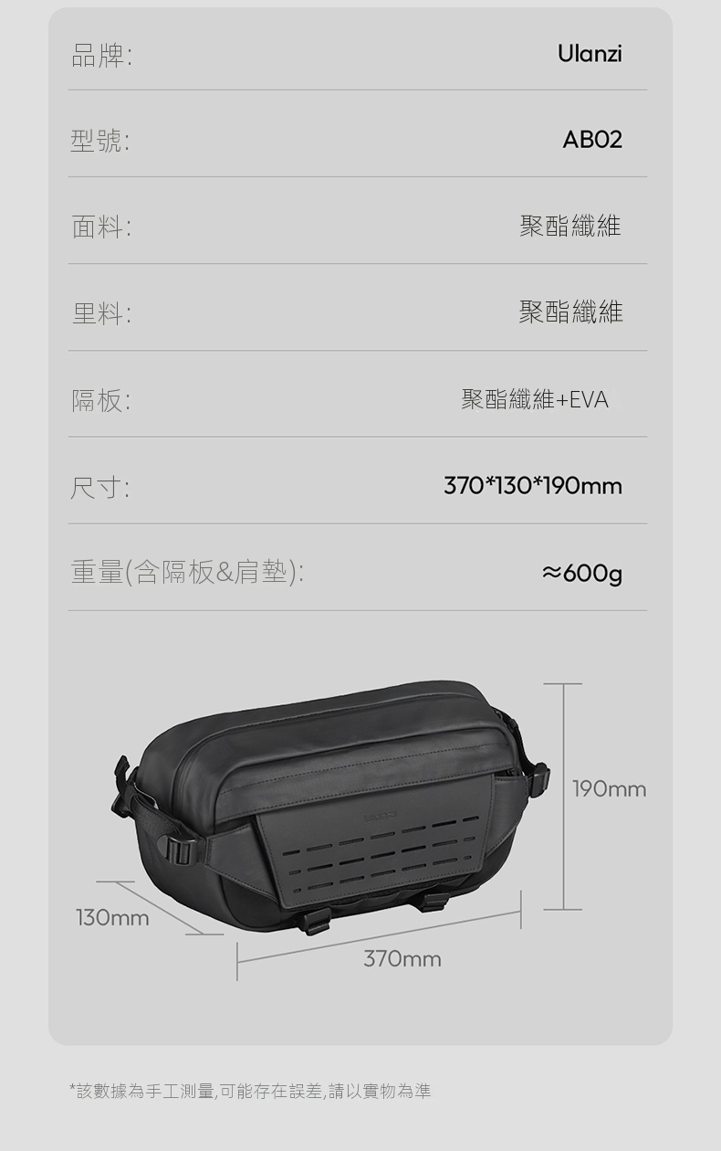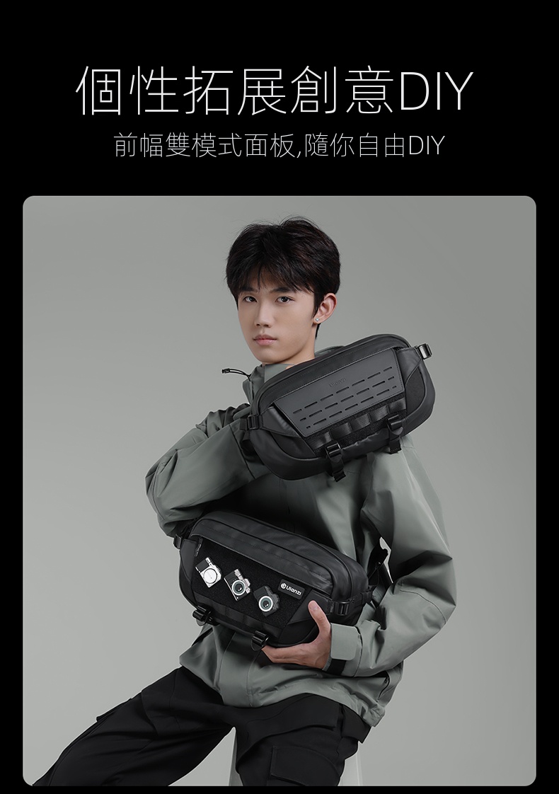Ulanzi AB02 戶外斜挎包是一款專為多種場景設計的多功能背包,容量達9L,輕便實用。無論是旅行、街拍還是通勤,都能滿足您的需求。包體採用聚酯纖維材質,耐用且防水,內部科學分區,可存放相機、鏡頭、平板電腦等設備,並設有隱藏式AirTag口袋和電池倉,方便整理與保護貴重物品。 此款斜挎包擁有MOLLE拓展板和魔术貼面板,支持DIY裝飾與擴展功能,讓您根據個人喜好進行定制。外部多處織帶和插袋設計,提供便捷的小物件存取體驗,同時底部織帶可外掛三腳架,提升實用性。此外,背部配有透氣網孔,肩墊可拆卸,確保長時間佩戴舒適無壓。 Ulanzi AB02 不僅注重功能性,更強調靈活性與個性化,適合追求品質與風格的現代人使用。