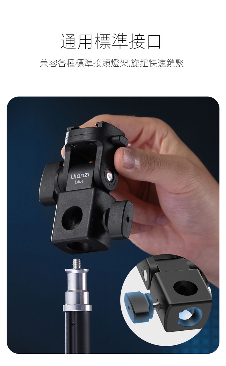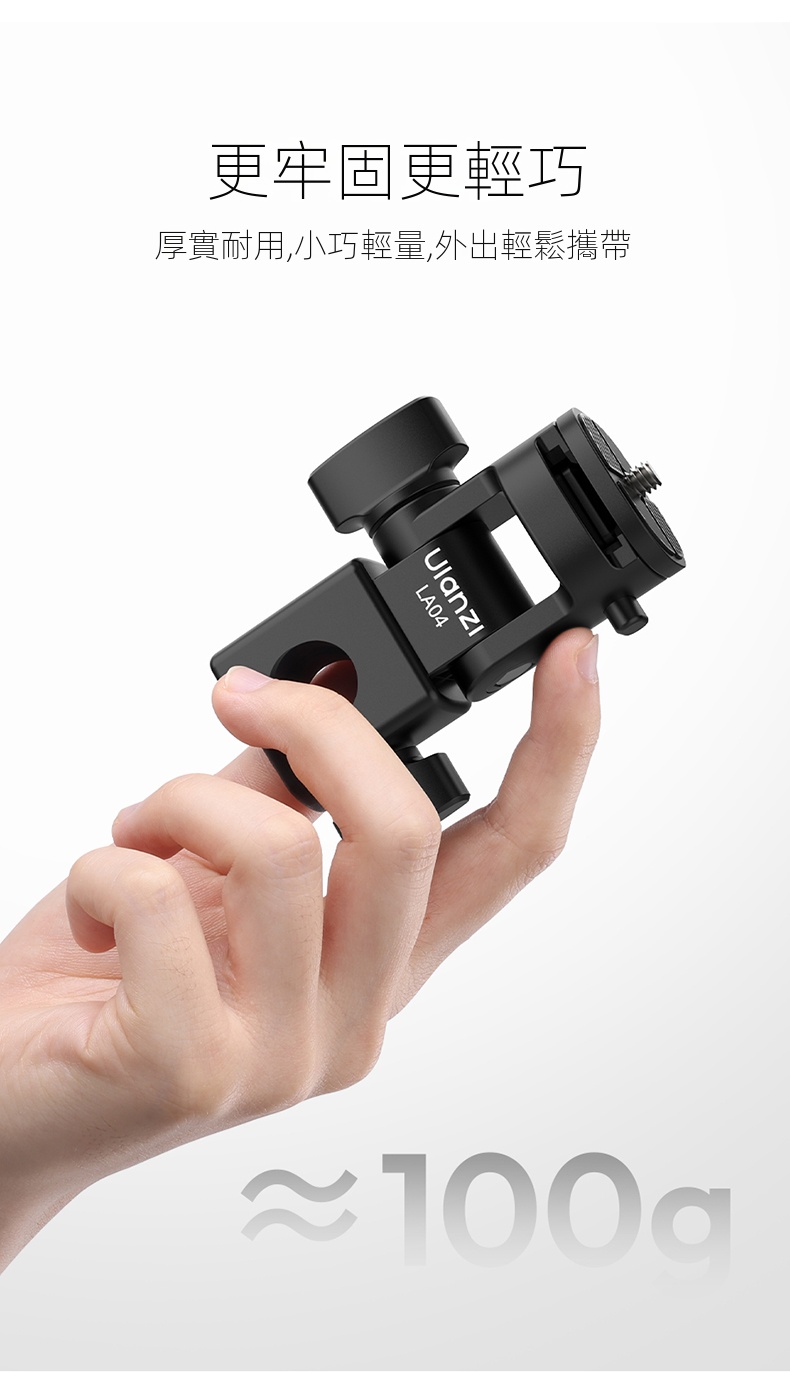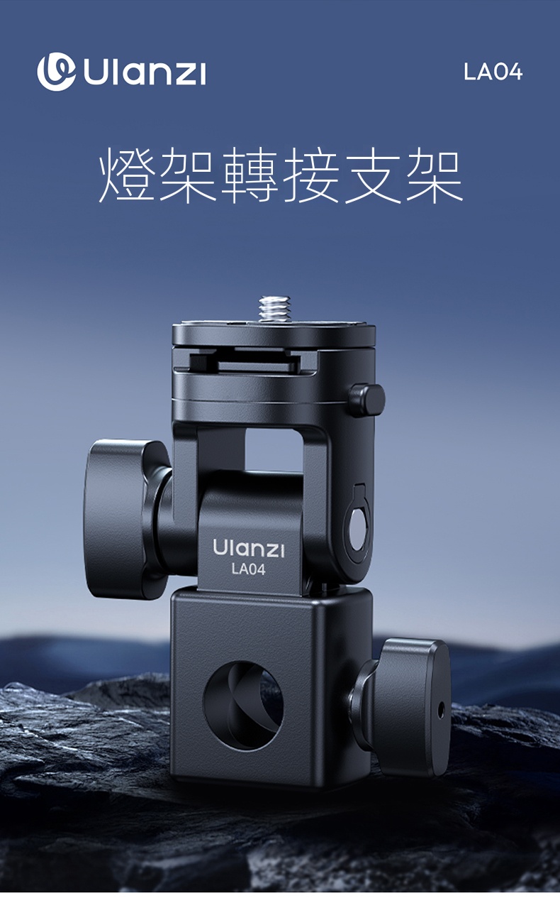 Ulanzi LA04燈架轉接支架,攝影愛好者的實用配件。它採用堅固耐用的鋁合金材質,重量輕盈卻能穩定承載多種攝影器材。其最大亮點是可多角度調節,垂直、水平方向都能輕鬆調整至理想位置,幫助你輕鬆獲得理想拍攝角度。支架配備標準熱靴接口,與市面上大多數熱靴閃光燈完美適配,廣泛應用於補光燈、閃光燈及其他攝影器材連接。安裝過程簡單快捷,複雜環境下也能確保設備穩固,讓畫面清晰穩定。無論是靜態照片拍攝,還是動態視訊錄製,它都是值得信賴的得力助手 。