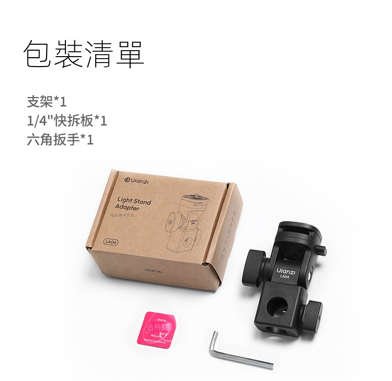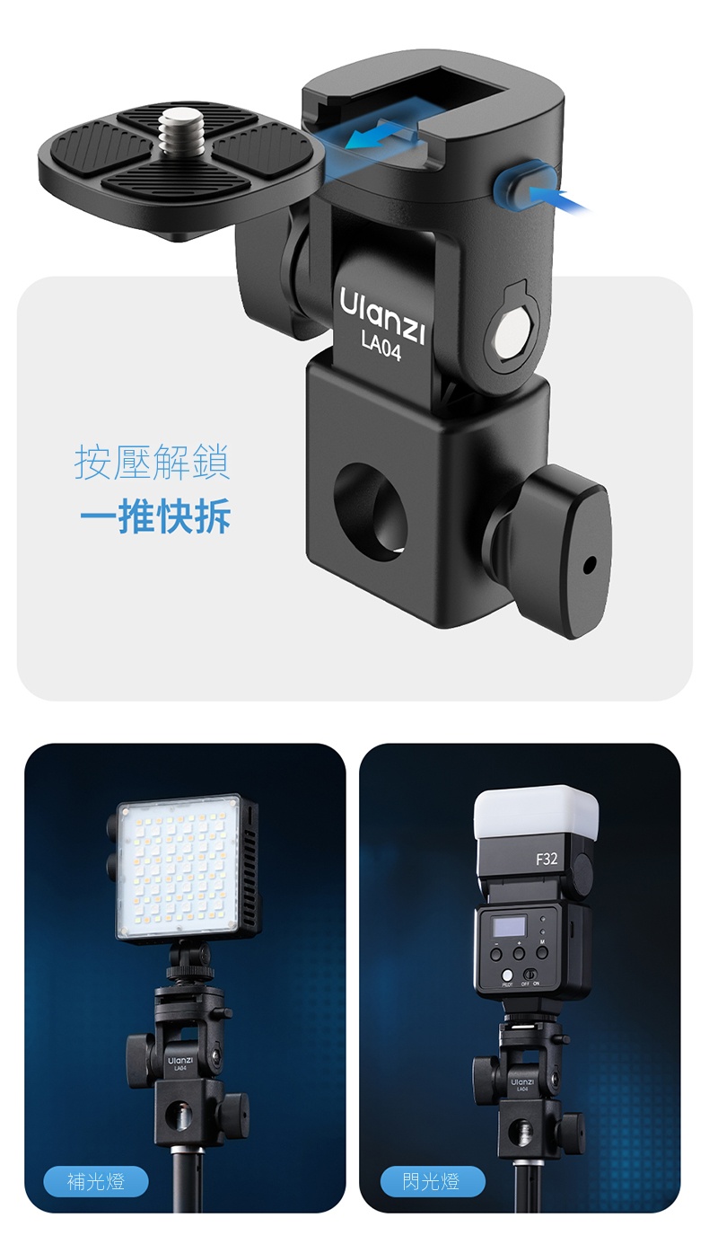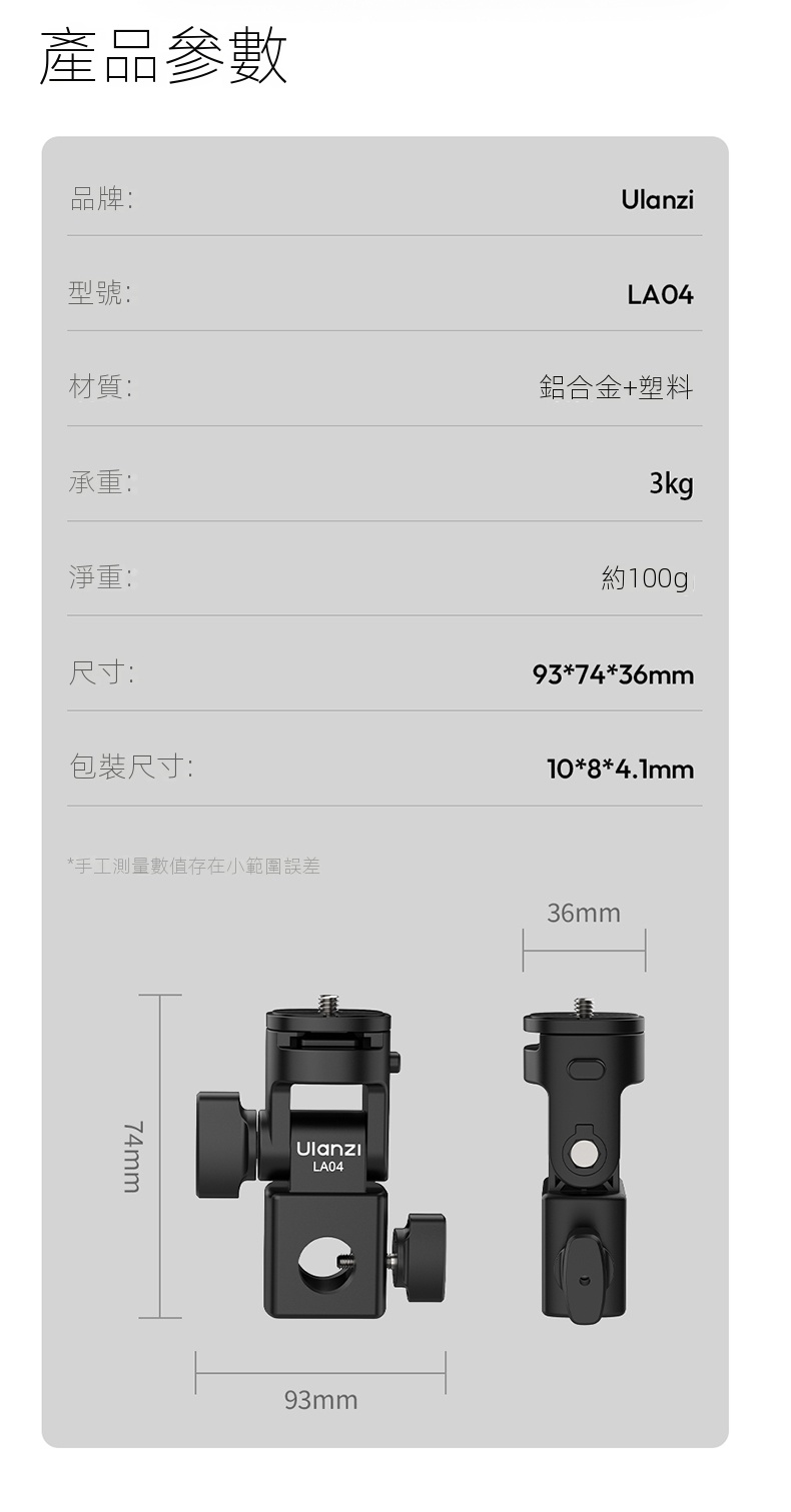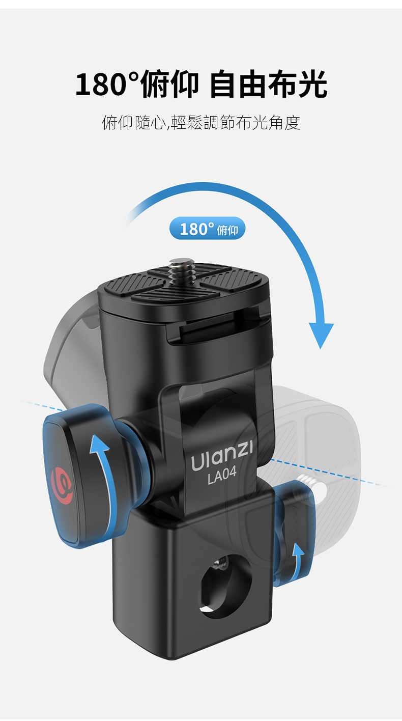 Ulanzi LA04燈架轉接支架,攝影愛好者的實用配件。它採用堅固耐用的鋁合金材質,重量輕盈卻能穩定承載多種攝影器材。其最大亮點是可多角度調節,垂直、水平方向都能輕鬆調整至理想位置,幫助你輕鬆獲得理想拍攝角度。支架配備標準熱靴接口,與市面上大多數熱靴閃光燈完美適配,廣泛應用於補光燈、閃光燈及其他攝影器材連接。安裝過程簡單快捷,複雜環境下也能確保設備穩固,讓畫面清晰穩定。無論是靜態照片拍攝,還是動態視訊錄製,它都是值得信賴的得力助手 。