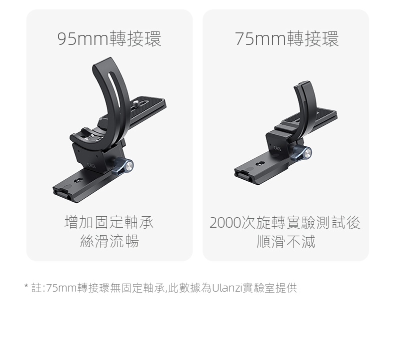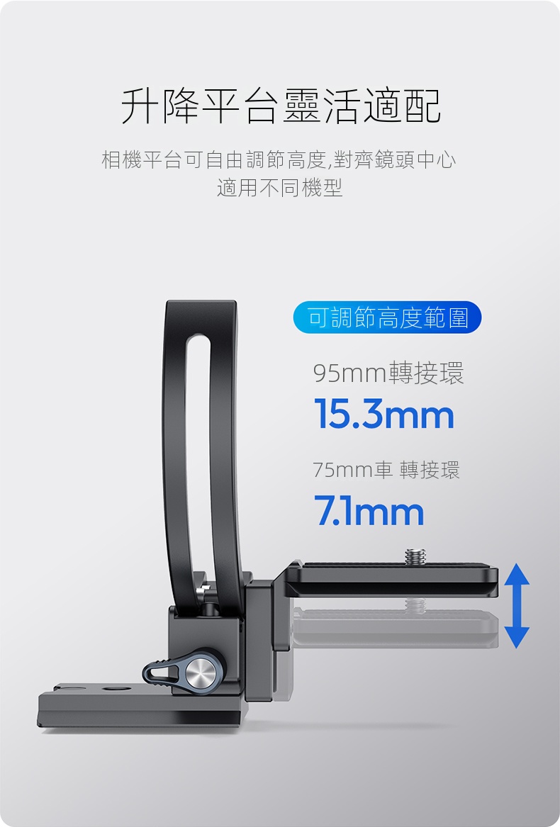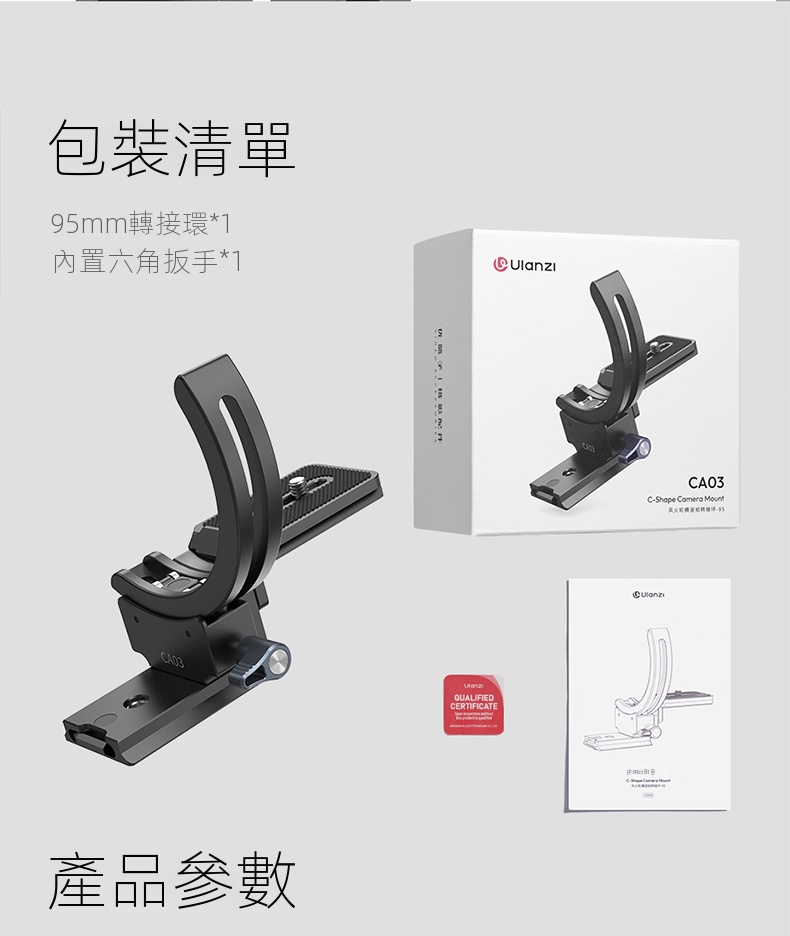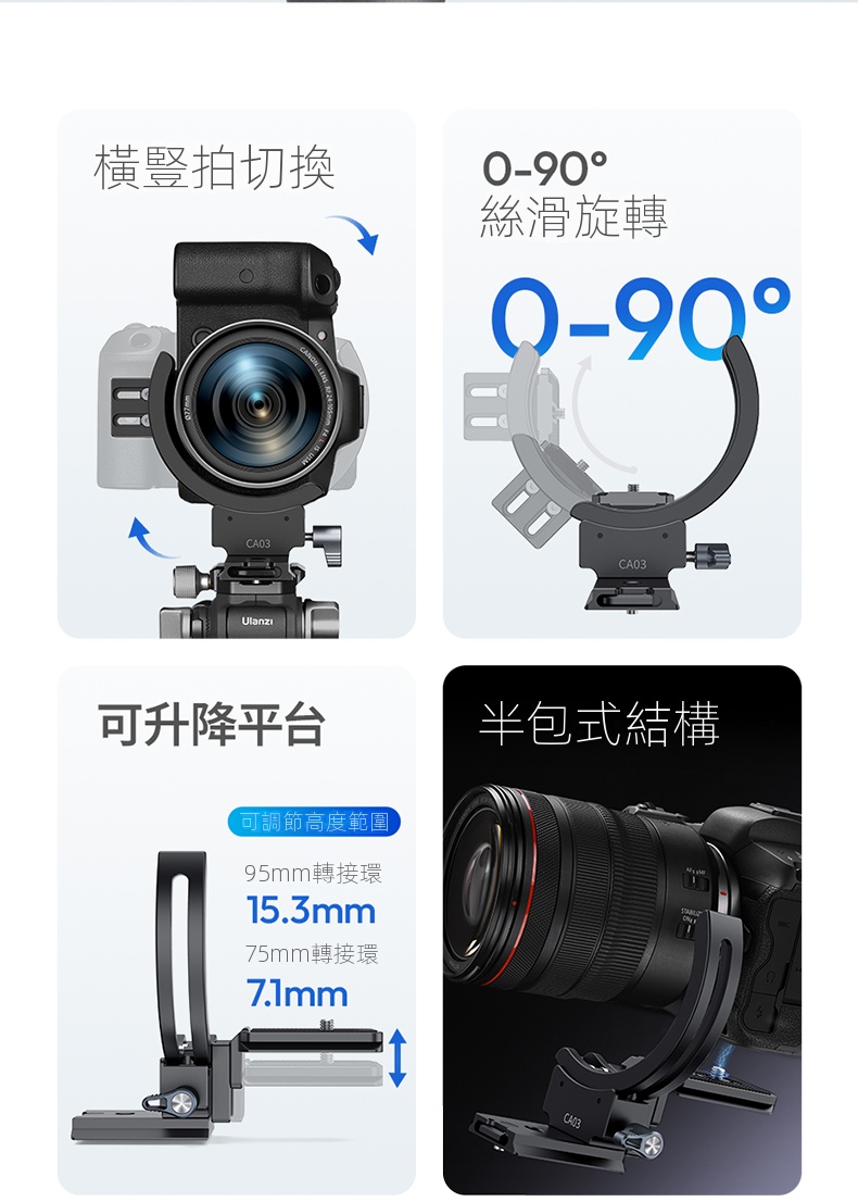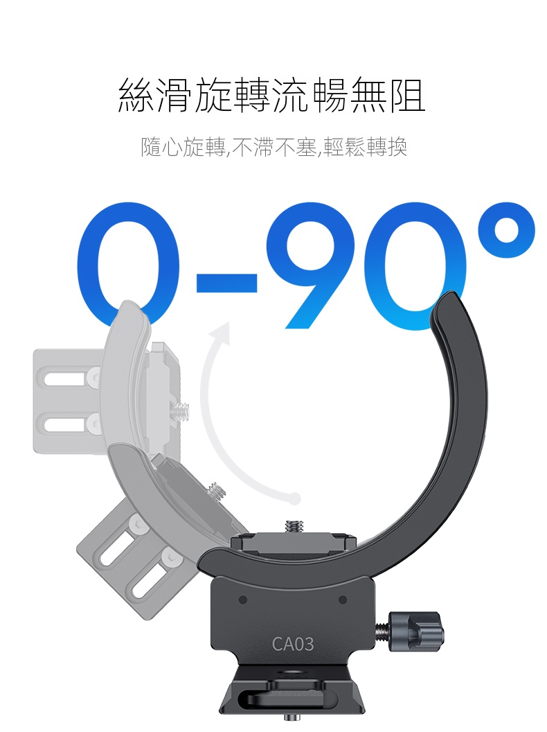 Ulanzi CA03風火輪二代單眼鏡頭轉接環,是攝影愛好者不可錯過的實用配件。它採用半包式結構設計,安裝時無需拆卸鏡頭,大大節省了時間與精力,還能相容於市面上大多數型號的相機鏡頭 。其具備橫豎拍快速切換功能,可在0-90°範圍絲滑旋轉,並能任意懸停,讓拍攝角度調整更自由。搭載的升降平台,可靈活適應不同場景。專業的防偏轉設計,確保鏡頭不位移,拍攝畫面穩定且清晰。材質上選用鋁合金,堅固耐用,最大負載可達2-5公斤。無論是日常記錄,或是專業創作,都能為你的拍攝助力。