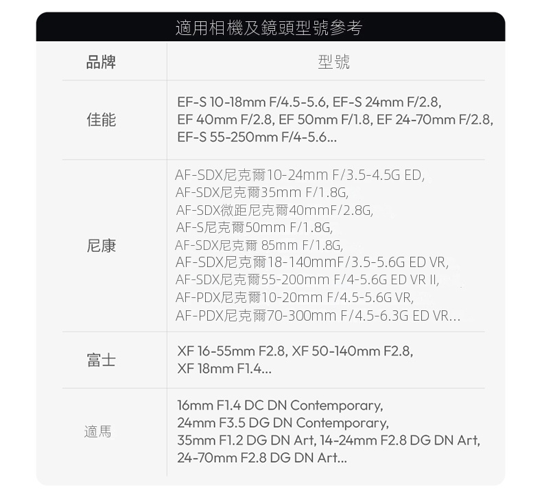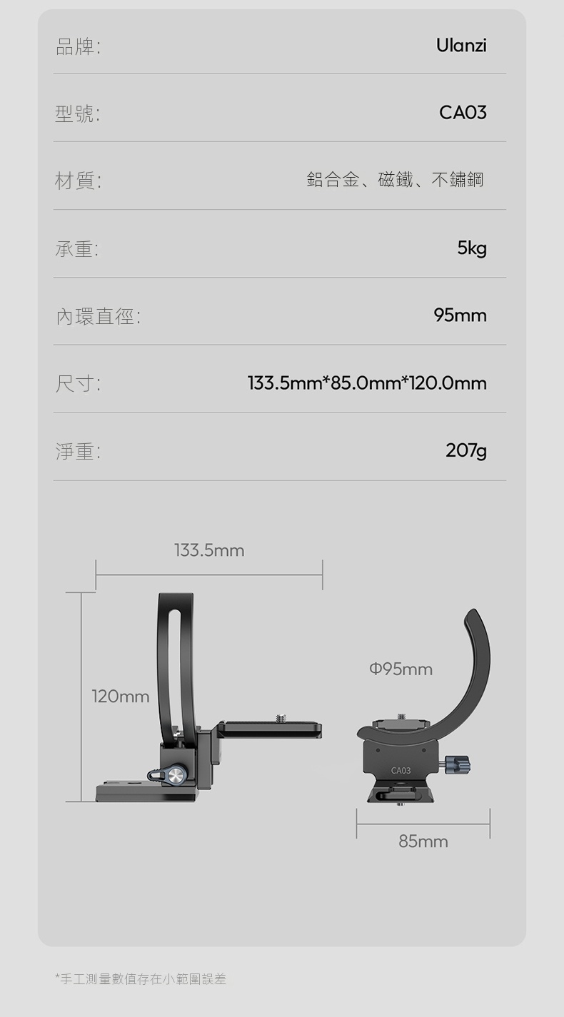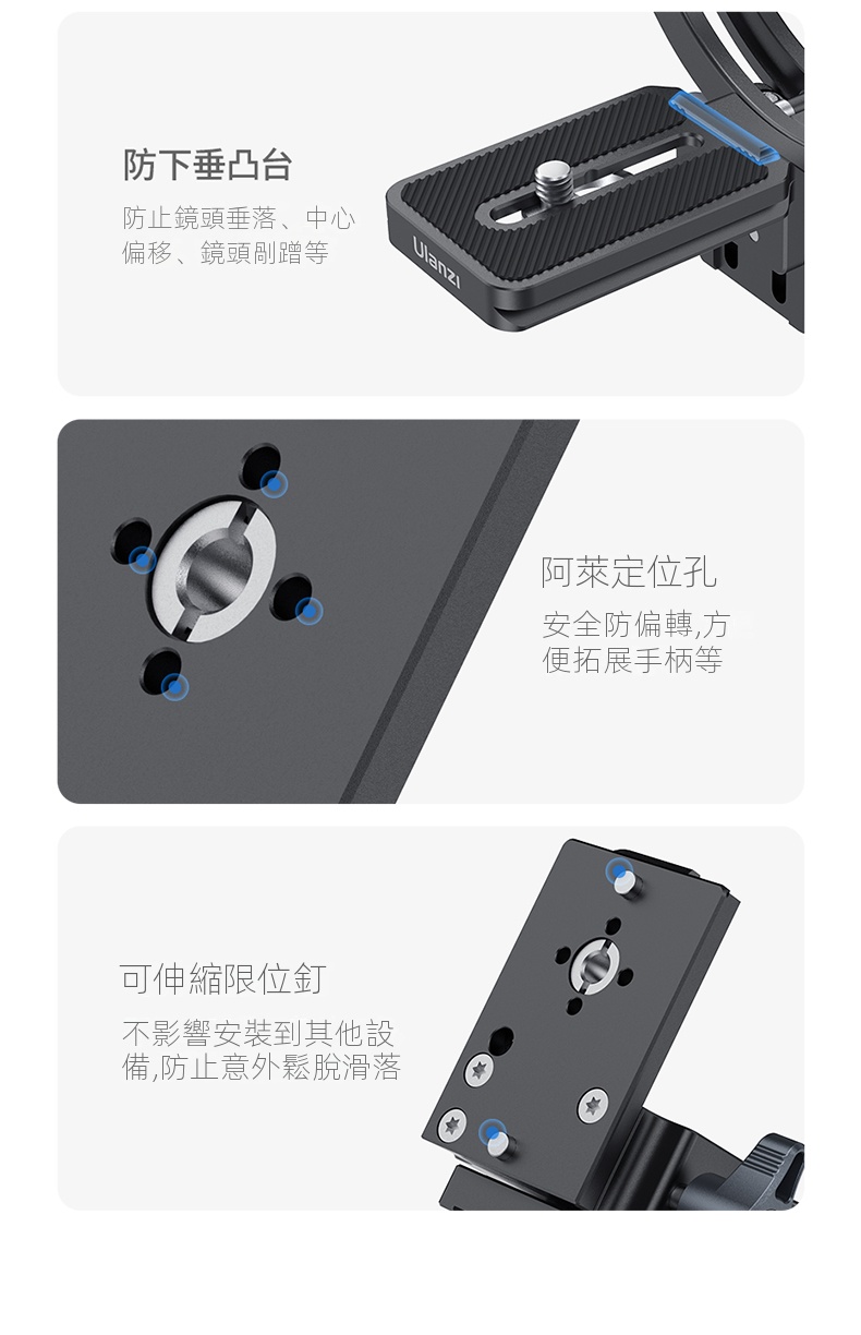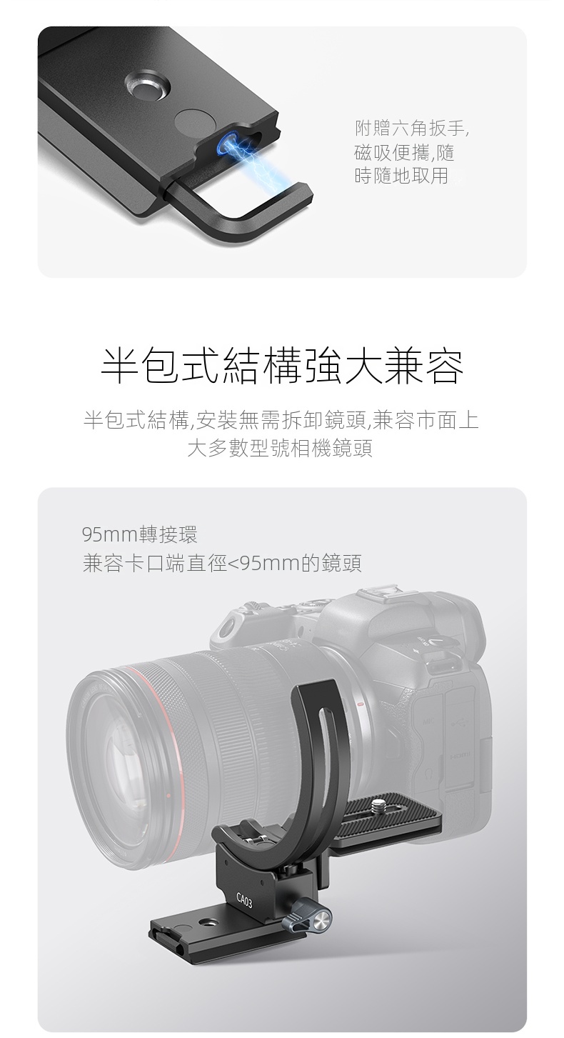 Ulanzi CA03風火輪二代單眼鏡頭轉接環,是攝影愛好者不可錯過的實用配件。它採用半包式結構設計,安裝時無需拆卸鏡頭,大大節省了時間與精力,還能相容於市面上大多數型號的相機鏡頭 。其具備橫豎拍快速切換功能,可在0-90°範圍絲滑旋轉,並能任意懸停,讓拍攝角度調整更自由。搭載的升降平台,可靈活適應不同場景。專業的防偏轉設計,確保鏡頭不位移,拍攝畫面穩定且清晰。材質上選用鋁合金,堅固耐用,最大負載可達2-5公斤。無論是日常記錄,或是專業創作,都能為你的拍攝助力。