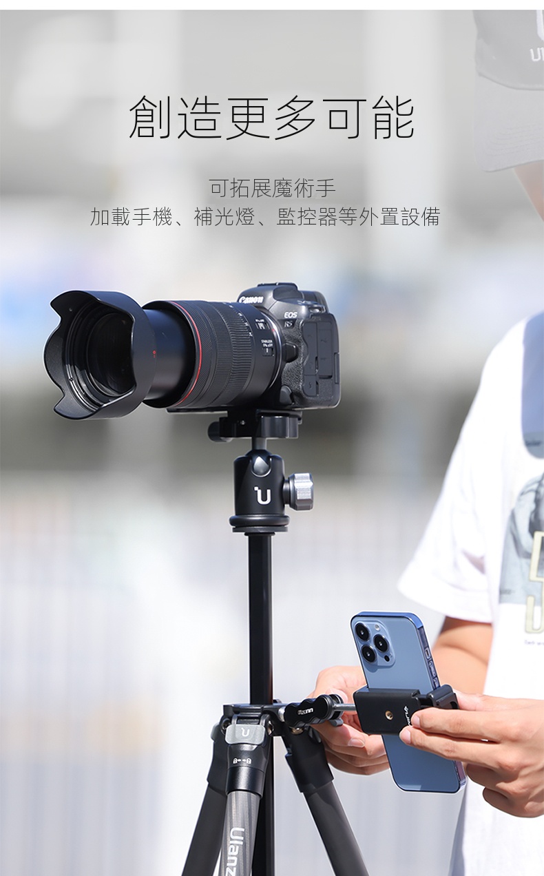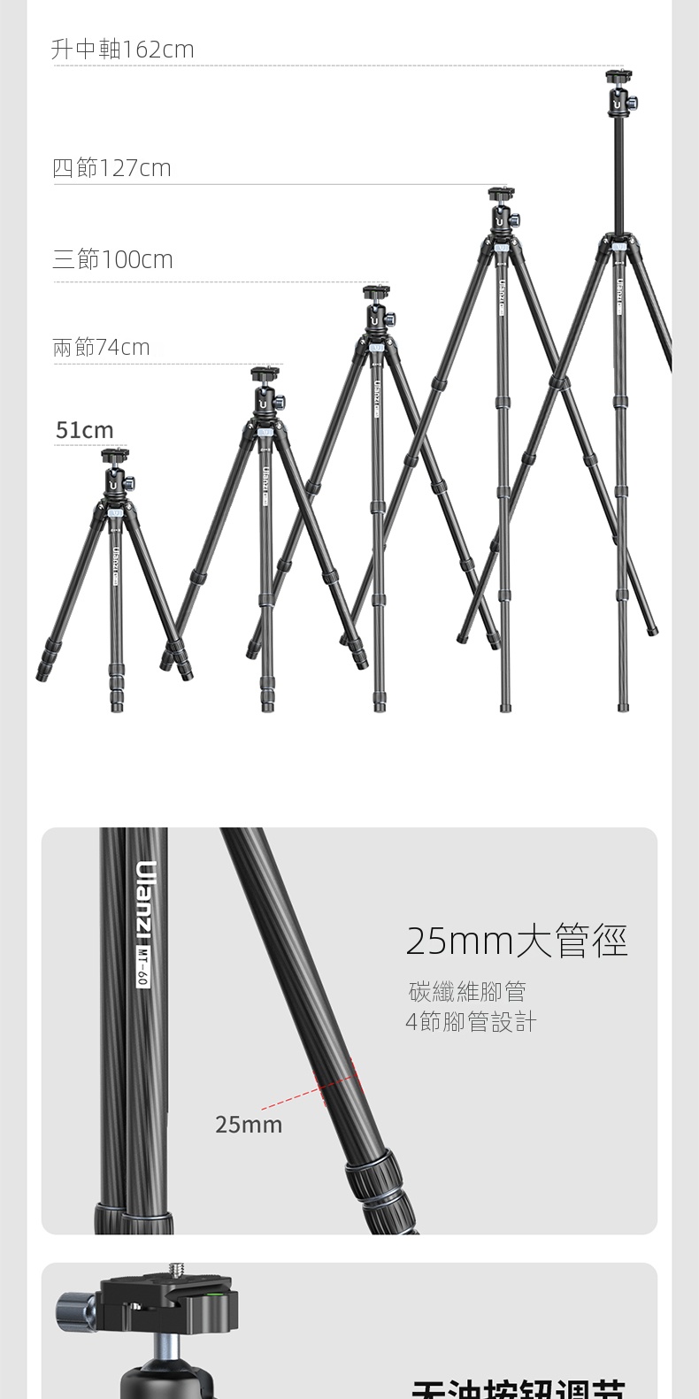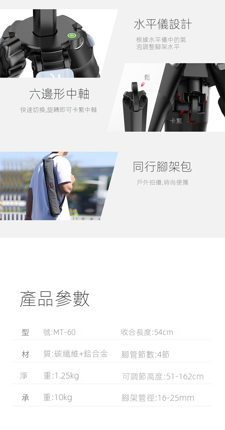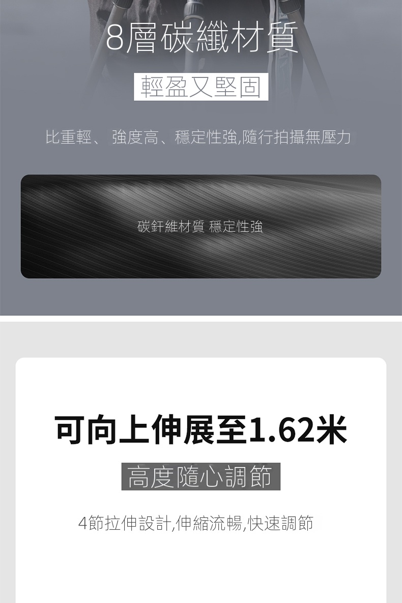 這款便攜式三腳架專為旅行設計,輕巧易攜帶,適合各種戶外攝影需求。採用8層碳纖維材質,兼具輕盈與堅固,最高可伸展至1.62米,高度隨心調節,滿足不同拍攝角度的需求。中軸倒置設計,無需工具即可實現低角度拍攝,靈活多變。 三腳架擁有獨腳架模式,方便登山出行時使用,快速拆卸和組裝讓轉換更便捷。360°全景刻度設計,搭配獨立鎖緊旋鈕,確保全景拍攝的精準性。全金屬三叉結構,穩定性極佳,承重達10kg,耐用可靠。 此外,產品配備拓展螺口,可連接手機、補光燈等外設,擴展更多應用可能。六邊形中軸設計,調整快速且牢固。附贈同行腳架包,方便攜帶,整體重量僅1.25kg,收合後長度僅54cm,極具便攜性。无论是專業攝影師還是愛好者,這款三腳架都是理想的選擇。