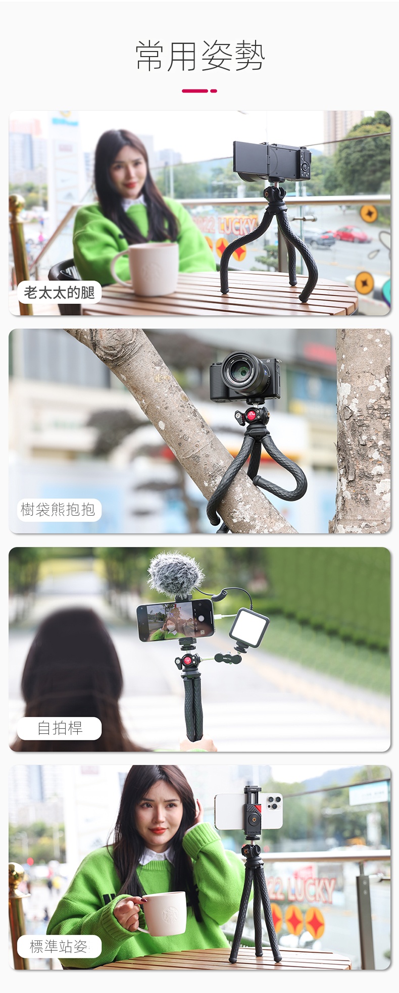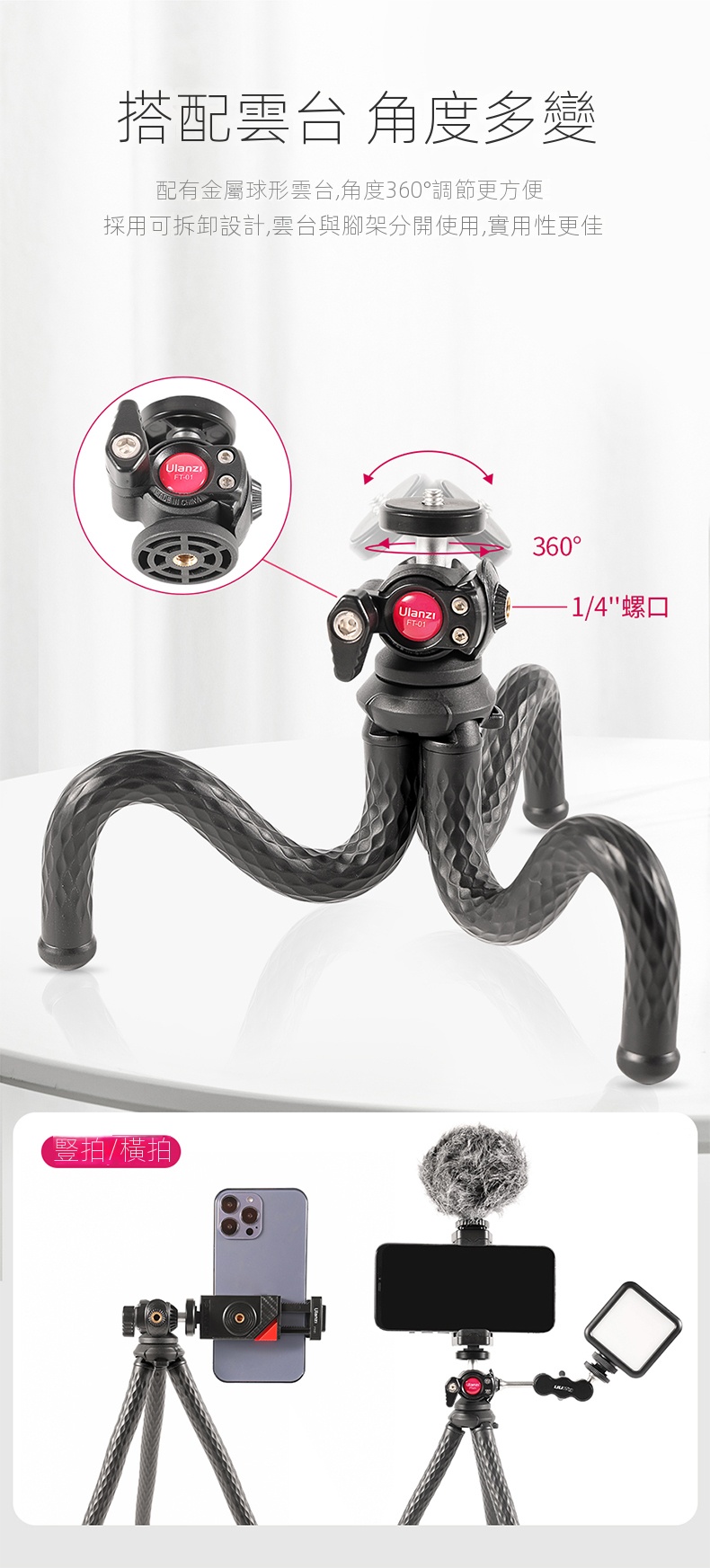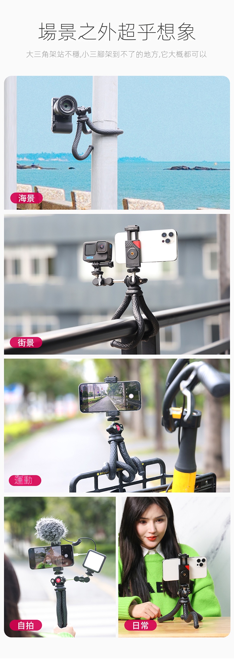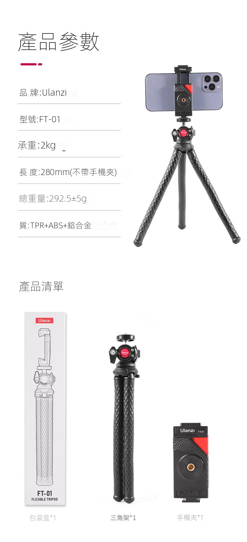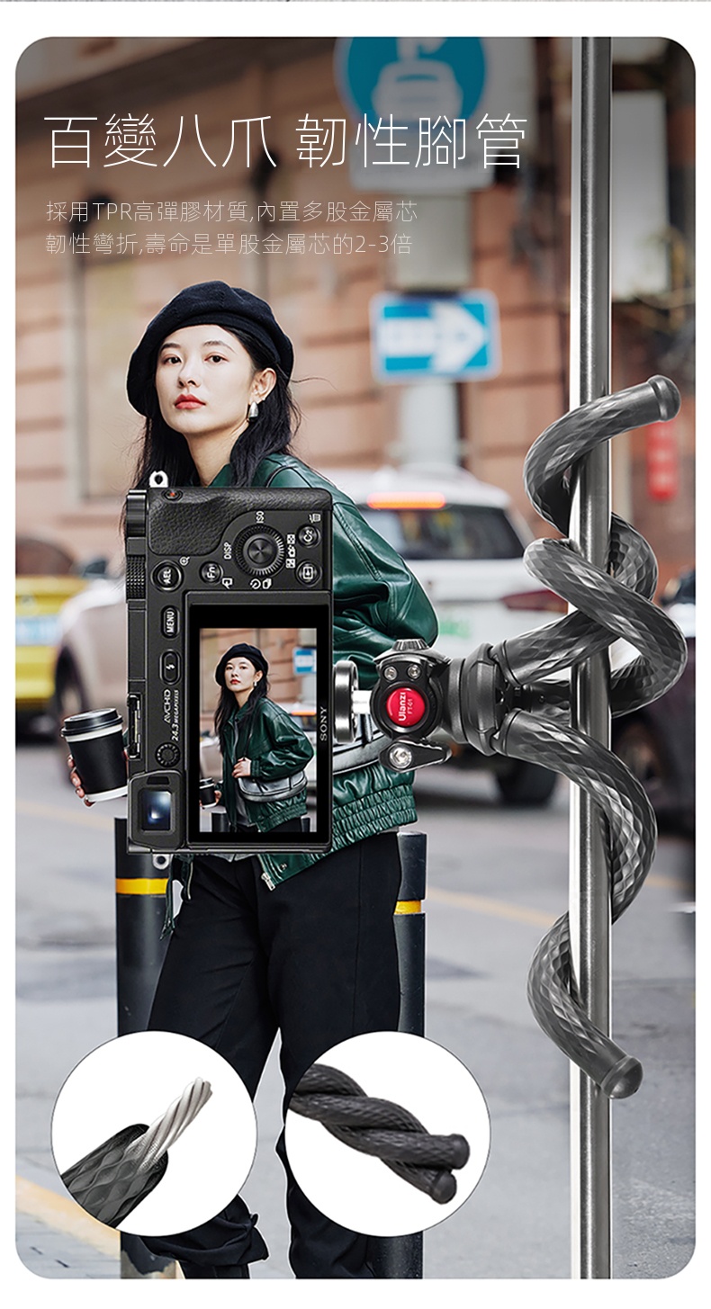 Ulanzi U-Select FT-01八爪魚含雲台三腳架,是攝影愛好者的得力助手。其腳架採用TPR高彈膠材質,內建多股金屬芯,可隨意彎折,輕鬆纏繞在樹枝、欄桿等物件上,適應多元複雜拍攝場景。全長28cm,重僅254g,攜帶無負擔。搭配金屬球形雲台,支援360°角度調節,滿足不同構圖需求。自備手機夾,一按即開,單向鋸齒設計確保夾持穩固。雖小巧,但承重可達2kg,相機、手機等設備皆能穩定支撐,助你隨時隨地捕捉精彩瞬間 。