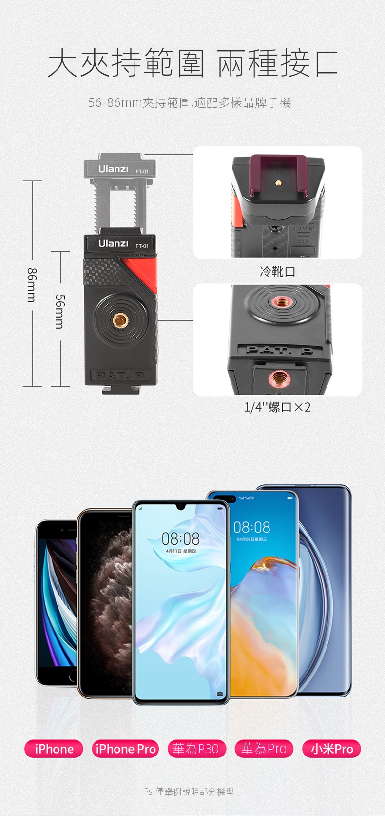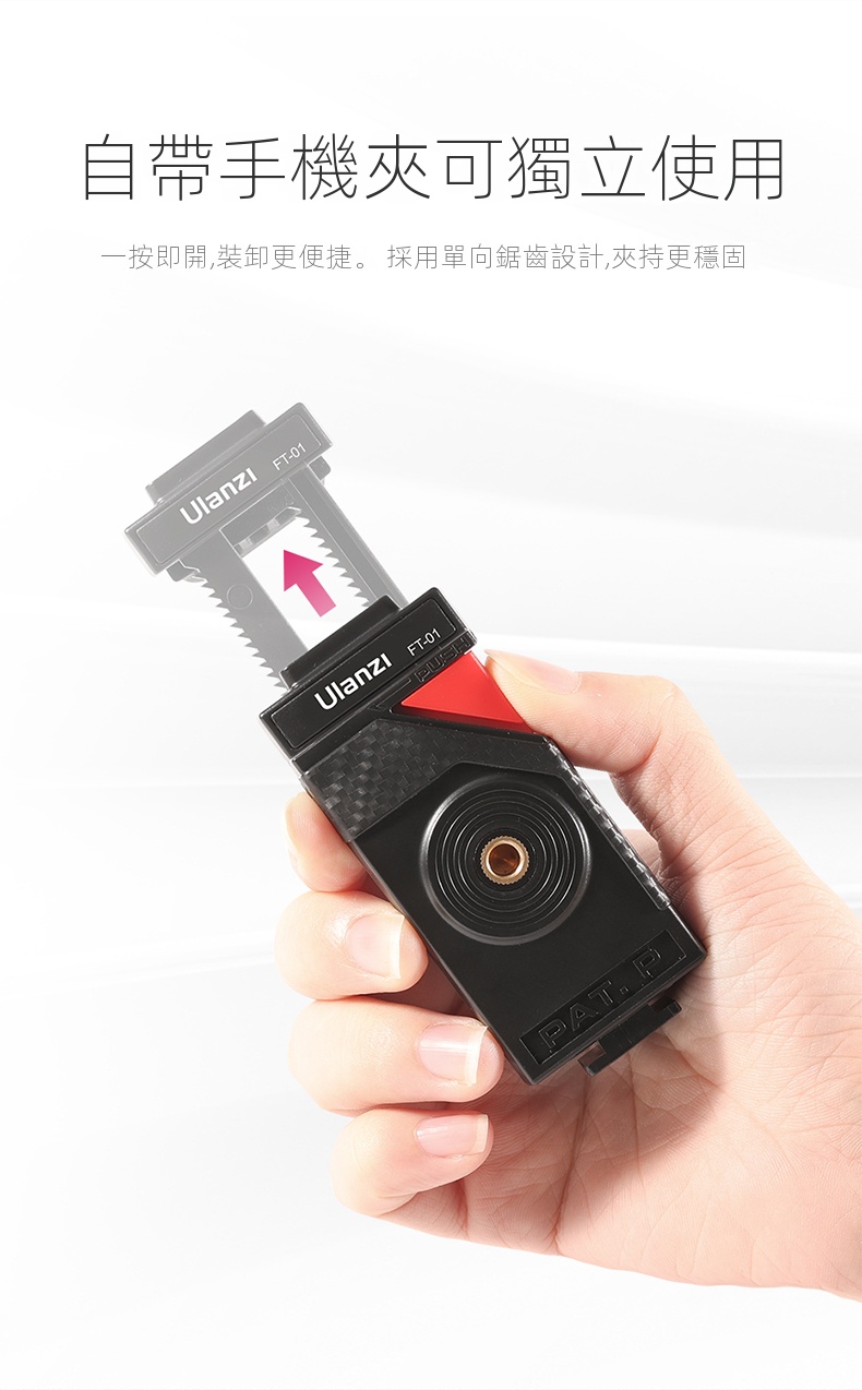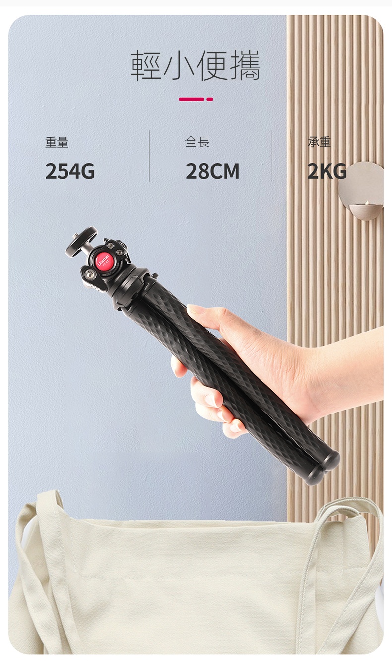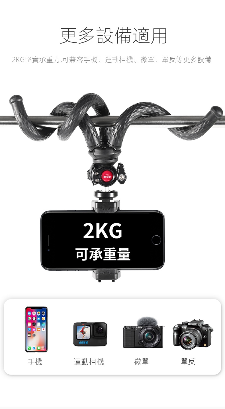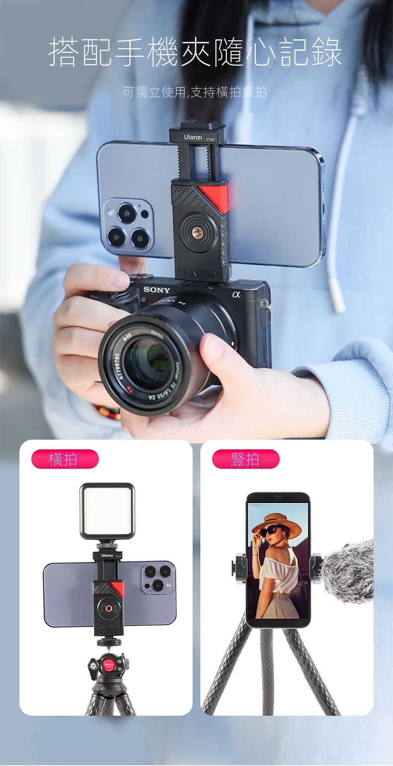 Ulanzi U-Select FT-01八爪魚含雲台三腳架,是攝影愛好者的得力助手。其腳架採用TPR高彈膠材質,內建多股金屬芯,可隨意彎折,輕鬆纏繞在樹枝、欄桿等物件上,適應多元複雜拍攝場景。全長28cm,重僅254g,攜帶無負擔。搭配金屬球形雲台,支援360°角度調節,滿足不同構圖需求。自備手機夾,一按即開,單向鋸齒設計確保夾持穩固。雖小巧,但承重可達2kg,相機、手機等設備皆能穩定支撐,助你隨時隨地捕捉精彩瞬間 。