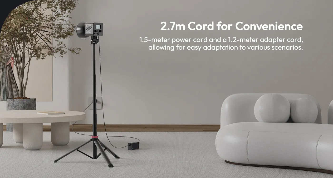 • 長距供電:電源線總長2.7米,包括1.5米電源線與1.2米轉接器線,可靈活佈線,突破空間限制,適用於不同拍攝場地。