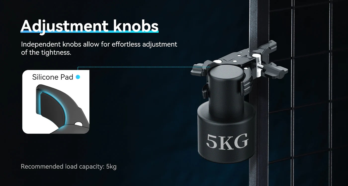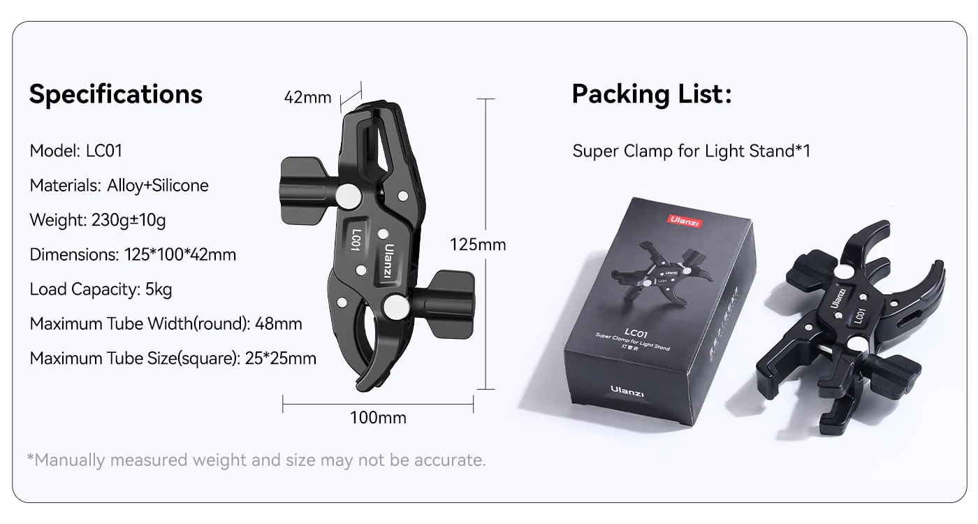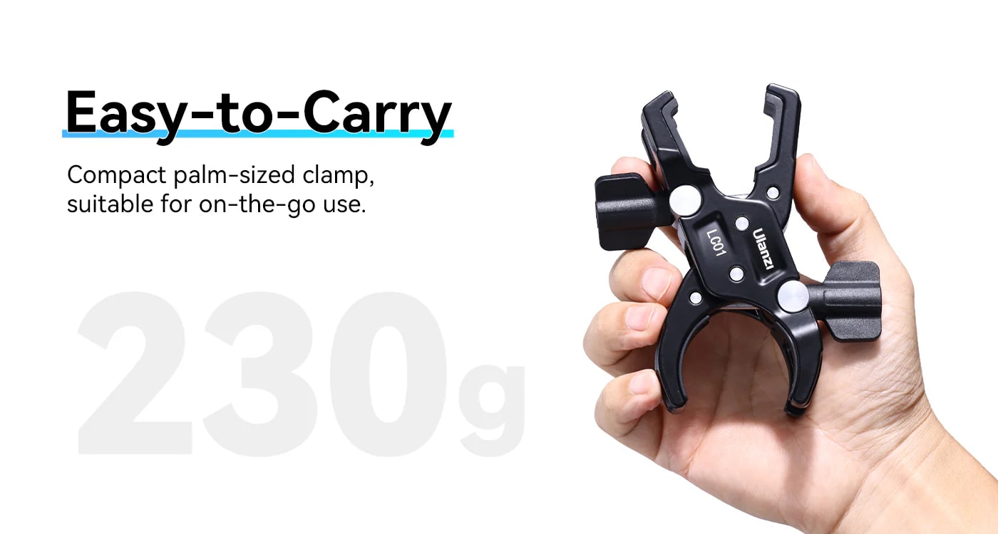 Ulanzi LC01方園雙頭管夾,攝影及錄影創作的得力助手。它採用鋁合金材質打造,堅固耐用,無懼戶外複雜環境。獨特雙夾設計,一側可夾持直徑達48mm的圓管,另一側能穩固夾住25x25mm的方管,適應多種設備安裝需求。內置矽膠墊,不僅增加摩擦力,確保設備安裝後不易晃動,還能防止刮傷管道。管夾支援360°水平旋轉,方便靈活調整設備角度。最大負載可達5kg,足以應付各類補光燈、小型攝影機等設備。其小巧輕便,重約230g,方便攜帶,為你的創作之旅減負。