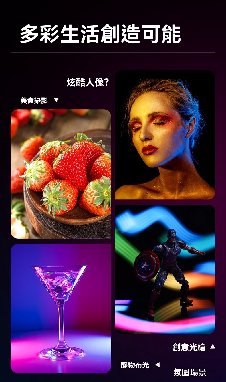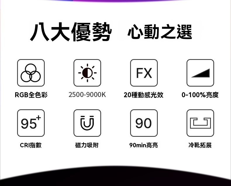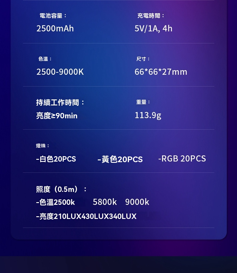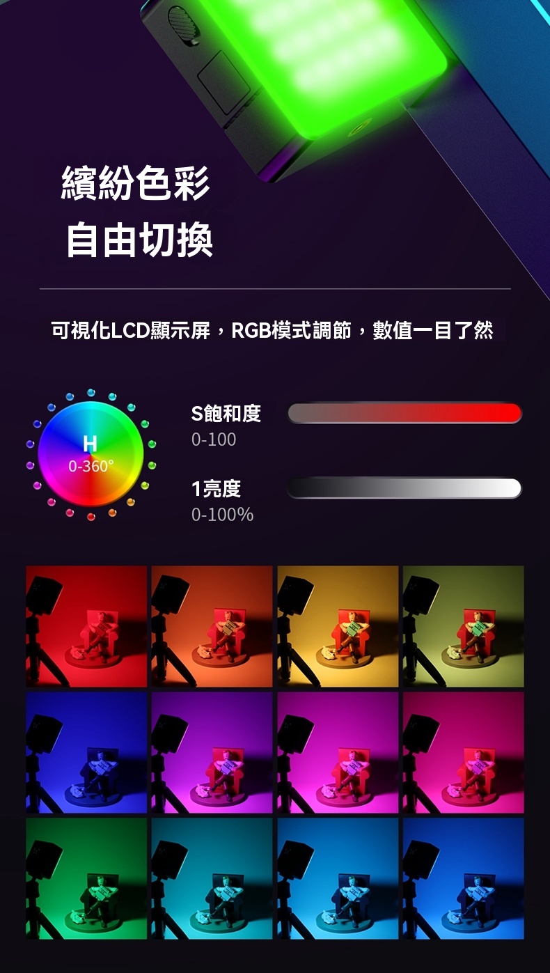 • RGB全色彩調節,提供豐富的色溫選擇(2500K-9000K)。
