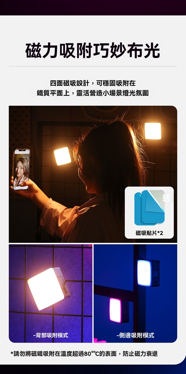 • 四面磁吸設計,可靈活吸附於鐵質平面,佈光更便捷。