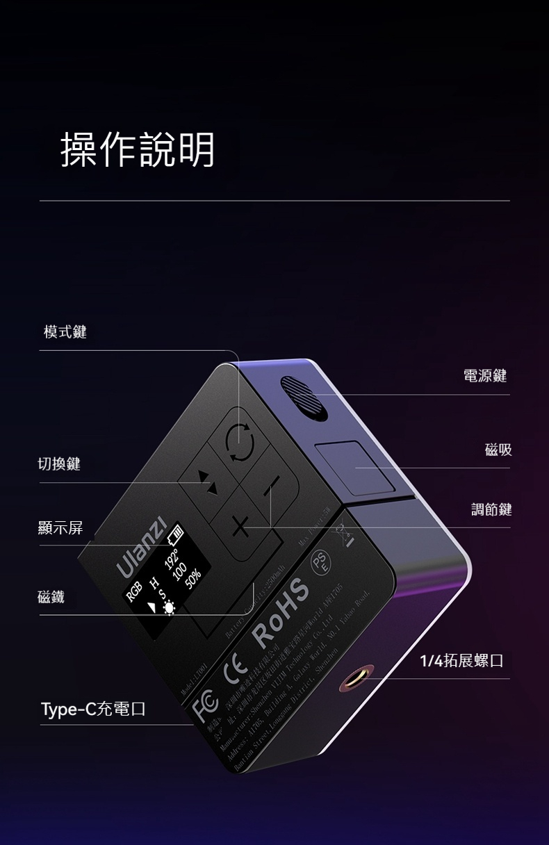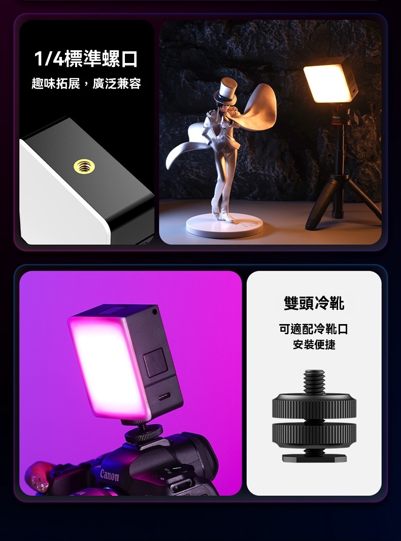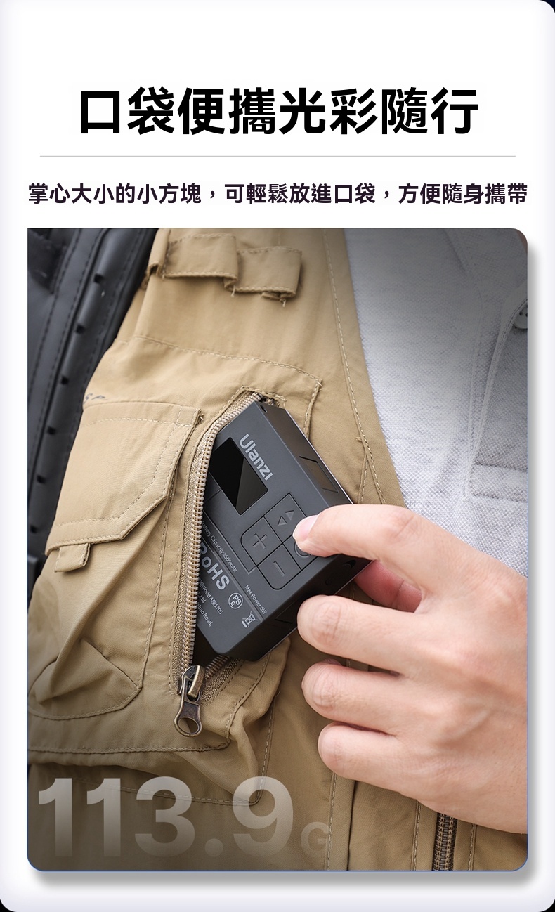 Ulanzi  VL49RGB PRO 補光燈,是攝影愛好者與影片創作者的得力助手。它小巧便攜,輕鬆塞入口袋,隨時隨地為拍攝補光。擁有2500-9000K廣域色溫,可在冷暖光間自由切換,滿足不同場景氛圍需求。 60顆專業3色LED燈珠,加大發光角度,顯色指數>95,真實還原明艷色彩。具備四面磁吸設計,能穩固吸附在鐵質平面,搭配贈送的磁吸貼片,佈光更自由。還配送蜂巢燈罩與柔光燈罩,輕鬆實現柔和光與硬光效果。無論是人像、靜物,或是創意攝影,它都能出色補光,提升畫面質感。