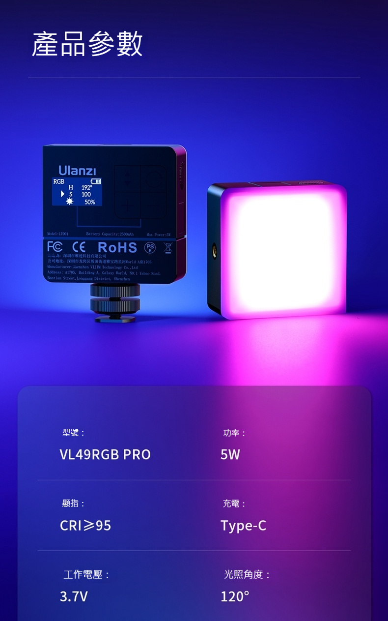 Ulanzi VL49RGB PRO 補光燈 | 五檔亮度調整 | 磁吸設計 | 香港行貨