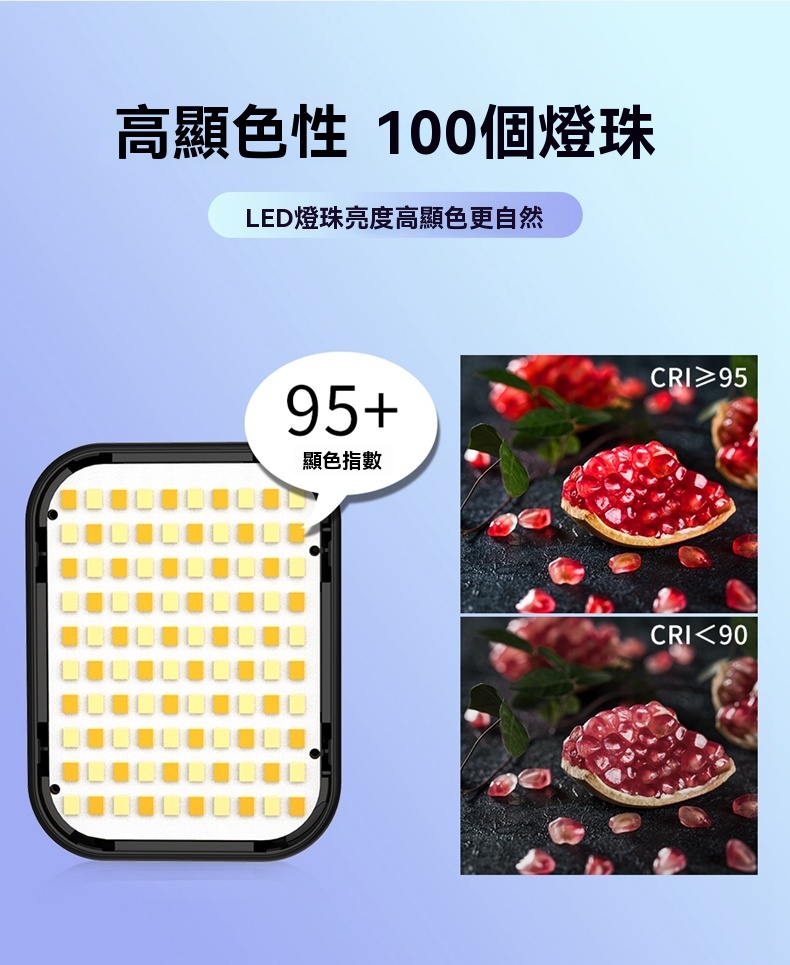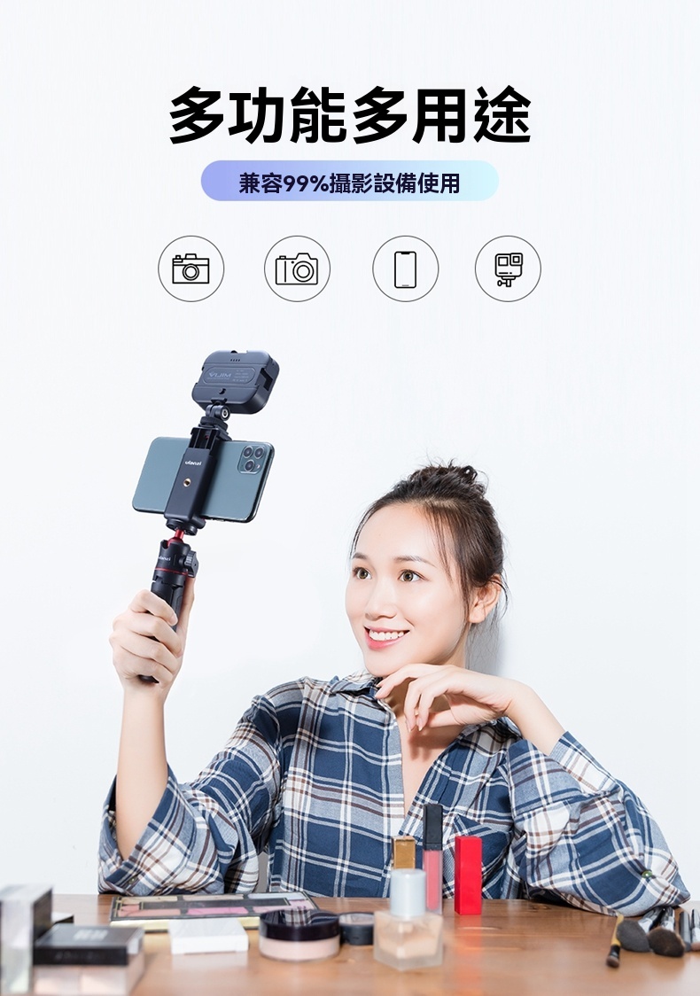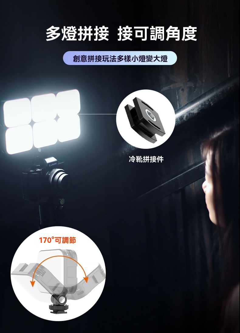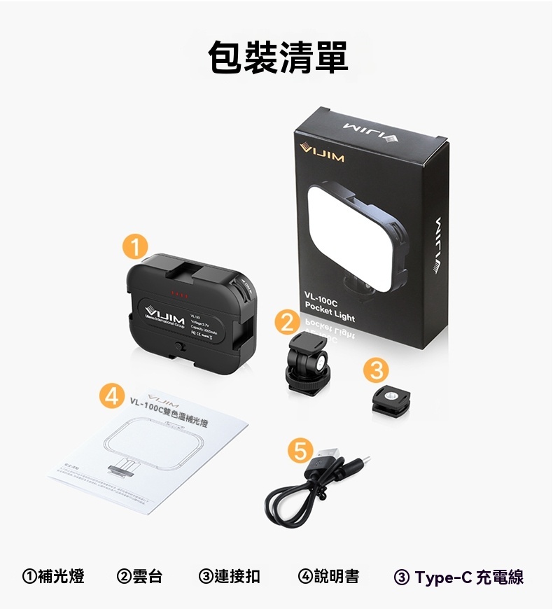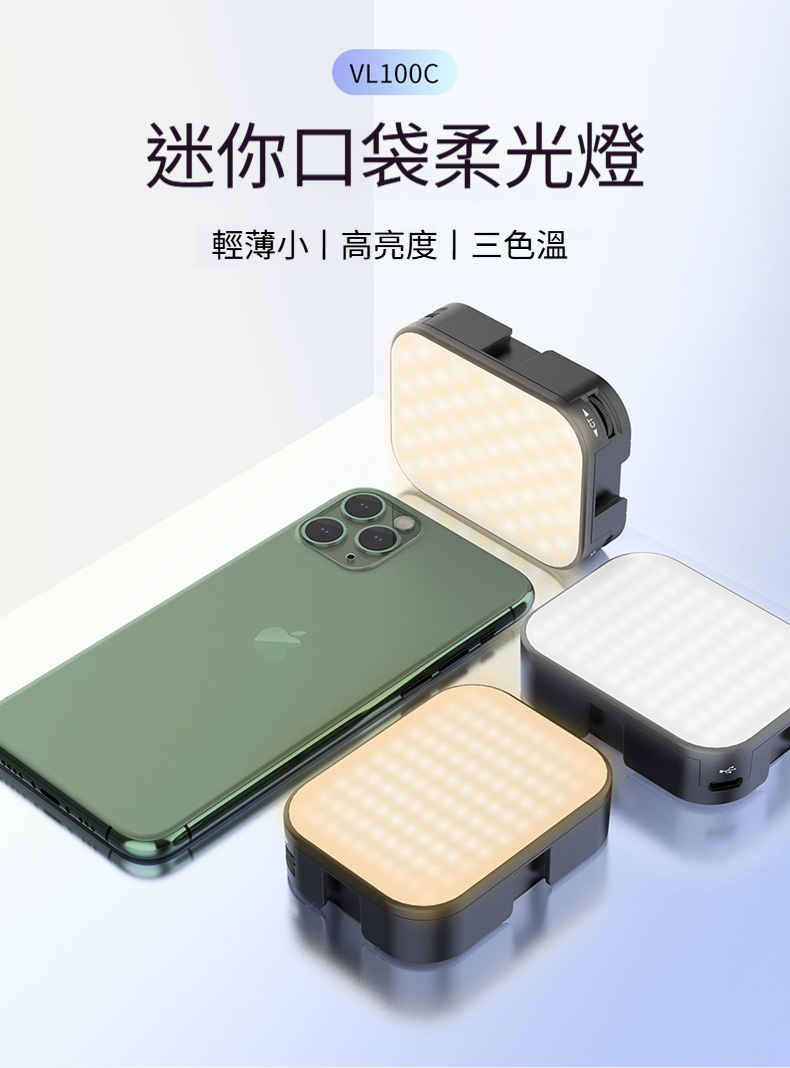 VIJIM VL-100C 迷你口袋柔光燈是一款輕薄小巧、高亮度且具備三色溫的便攜式補光燈。其設計靈活,適合多種攝影設備使用,包括相機、手機和直播設備等,適用於人物、美食、靜物及直播等多種場景。 產品採用100個LED燈珠,顯色指數達95+,確保光源自然柔和,不刺眼。無級調光功能可滿足不同色溫需求(3200K至6500K),適應各種拍攝環境。大容量2000mAh電池提供長達2小時的續航時間,並支援邊充邊用,極大地提升了使用的便利性。 此外,VL-100C 支援多燈拼接與角度調整,透過冷靴接口實現創意佈光,滿足專業攝影需求。