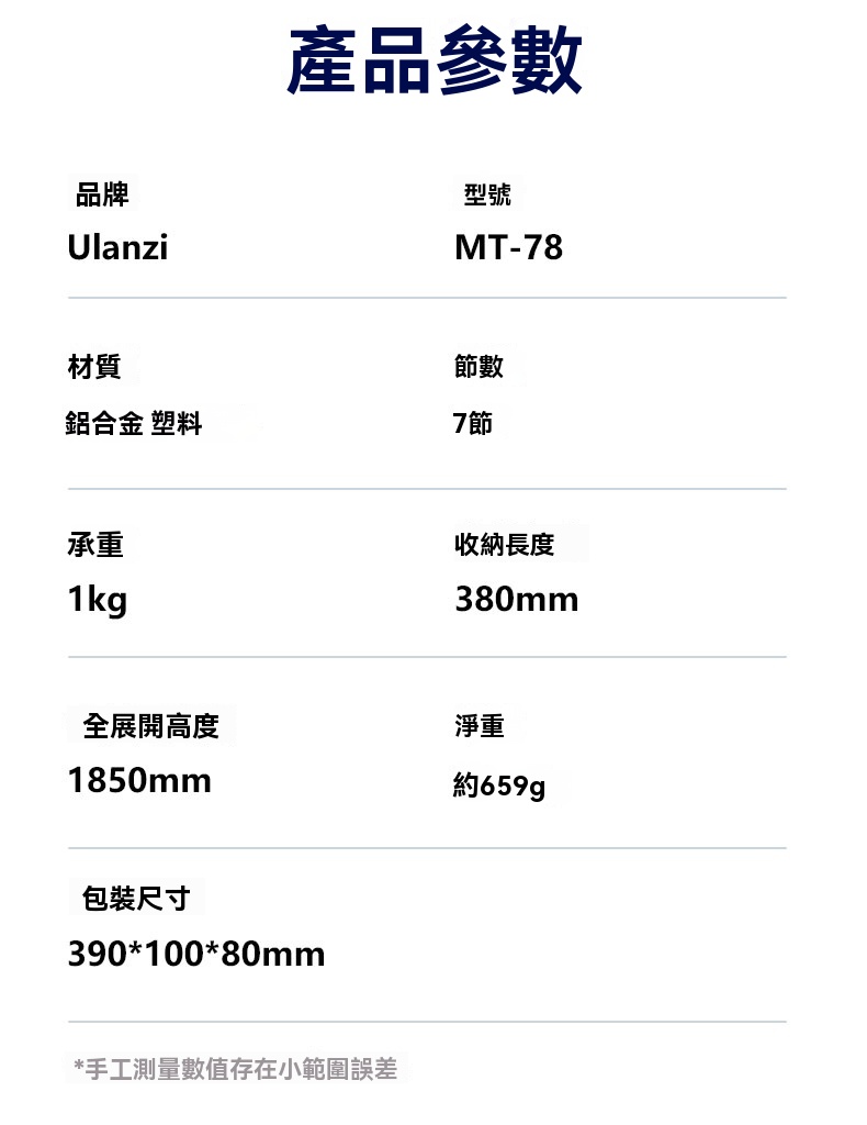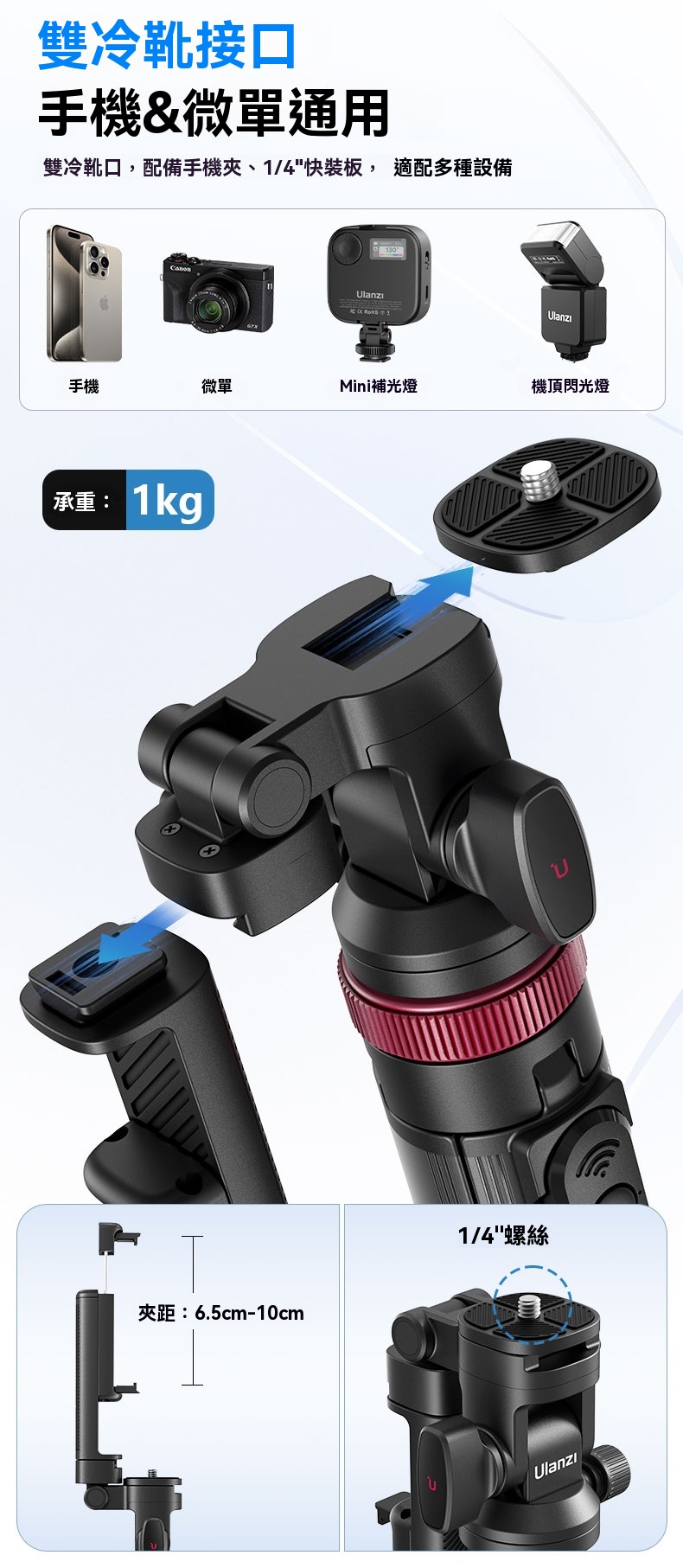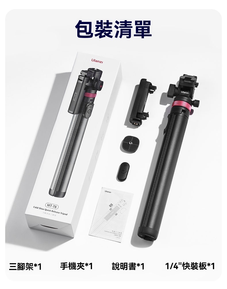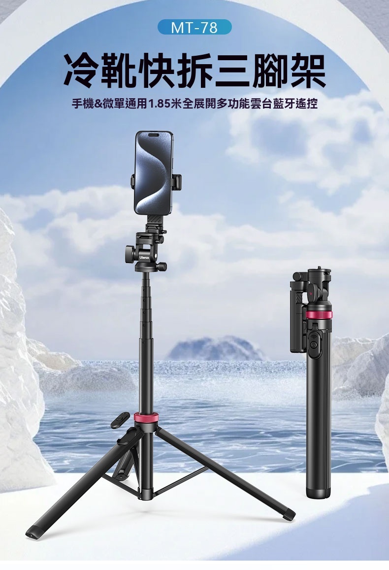 Ulanzi MT-78 冷靴快拆三腳架是一款多功能且靈活的攝影輔助工具,專為手機與微單相機設計。其最大展開高度達1.85米,適合全身拍攝及俯仰調整,滿足多種場景需求。雲台支持360°全景旋轉與180°俯仰角度,提供無限視角選擇,橫豎拍攝隨心切換。 產品採用鋁合金與塑料材質,結構穩固耐用,承重可達1kg。冷靴接口設計支援雙設備同時使用,並配備1/4"快裝板,適用於補光燈、閃光燈等外設。手機夾具備360°旋轉功能,方便調整角度,確保最佳拍攝效果。 此外,MT-78 還配備遠程藍牙遙控器,最遠可達10米,自拍時無需他人協助。 總體而言,Ulanzi MT-78 不僅是專業攝影者的得力助手,也是日常愛好者的理想選擇,兼具實用性與便攜性。