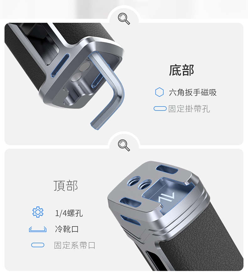 • 底部設有六角扳手磁吸和固定掛帶孔,方便快速調整和固定設備。