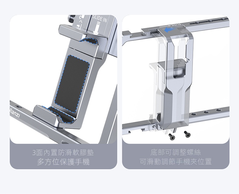 • 內置三面防滑軟膠墊,保護手機免受刮傷,並配有可調節的底部螺絲,靈活調整手機夾位置。