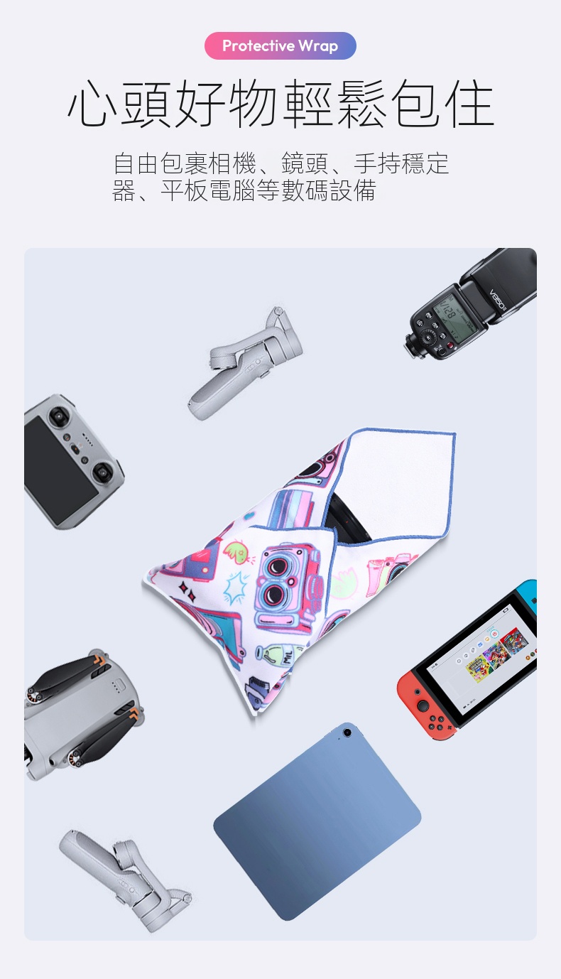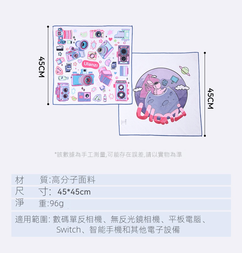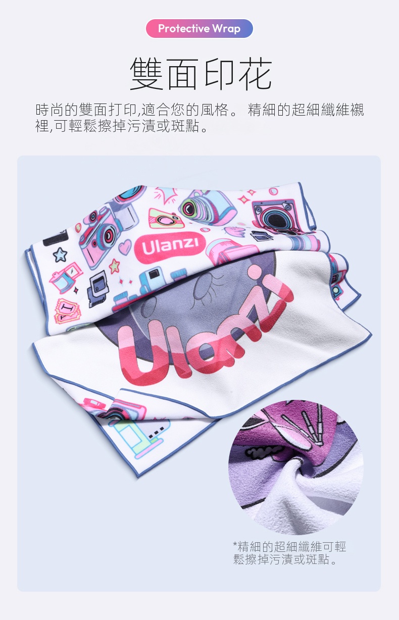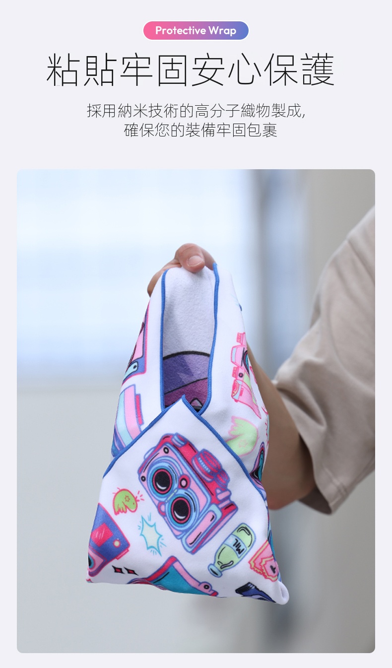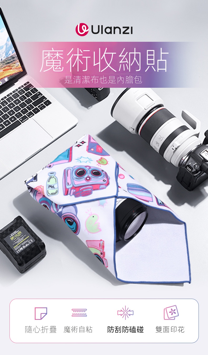 Ulanzi C069 45cm雙面印花相機魔術布,是攝影愛好者的貼心伴侶。它尺寸為45x45cm,大小適宜,可輕鬆包裝小型相機及單眼相機 。採用高聚合物布料,質地柔軟親膚。一面經奈米超細魔術製程處理,自黏牢固,搖晃、震動也不掉,隨意一折就能固定,避免相機在包內磕碰。另一面為超薄細膩內層布料,具備吸油及除塵功能,能清潔相機機身、電腦、手機等設備。雙面印花設計,兼具時尚與實用,既保護設備,也彰顯個性。無論是日常拍攝,還是旅行攜帶,都方便又好用。