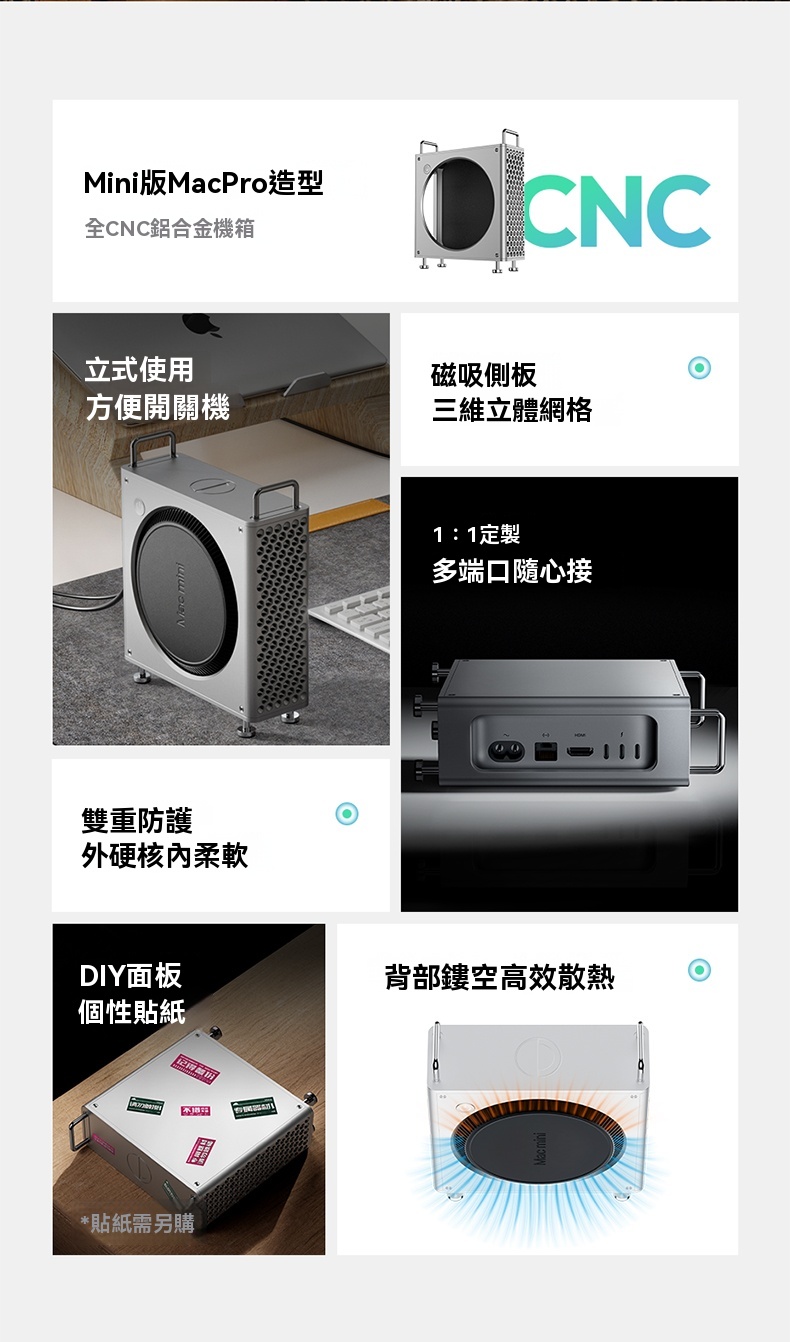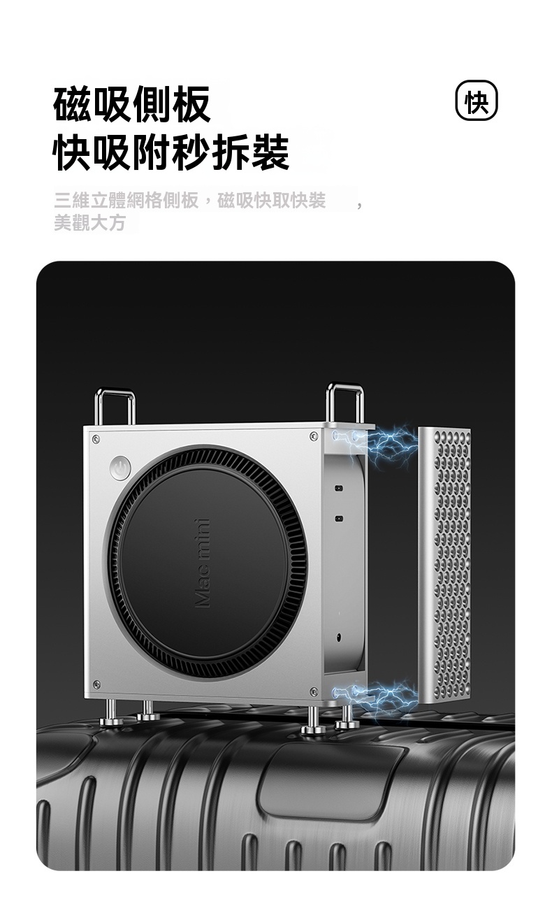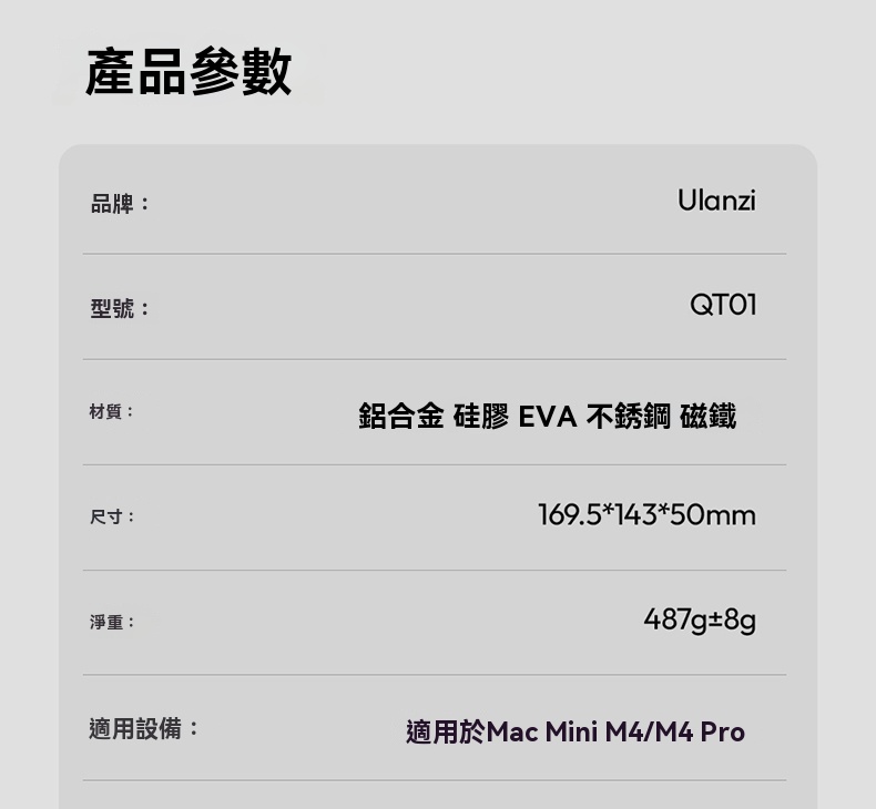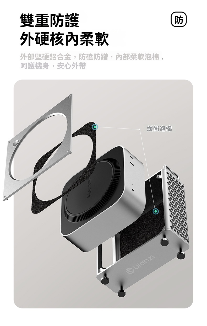 Ulanzi QT01 Mac Mini機殼外殼專為Mac Mini量身定制。它採用高品質鋁合金材質,堅固耐用,能有效抵禦碰撞與刮擦,為設備提供可靠防護,且質感十足,提升整體格調。其外觀設計延續Mac經典簡約風格,線條流暢,與Mac Mini完美適合。安裝簡單便捷,無需複雜工具與步驟。在介面方面,進行了精準預留,不影響Mac Mini正常連接各類設備,如USB-C連接埠、HDMI介面、乙太網路連接埠等,讓使用不受絲毫阻礙,全方位滿足使用者需求 。