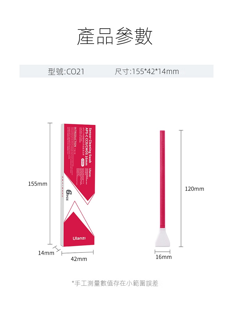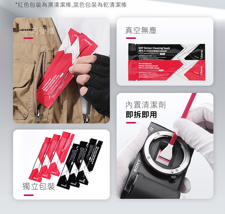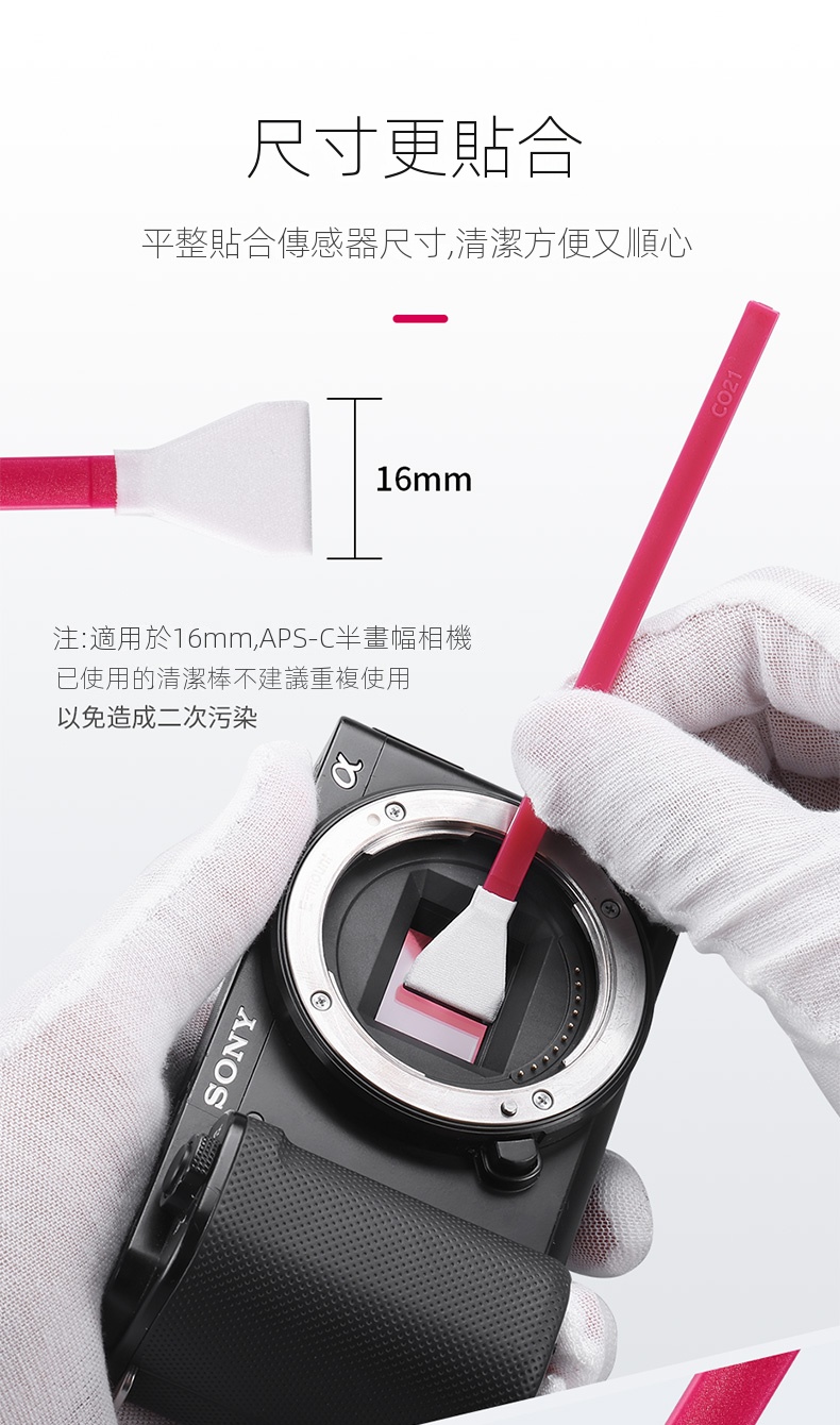 Ulanzi APS - C感光元件清潔棒專為APS - C相機量身訂做。它的清潔棒頭部覆有微米超細纖維布,能有效吸附灰塵與指紋,輕鬆搞定佳能、索尼、尼康等品牌APS - C感測器上的污漬。手把設計方便握持,操作輕鬆。每支清潔棒獨立包裝,方便攜帶,無論是日常清潔還是外出拍攝應急都很適用。清潔棒尺寸適合16mm APS - C片幅感應器,建議一次使用,避免二次污染,為你的相機感光元件帶來貼心呵護,確保拍攝畫面始終清晰純淨 。