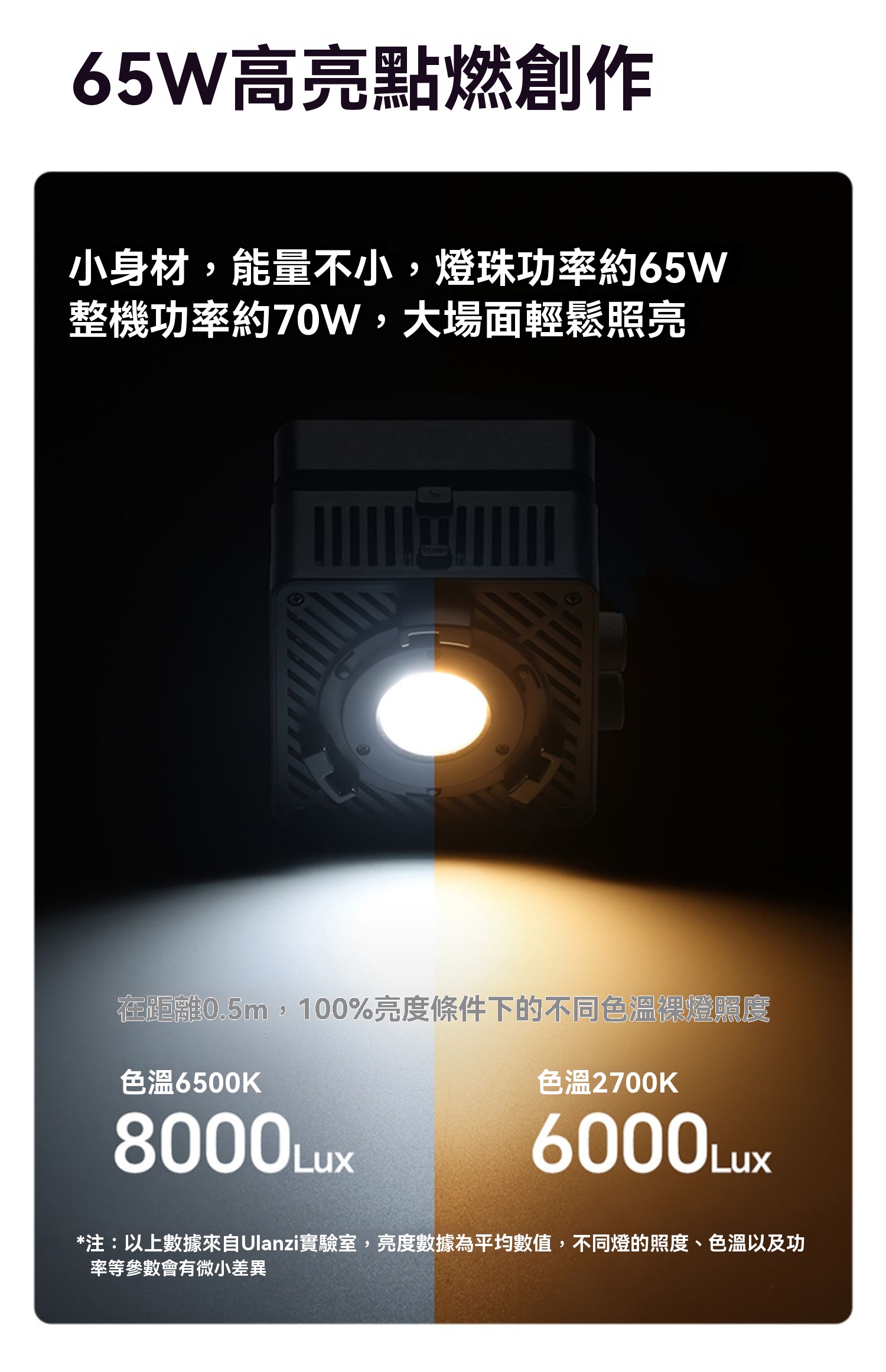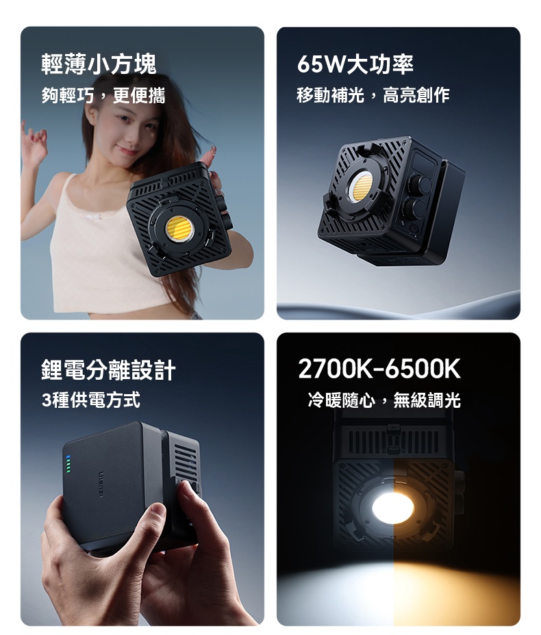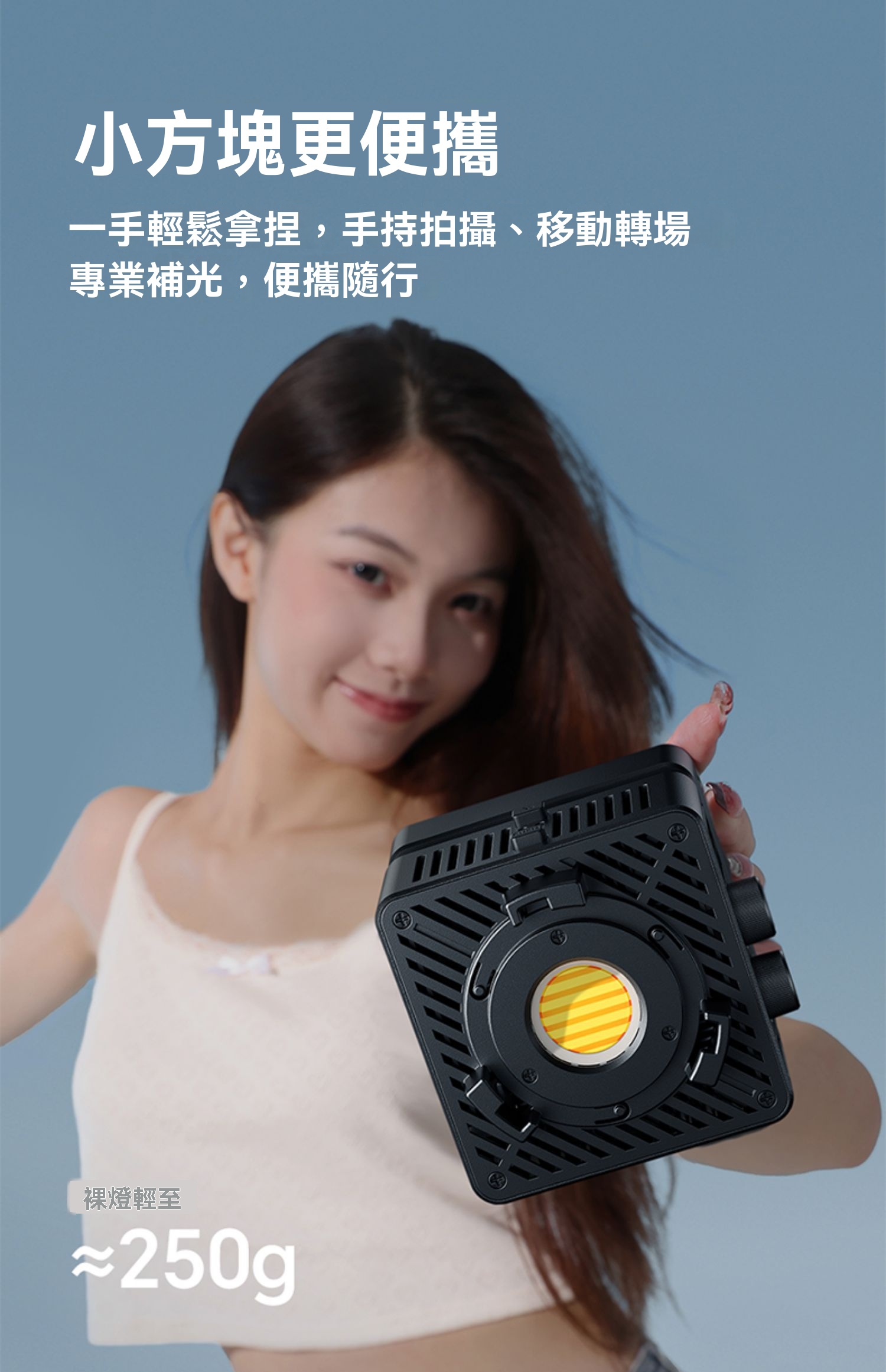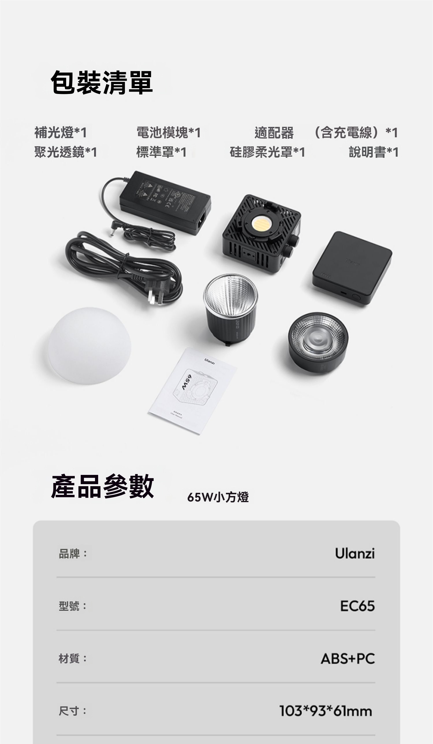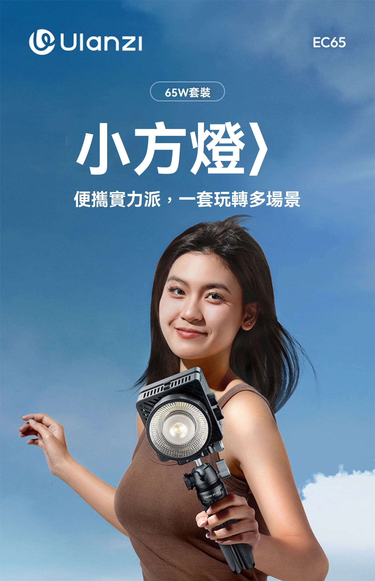 Ulanzi EC65 小方燈是一款便攜且功能強大的補光燈,適合多種攝影場景。其輕巧設計僅重約250克,方便單手操作,適合手持拍攝和移動轉場。燈具功率達65W,整機功率約70W,提供高亮度照明,色溫範圍廣泛(2700K-6500K),可無級調節,滿足不同光影需求。 產品採用創新分離式鋰電池設計,支持三種供電方式:DC電源、Type-C PD快充及獨立鋰電池模組,續航時間約40分鐘,靈活應對戶外或室內使用。此外,還配備13種創意光效,如電視閃爍、煙花效果等,豐富拍攝體驗。 EC65 配備Mini保榮卡口,兼容多種專業配件,包括聚光透鏡、標準罩和柔光罩,滿足各種布光需求。聚光透鏡提升約6.5倍照度,標準罩增加約6.3倍照度,柔光罩則帶來柔和自然的光效。顯示屏幕與旋鈕設計簡潔實用,並支援手機APP遠程控制,操作便捷。 總體而言,Ulanzi EC65 小方燈以其便攜性、多功能性和出色的光學表現,成為視頻拍攝、人像寫真和戶外Vlog的理想選擇。