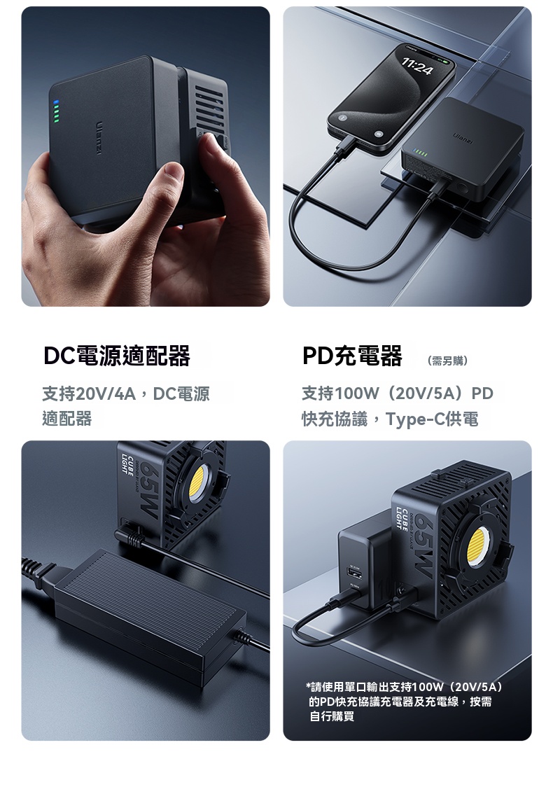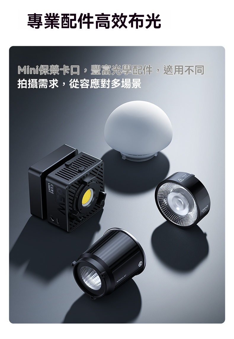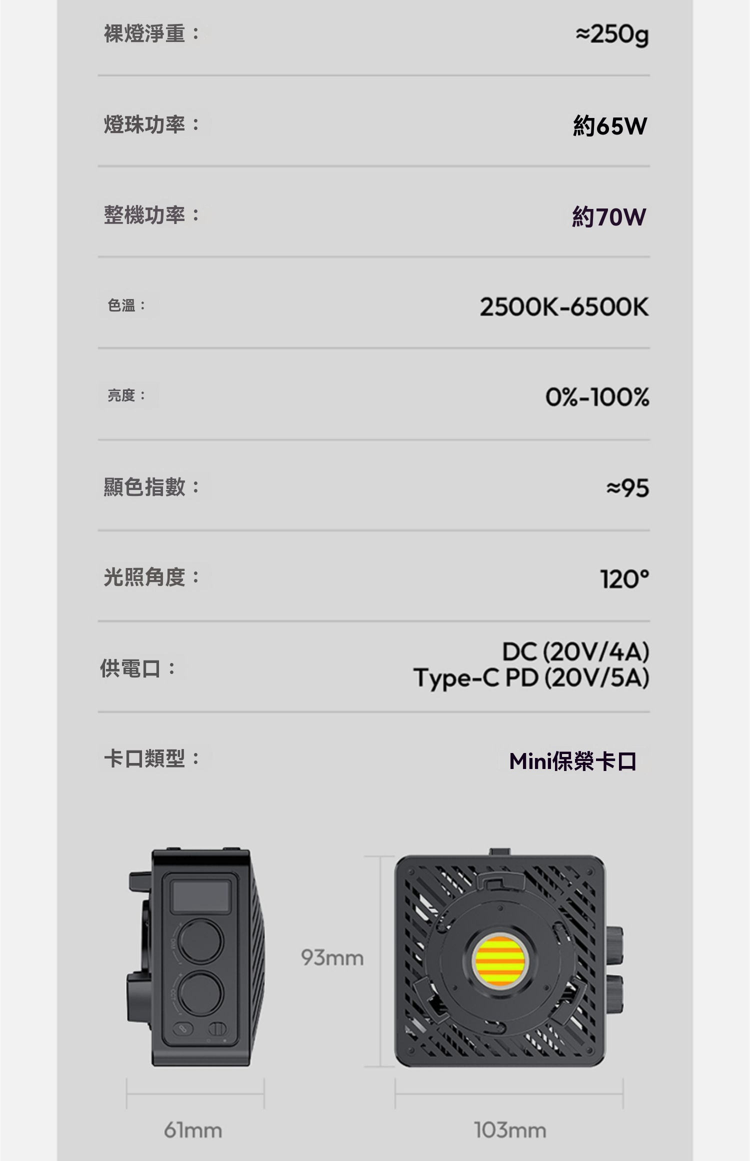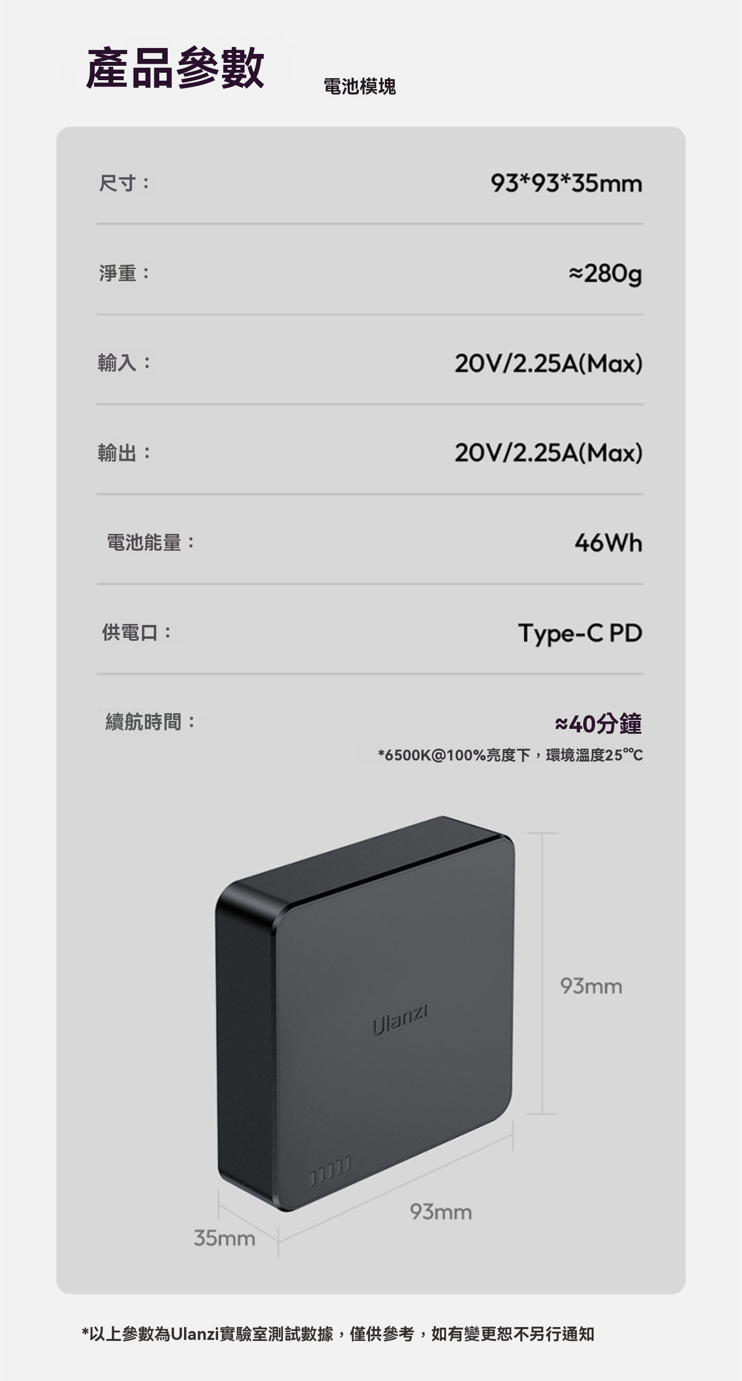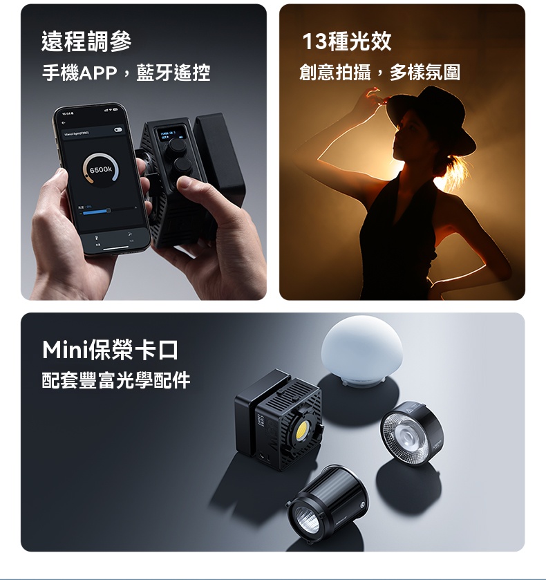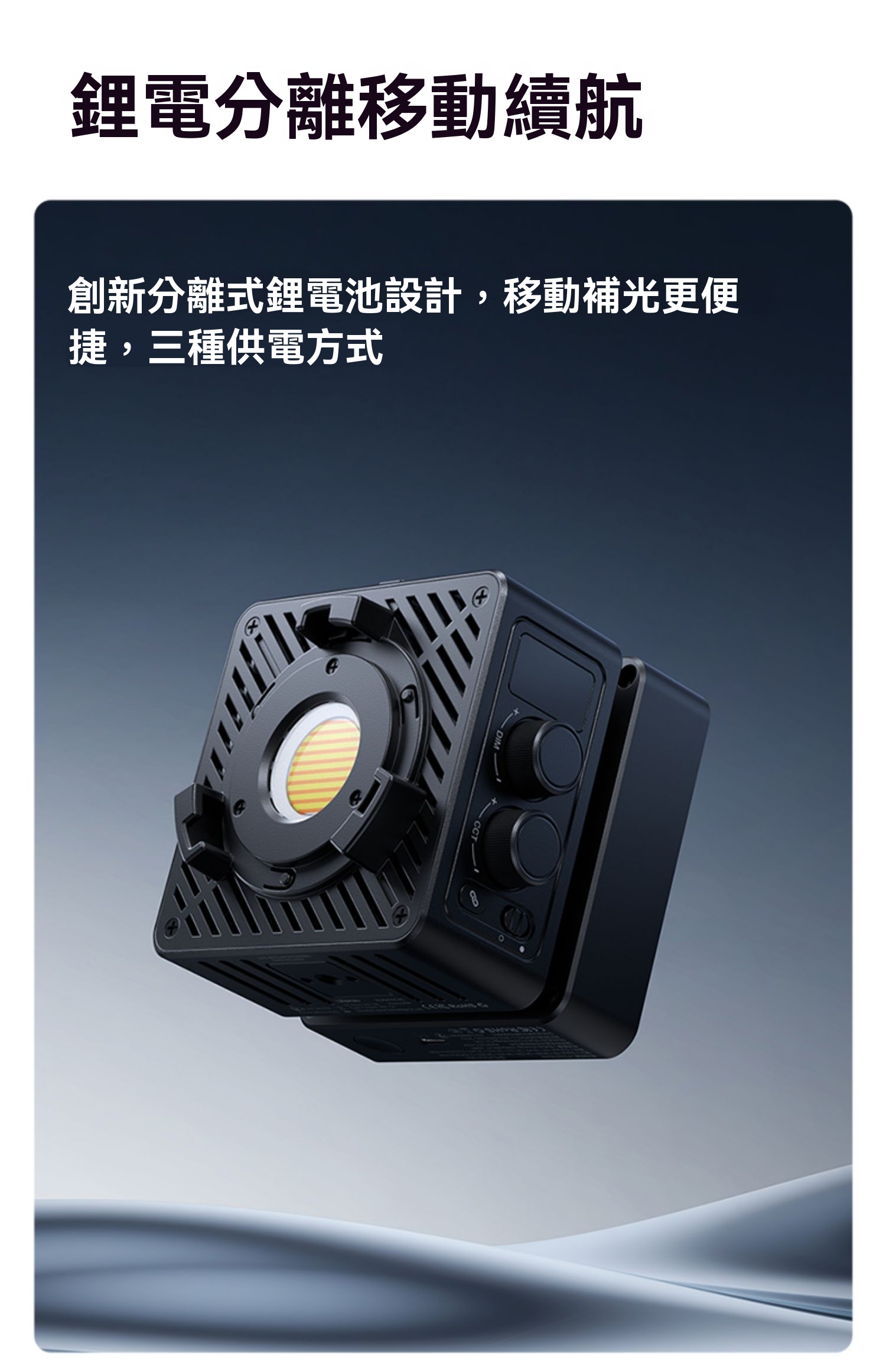 Ulanzi EC65 小方燈是一款便攜且功能強大的補光燈,適合多種攝影場景。其輕巧設計僅重約250克,方便單手操作,適合手持拍攝和移動轉場。燈具功率達65W,整機功率約70W,提供高亮度照明,色溫範圍廣泛(2700K-6500K),可無級調節,滿足不同光影需求。 產品採用創新分離式鋰電池設計,支持三種供電方式:DC電源、Type-C PD快充及獨立鋰電池模組,續航時間約40分鐘,靈活應對戶外或室內使用。此外,還配備13種創意光效,如電視閃爍、煙花效果等,豐富拍攝體驗。 EC65 配備Mini保榮卡口,兼容多種專業配件,包括聚光透鏡、標準罩和柔光罩,滿足各種布光需求。聚光透鏡提升約6.5倍照度,標準罩增加約6.3倍照度,柔光罩則帶來柔和自然的光效。顯示屏幕與旋鈕設計簡潔實用,並支援手機APP遠程控制,操作便捷。 總體而言,Ulanzi EC65 小方燈以其便攜性、多功能性和出色的光學表現,成為視頻拍攝、人像寫真和戶外Vlog的理想選擇。