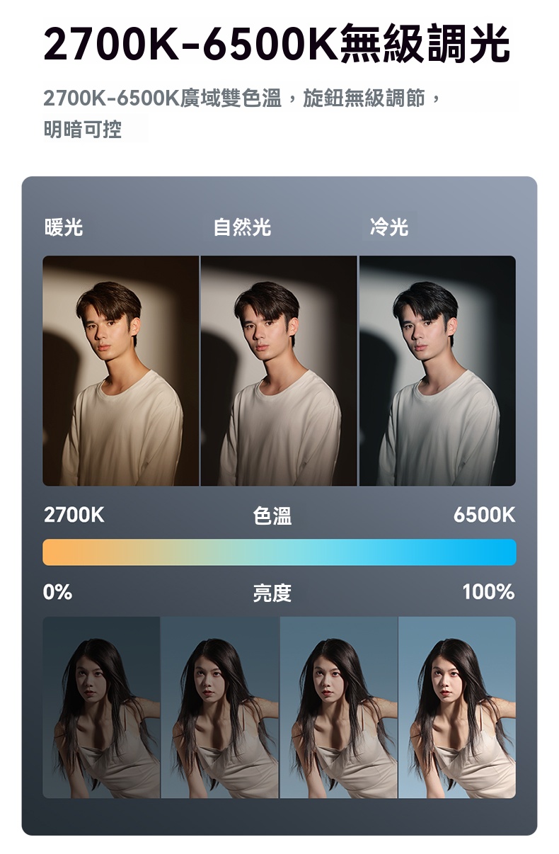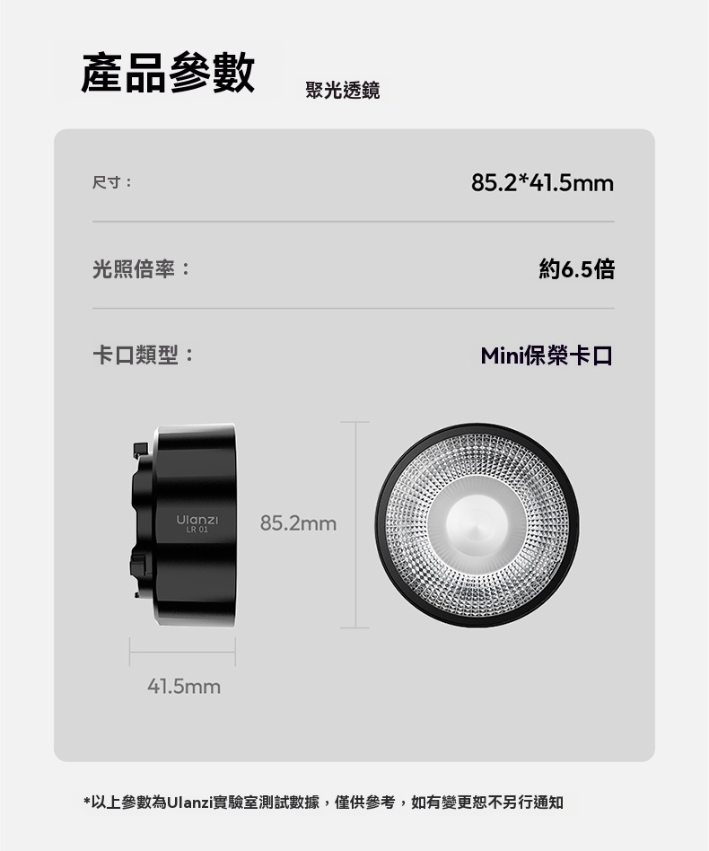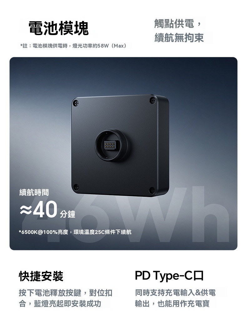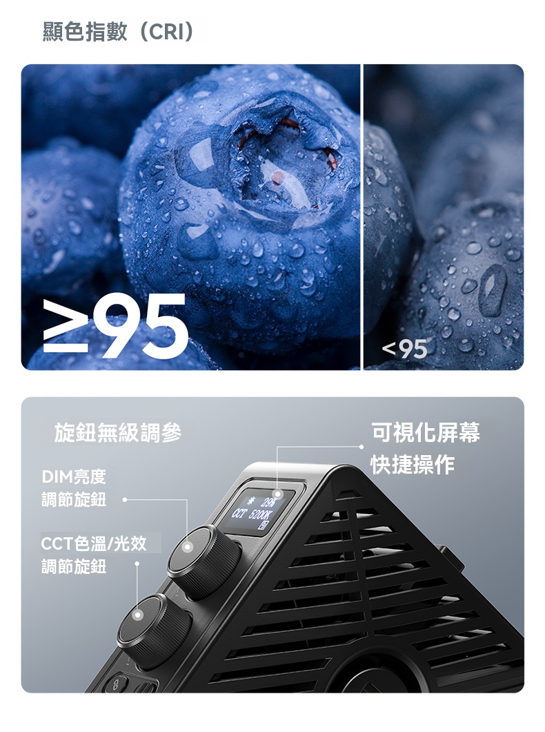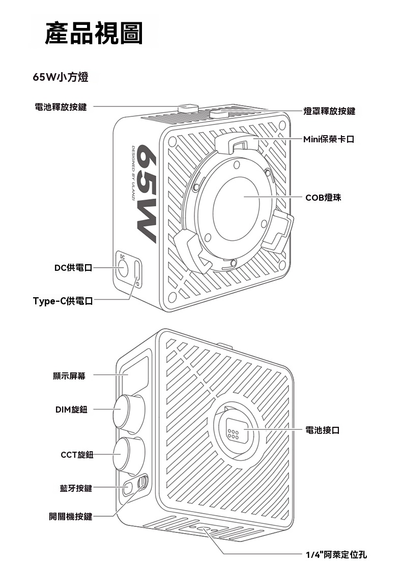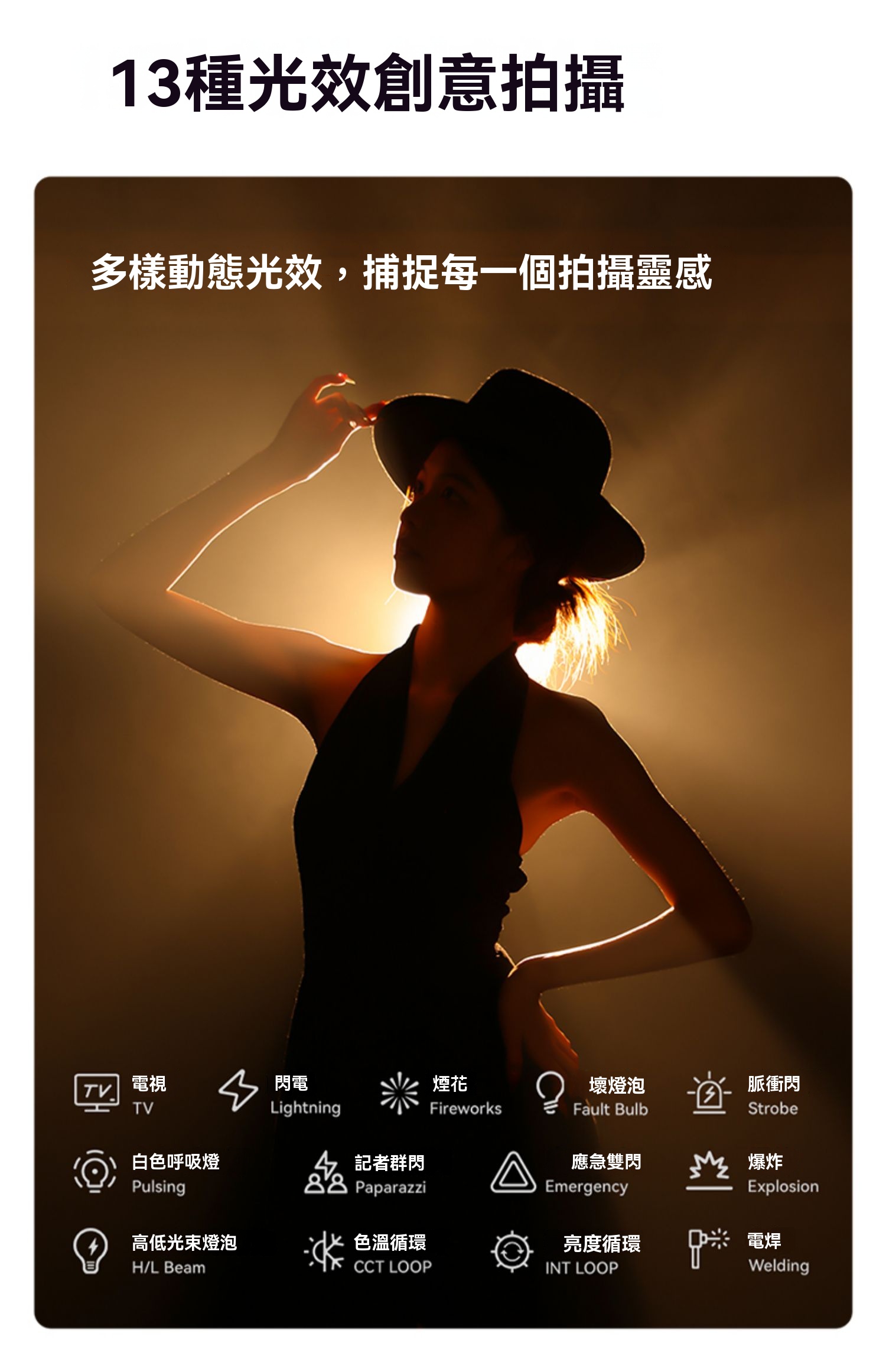 Ulanzi EC65 小方燈是一款便攜且功能強大的補光燈,適合多種攝影場景。其輕巧設計僅重約250克,方便單手操作,適合手持拍攝和移動轉場。燈具功率達65W,整機功率約70W,提供高亮度照明,色溫範圍廣泛(2700K-6500K),可無級調節,滿足不同光影需求。 產品採用創新分離式鋰電池設計,支持三種供電方式:DC電源、Type-C PD快充及獨立鋰電池模組,續航時間約40分鐘,靈活應對戶外或室內使用。此外,還配備13種創意光效,如電視閃爍、煙花效果等,豐富拍攝體驗。 EC65 配備Mini保榮卡口,兼容多種專業配件,包括聚光透鏡、標準罩和柔光罩,滿足各種布光需求。聚光透鏡提升約6.5倍照度,標準罩增加約6.3倍照度,柔光罩則帶來柔和自然的光效。顯示屏幕與旋鈕設計簡潔實用,並支援手機APP遠程控制,操作便捷。 總體而言,Ulanzi EC65 小方燈以其便攜性、多功能性和出色的光學表現,成為視頻拍攝、人像寫真和戶外Vlog的理想選擇。