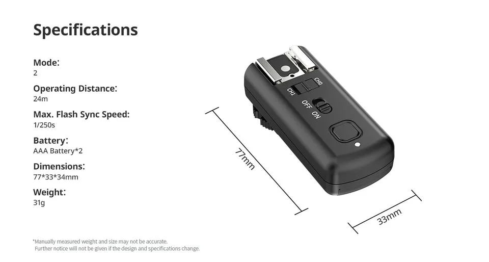 Ulanzi TT01相機通用型無線引閃器,堪稱攝影愛好者的得力助手。它採用2.4GHz無線頻道,適合多國免費頻段,應用場景廣泛。透過FSK制式,有效保障訊號速度、距離與穩定性,遙控距離可達100公尺左右,讓你擺脫距離束縛。其快門同步速度高達1/250秒,能精準捕捉精彩瞬間,照片更加鮮明。這款引閃器相容性強,可搭配不同品牌相機及各類閃光燈、影室燈。同時,它操作便捷,新手也能快速上手,為你的創作提供更多可能,輕鬆提升拍攝效果 。