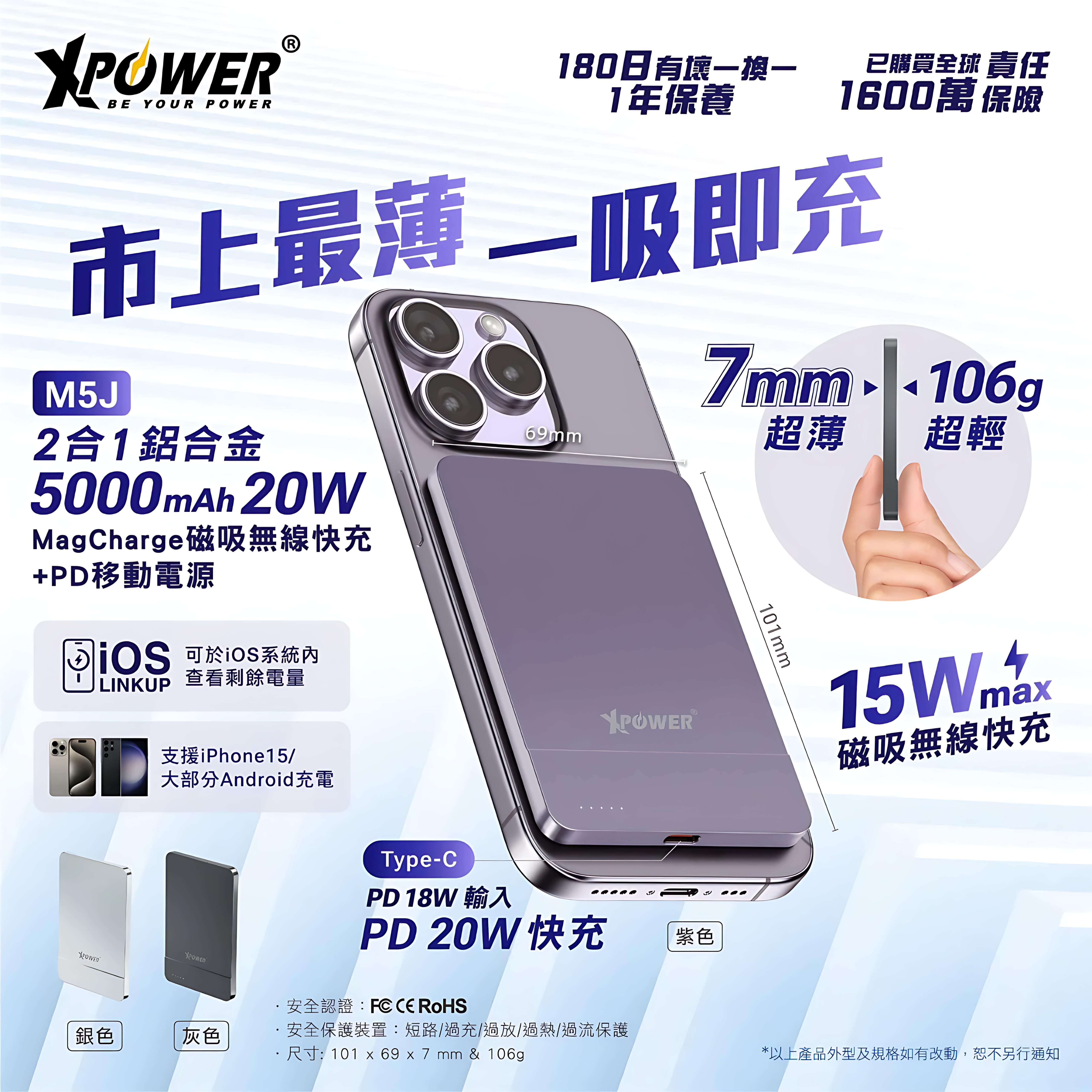 Buy XPower M5J 2合1超薄鋁合金5000mAh 移動電源 - 灰色 | 15W無線快充 | 7mm超薄 | 香港行貨 price in outletexpress .com Hong Kong.In promotion and sale.