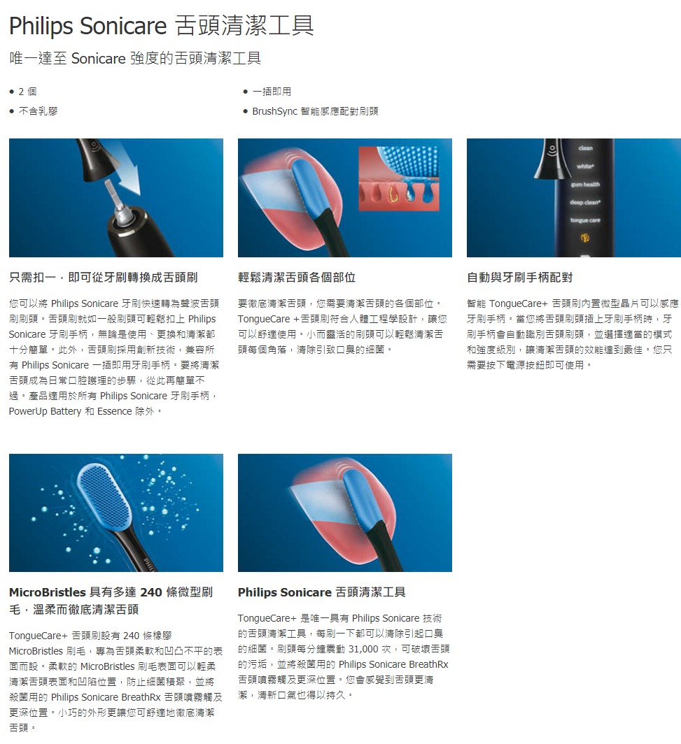 • 舌苔清潔刷頭配有240個舌苔軟膠接觸點