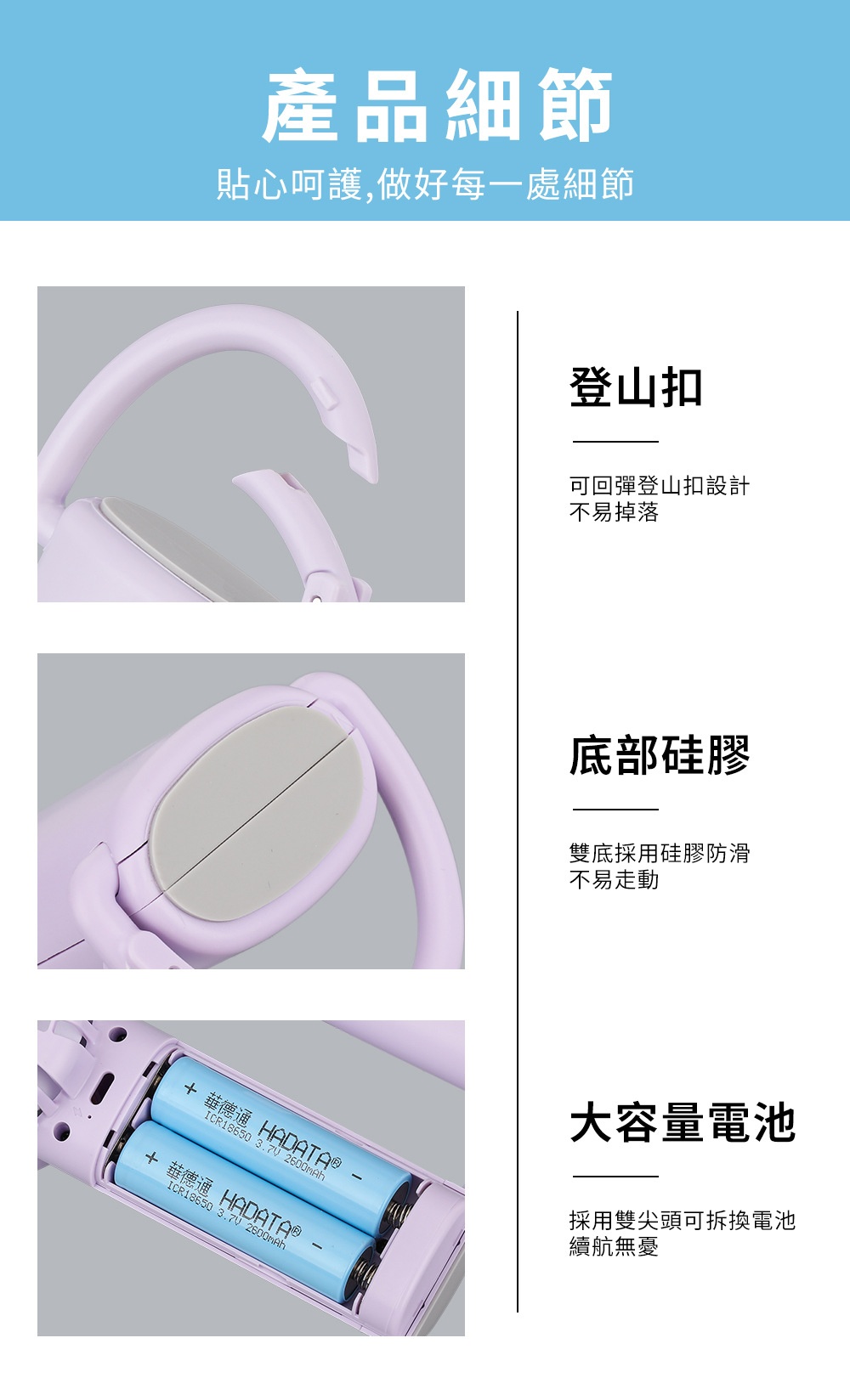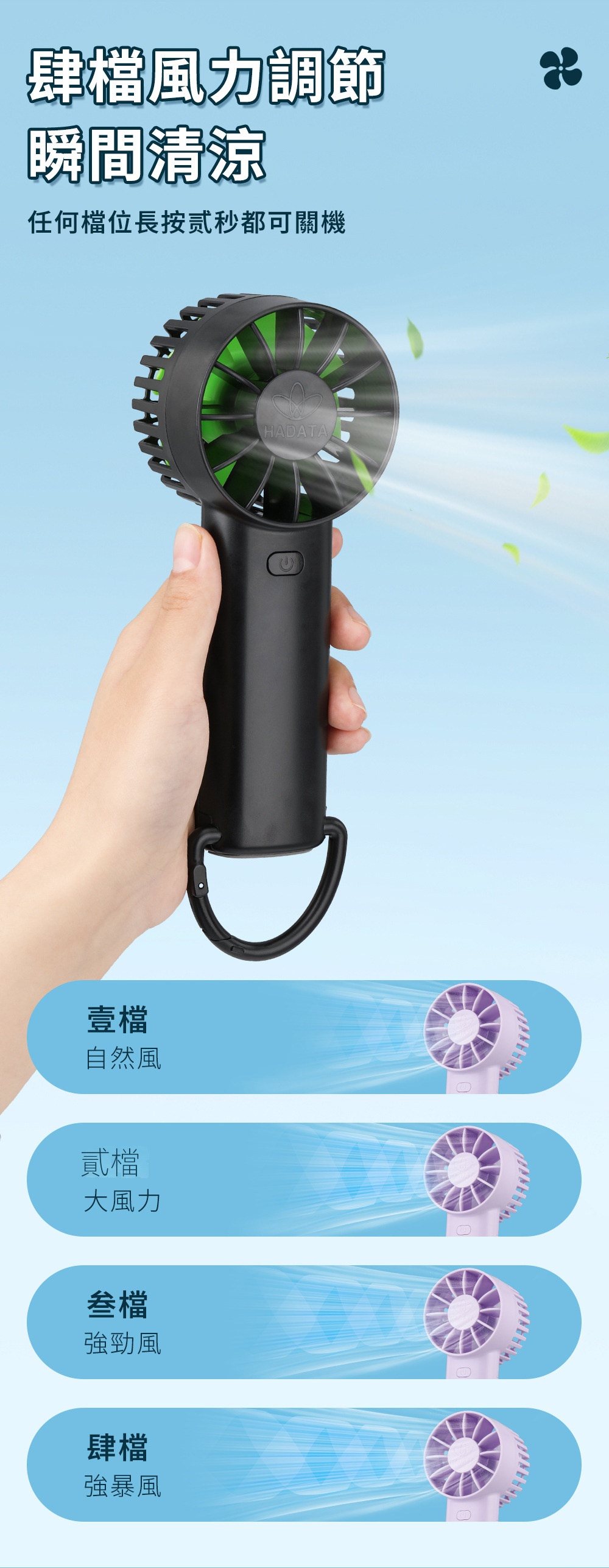 HADATA F60手持迷你風扇,採用強勁無刷電機,提供超大風力,讓您隨時享受清涼。其獨特的回彈登山扣設計,方便隨身攜帶,輕鬆掛於背包或腰間。產品配備四檔風力調節,滿足不同場景需求,且擁有5200mAh大容量電池,續航長達13小時。底部硅膠墊設計,桌面放置更穩固。尺寸為53x68x175mm,重量僅216g,輕巧便攜,是戶外旅行和日常使用的理想選擇。