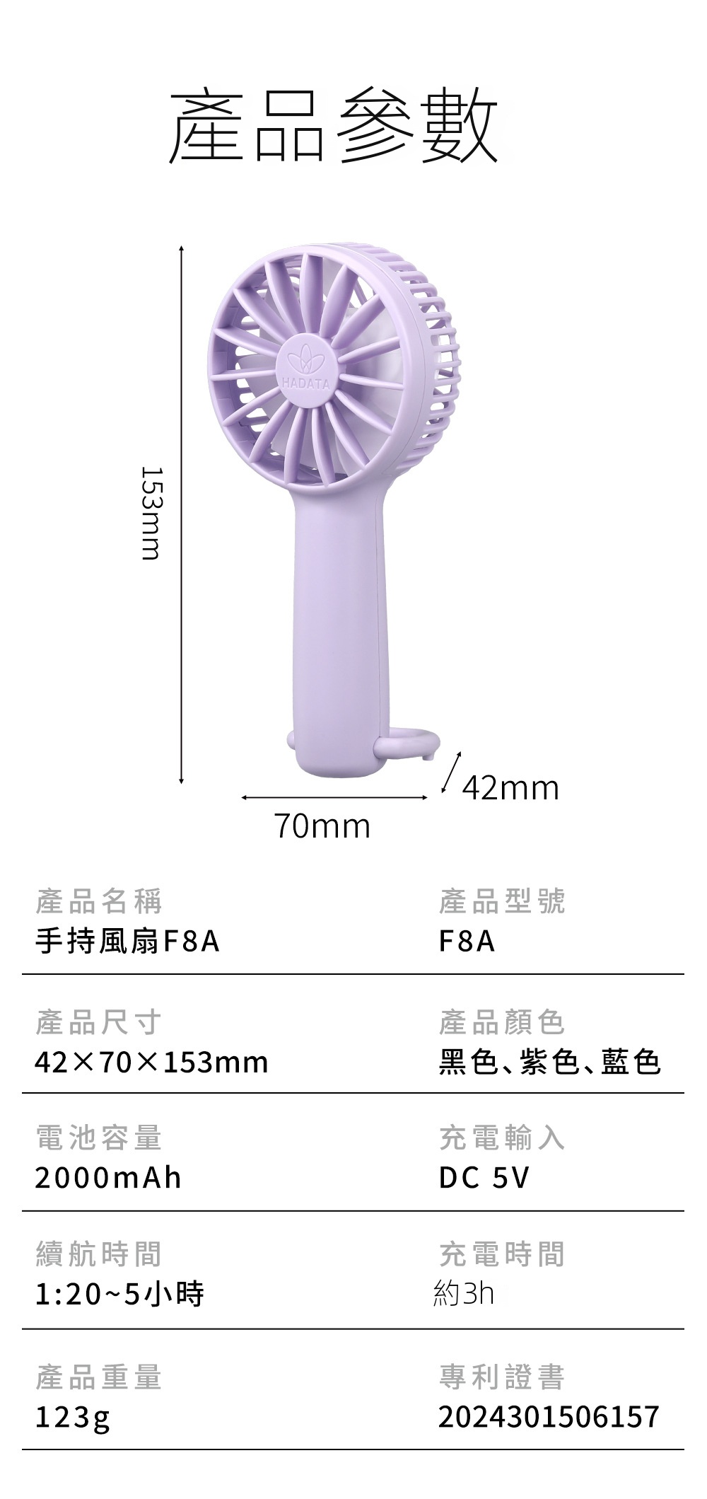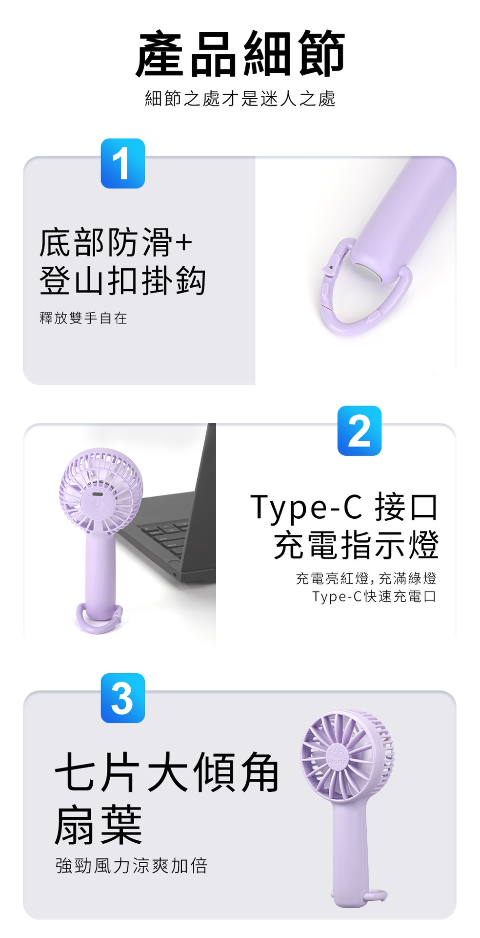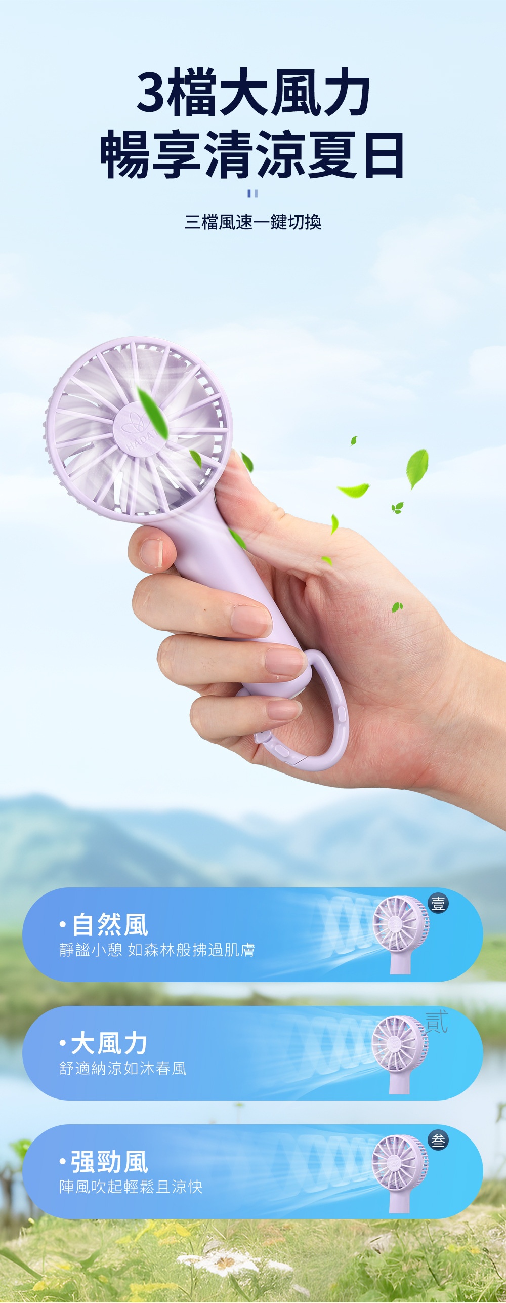 HADATA F8A 多用便攜式手持迷你風扇,天藍色設計,輕巧僅123克,隨身攜帶無負擔。配備三檔風力,強勁風速暢享清涼夏日。底部支架設計,秒變桌面風扇,適用多場景。Type-C快充接口,2000mAh大電池提供長效續航。複合消音技術,低噪運轉不擾人。登山掛扣設計,方便懸掛於背包,隨時享受清涼。七片大傾角扇葉,風力更強勁。理想選擇,為您的夏日帶來舒適體驗。