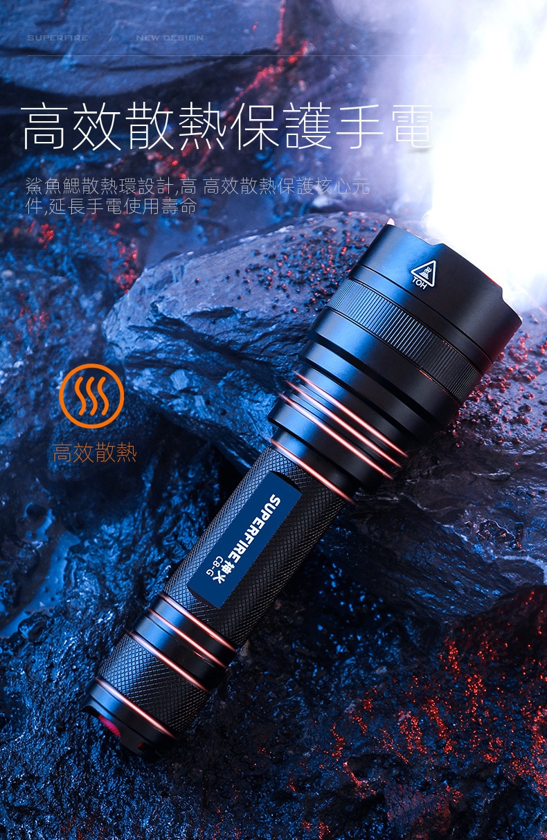 神火LED強光防水手電筒 C8-T6,配備10W大功率燈芯,提供強勁光效與遠射程。IP46防水等級,無懼惡劣天候,確保穩定使用。鋁合金材質,輕巧耐用,搭配高效散熱結構,方便快捷。理想選擇於戶外探險、緊急應對等場合。