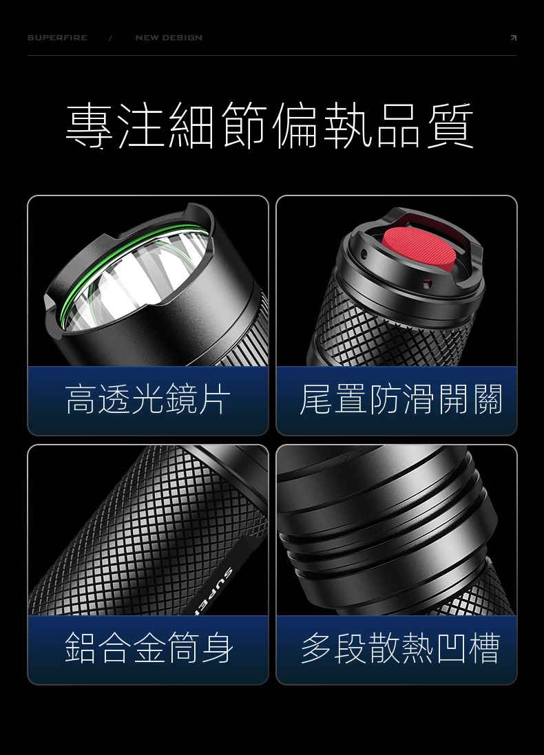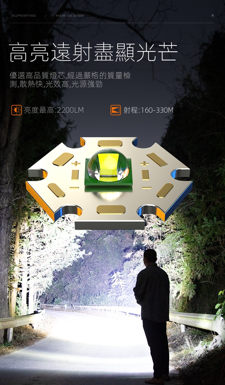 • 檔位:强光-中光-弱光-爆閃-SOS