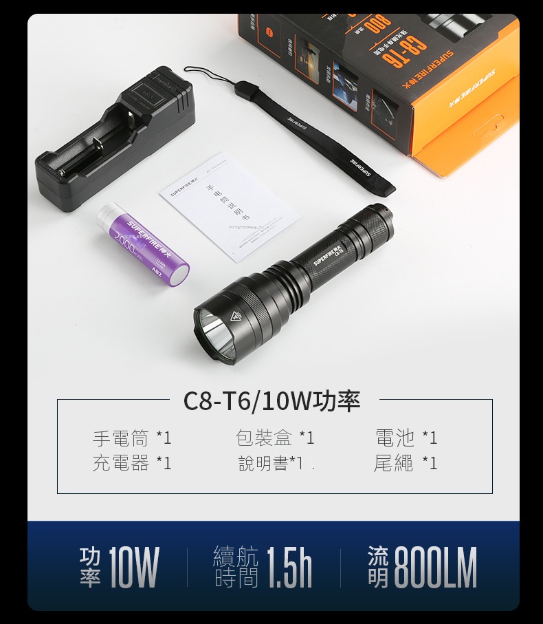 神火LED強光防水手電筒 C8-T6 10W+座充 | 大功率燈芯 | 五檔燈光 | IP46防水