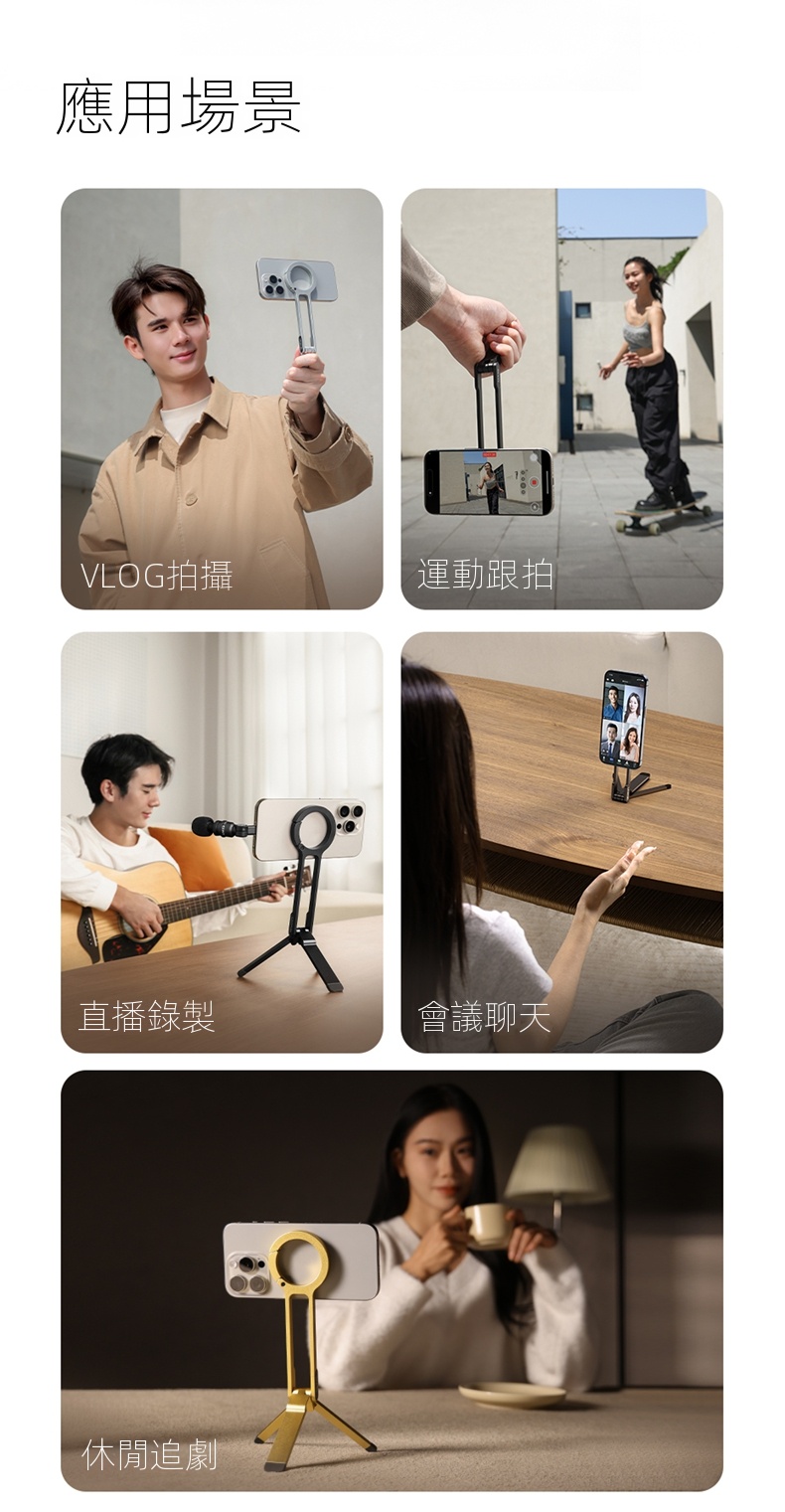 • 適用於VLOG拍攝、運動跟拍、直播錄製、會議聊天及休閒追劇等多種場景