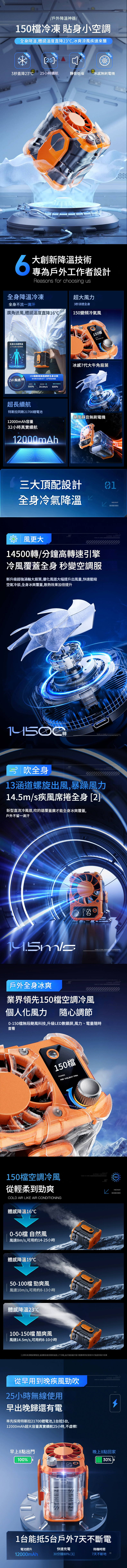 便攜式掛腰風扇F005U,專為追求舒適與便利的用戶設計。具備150檔無段風速調節,搭載渦輪引擎壓縮冷凍技術,能迅速降溫達23℃。風速可達14M/S,讓您享受涼爽體驗。輕盈的設計方便攜帶,並具備防水、防汗、防摔和防塵功能,還配有行動電源和手電筒功能,讓您在戶外活動中更安心。