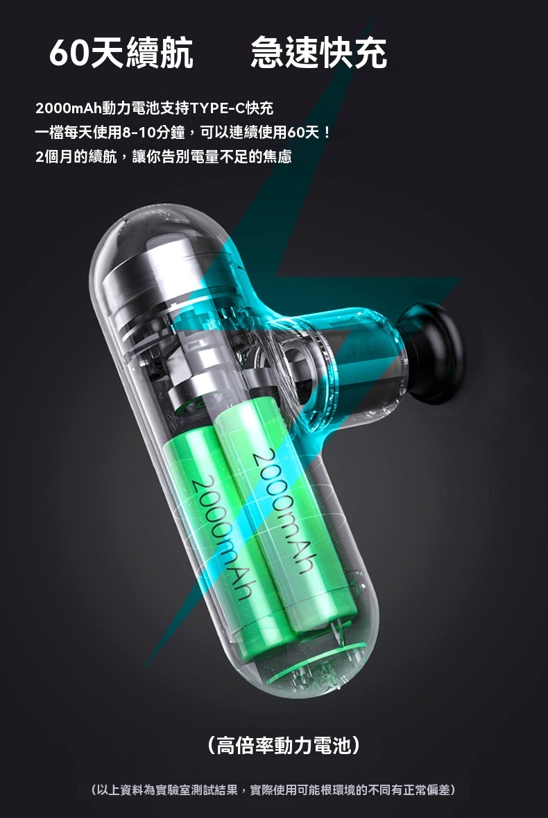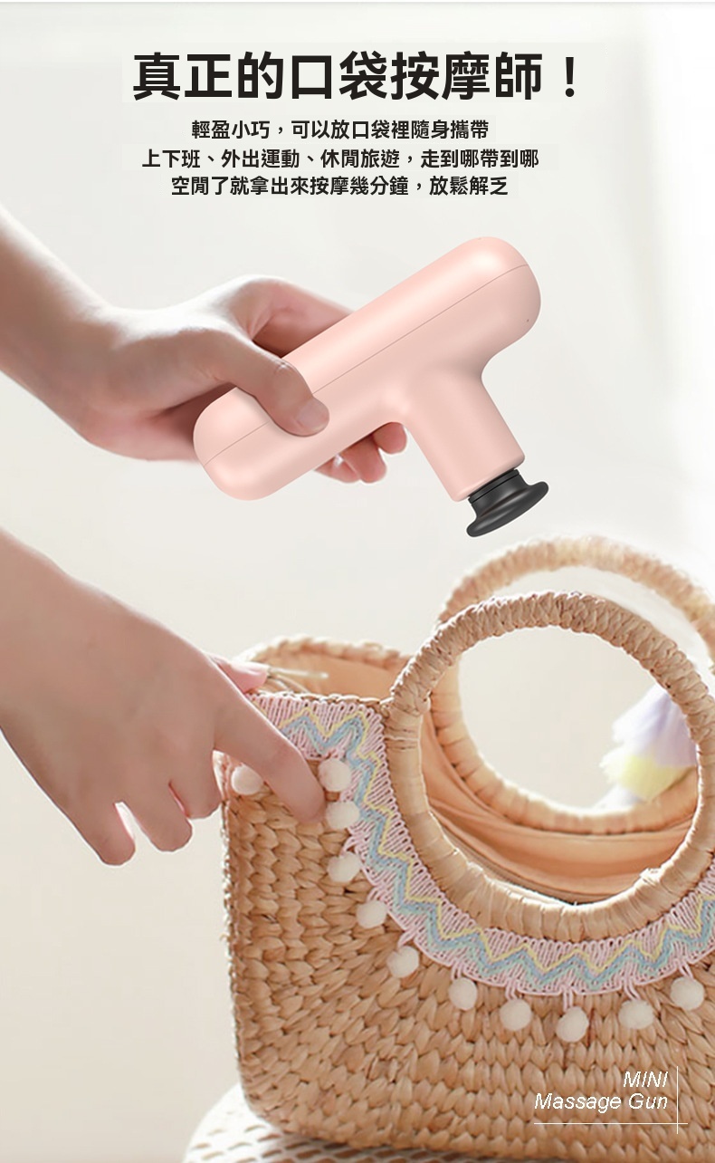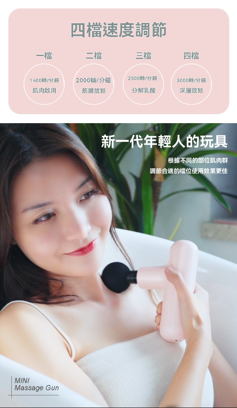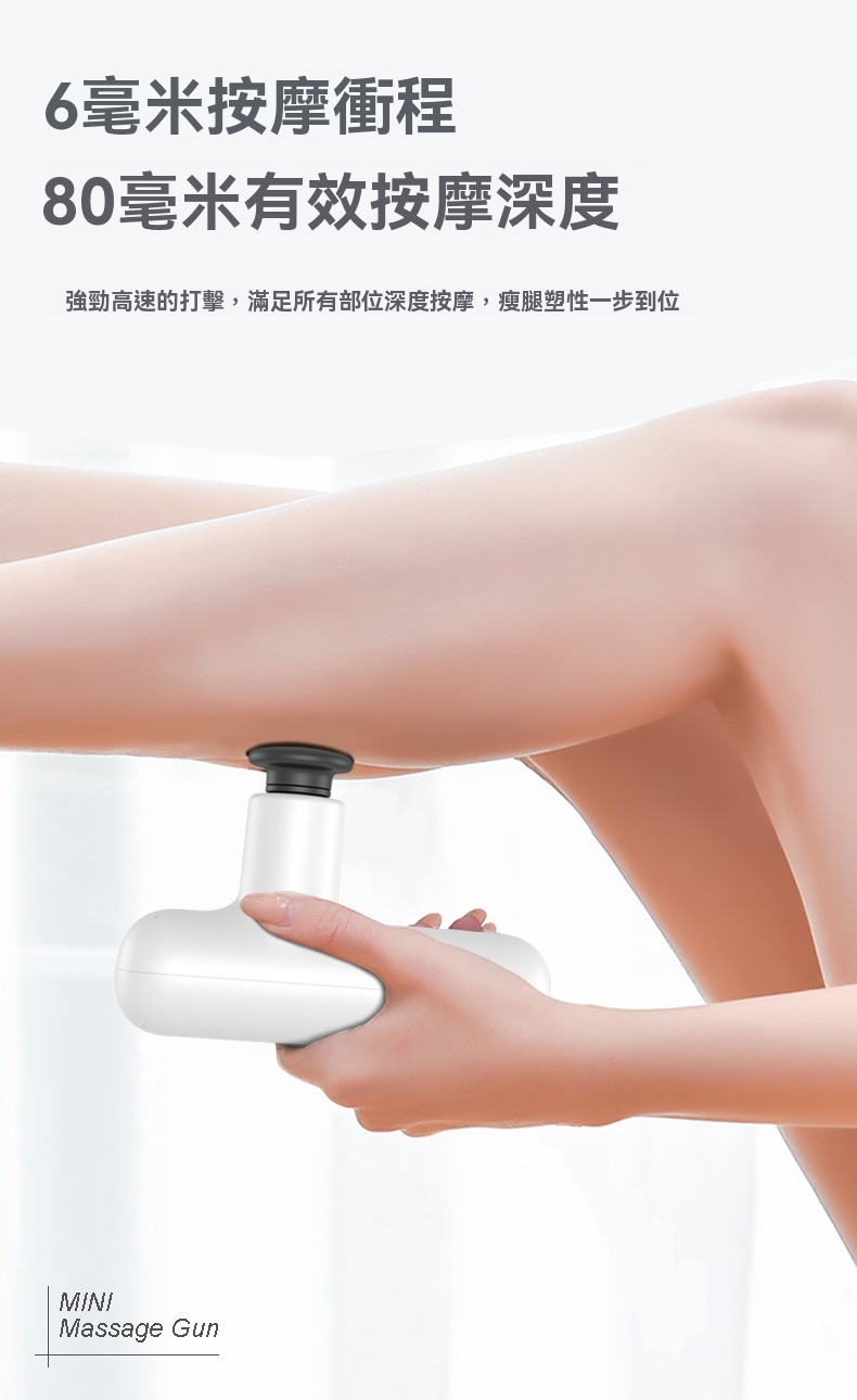 迷你便攜高頻肌肉按摩槍 - 黑色,是一款專為深度按摩與放鬆設計的隨身設備。產品擁有6mm按摩衝程與80mm有效按摩深度,搭載強勁高速馬達,轉速高達3000轉/分鐘,並支援四檔調速(1400至3000轉/分鐘),可針對不同肌肉群進行放鬆與乳酸分解。內建AI晶片,智能調節打擊力度,使用更貼心。機身輕巧僅425g,單手握持輕鬆,方便放入口袋隨身攜帶。配備2000mAh動力電池,支援Type-C快充,續航可達11小時,一檔使用每天8-10分鐘可連續使用60天。運行聲音僅45分貝,如正常談話般安靜。最大可承受3kg壓力,滿足全身肌肉按摩需求。附贈四種專業按摩頭,適用於不同部位。