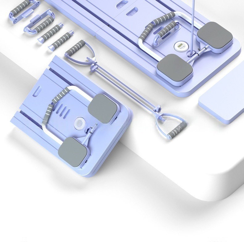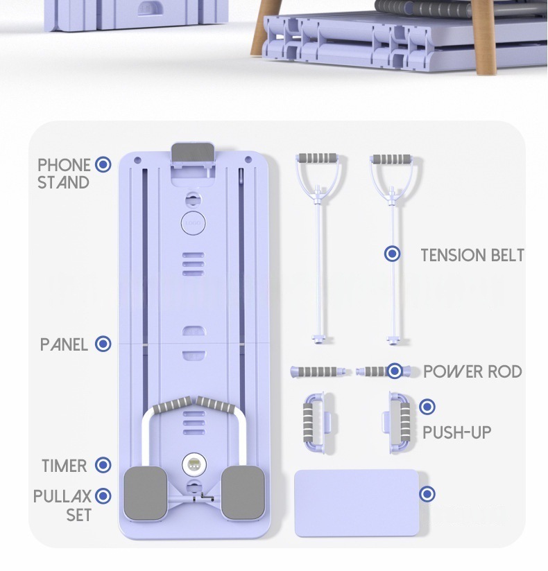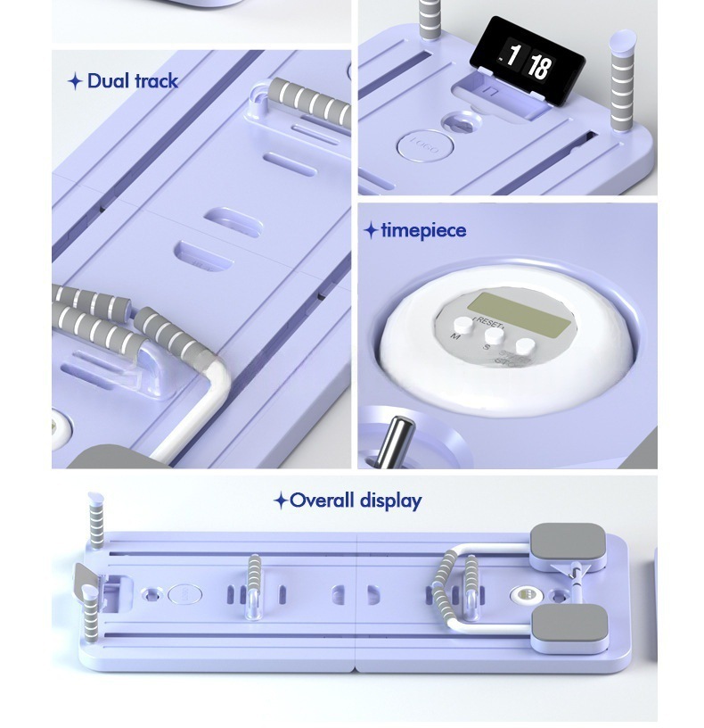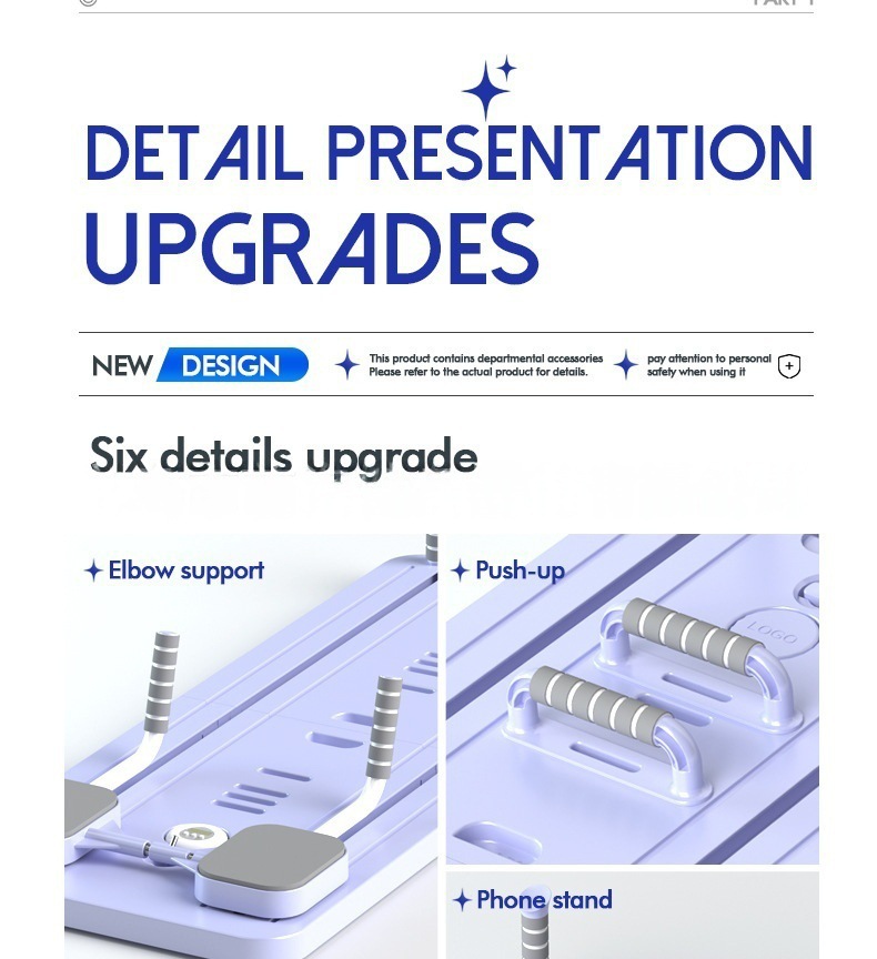 這款紫色多功能健腹板是一款專為核心訓練與普拉提運動設計的健身器材。產品具備六項細節升級,包含肘部支撐墊、伏地挺身功能與手機支架,並配備雙軌道設計與計時器,提升使用體驗。主體採用加厚與加寬的舒適墊片,確保運動時的穩定性與舒適度。其內置橡膠皮帶提供自動回彈功能,使動作更順暢。器材搭配張力帶與拉力桿,可進行多種訓練,包括核心訓練、平板支撐、俯臥起坐、平衡拉伸、臀部訓練與伏地挺身等。該產品附有計時器,操作簡便。其特色為一秒摺疊,方便收納且不佔空間。請注意,產品包含多個配件,使用時應注意個人安全,具體以實物為準。