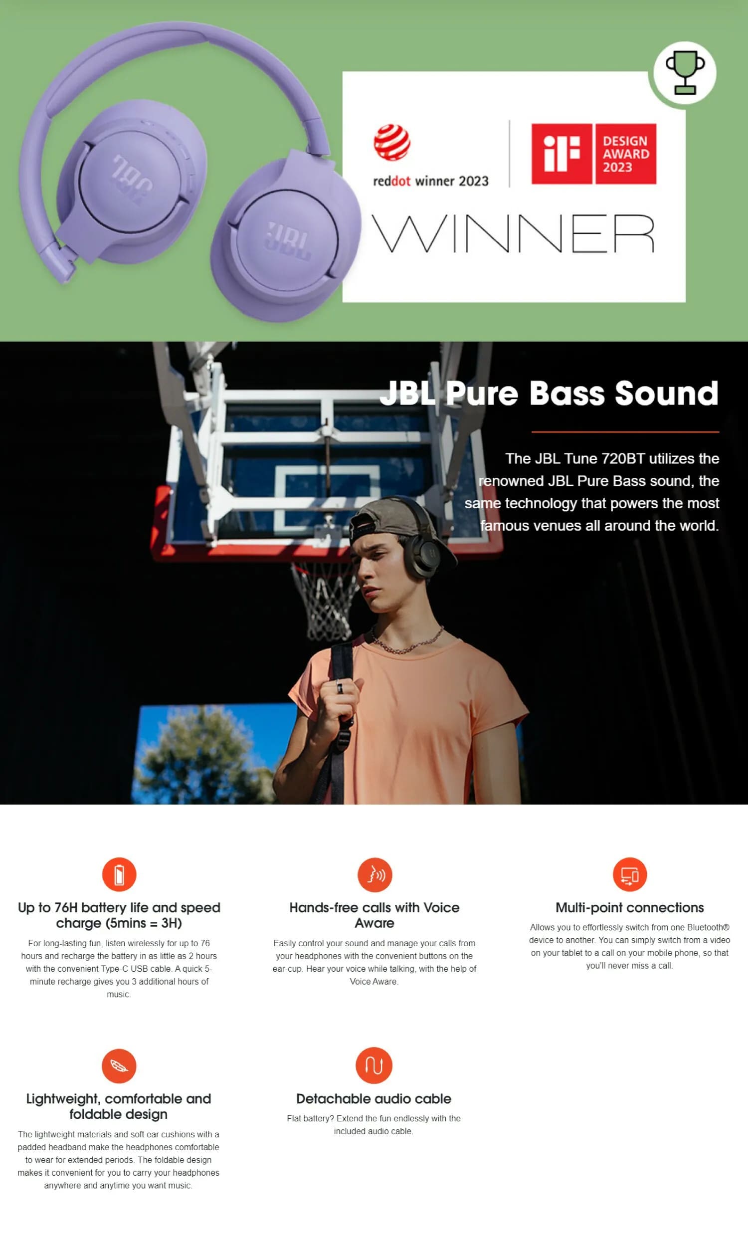 • JBL 純低音:JBL Tune 720BT 具有著名的 JBL Pure Bass 音效,與世界各地最著名的場館所採用的音效相同。
