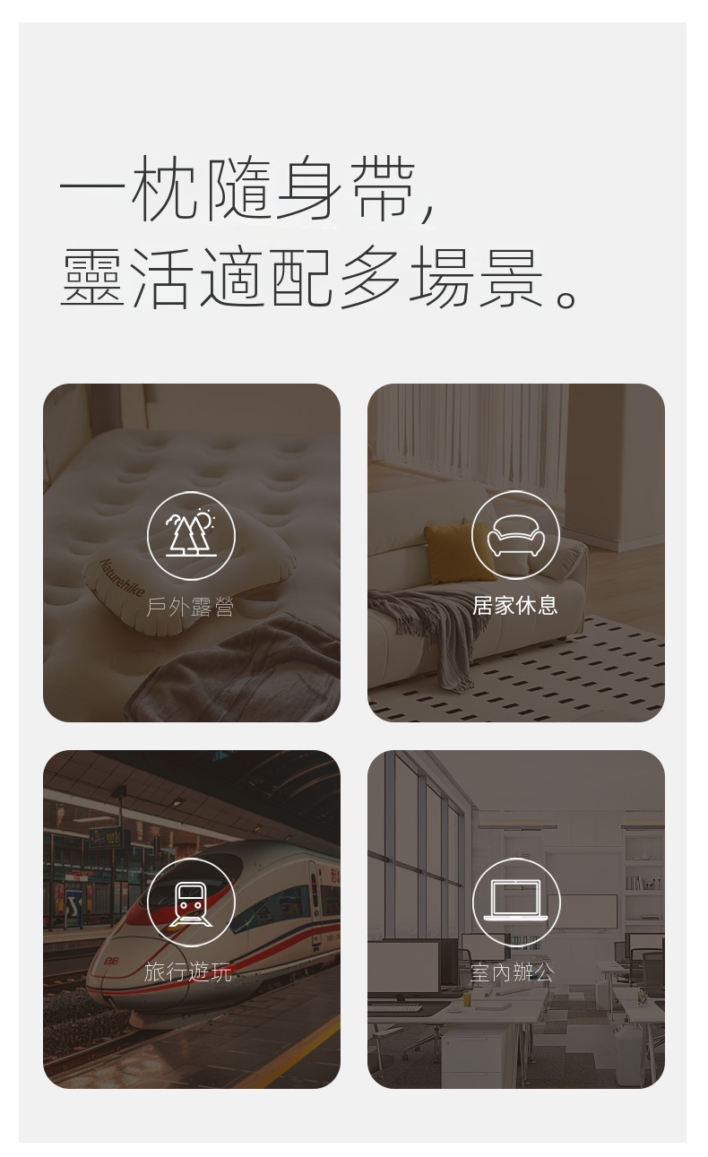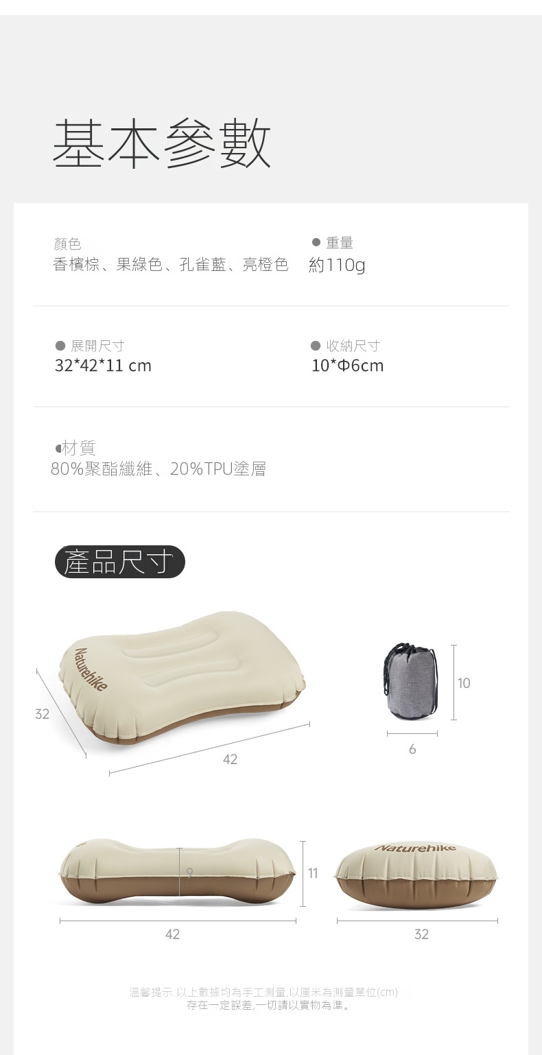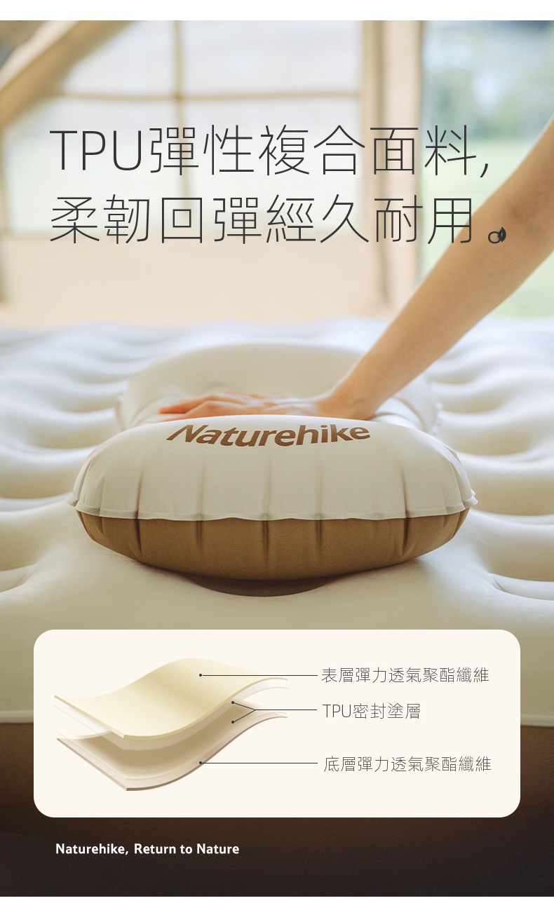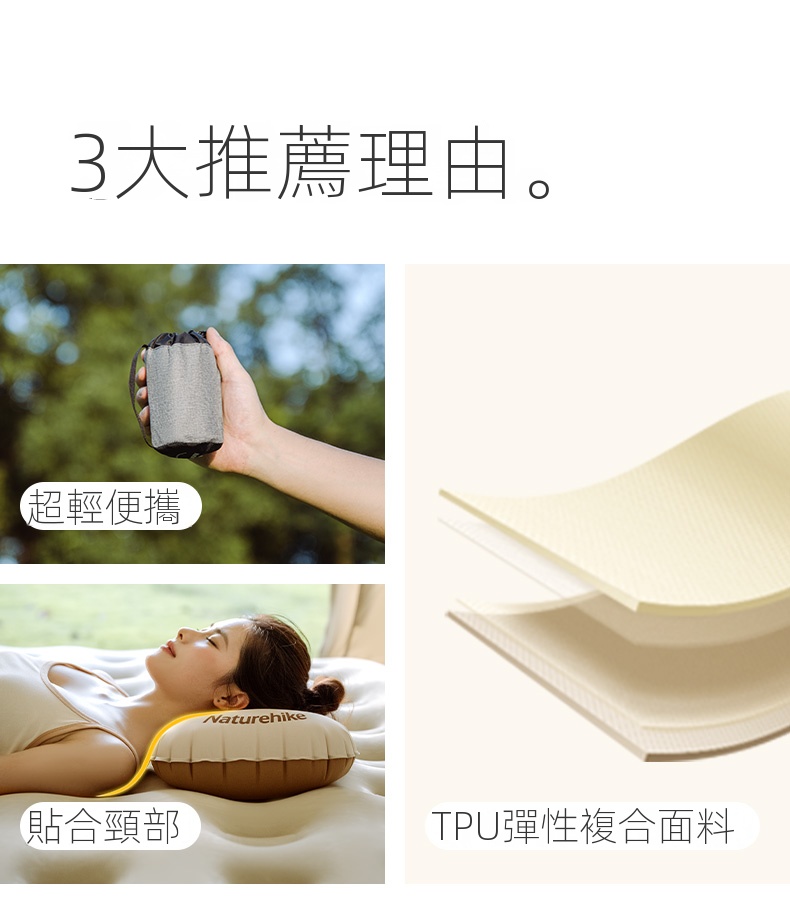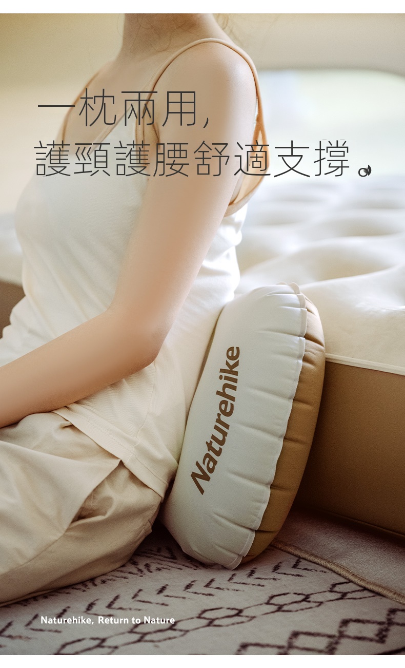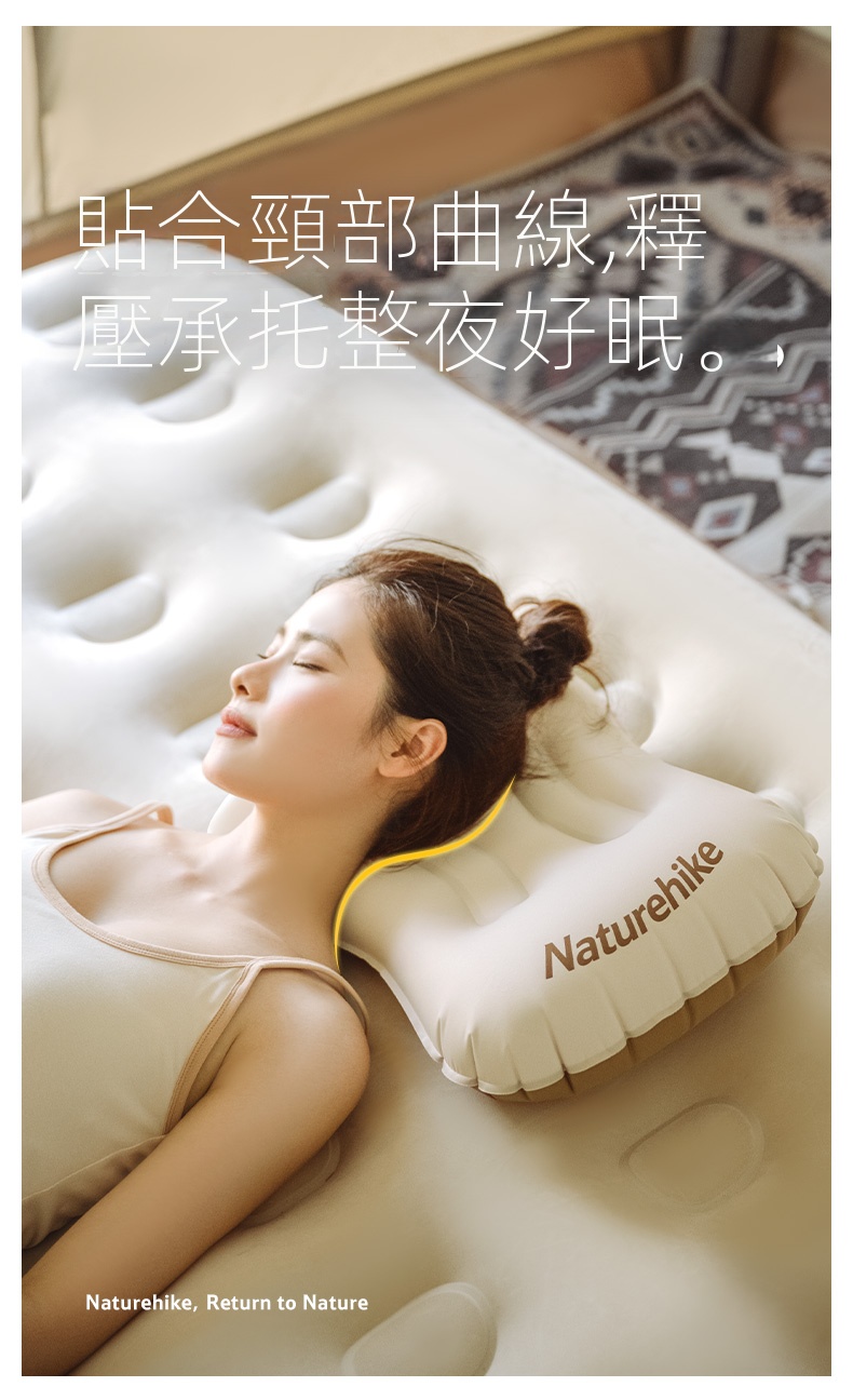 NatureHike 超輕量TPU吹氣枕頭採用TPU彈性複合面料,柔韌耐用且透氣舒適。貼合頸部曲線設計,有效釋壓承托,帶來整夜好眠。三口即可吹滿,充放氣快速便捷,枕高可調,滿足不同需求。超輕便攜,適合戶外露營、旅行、居家或辦公多種場景使用。一枕兩用,亦可作為腰靠支撐,提升舒適度,安心睡眠每一刻。