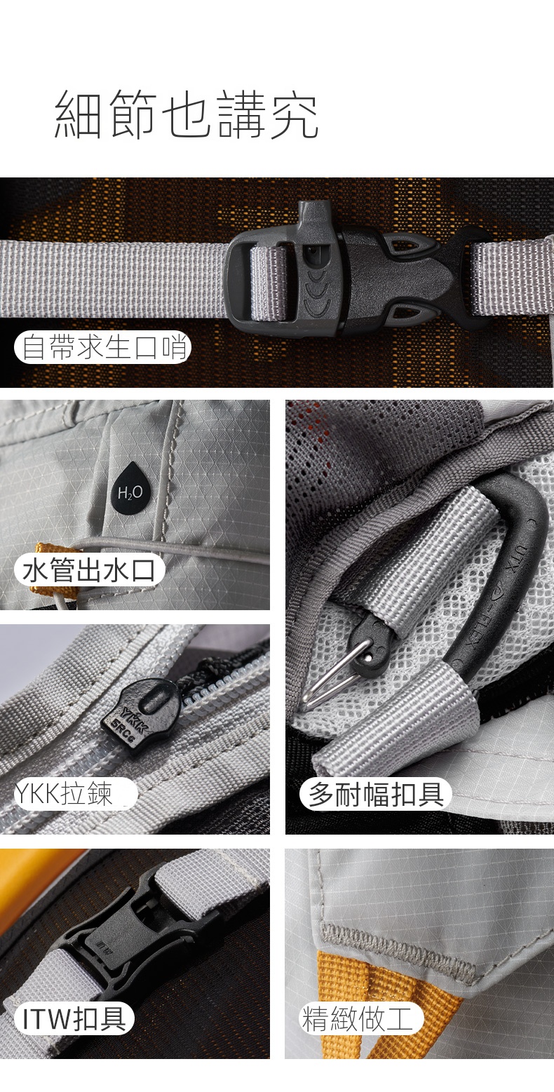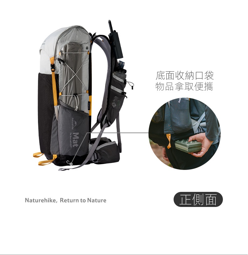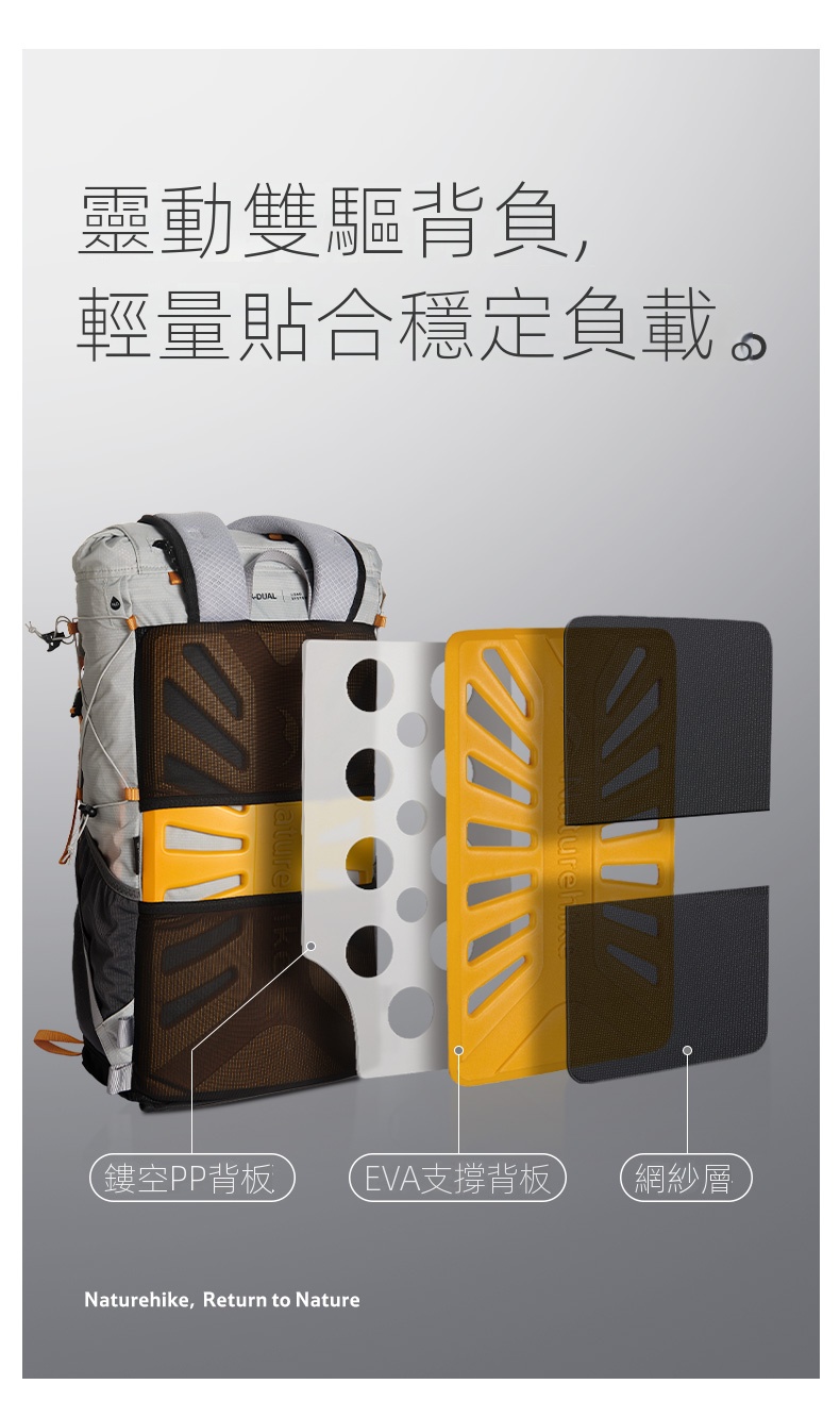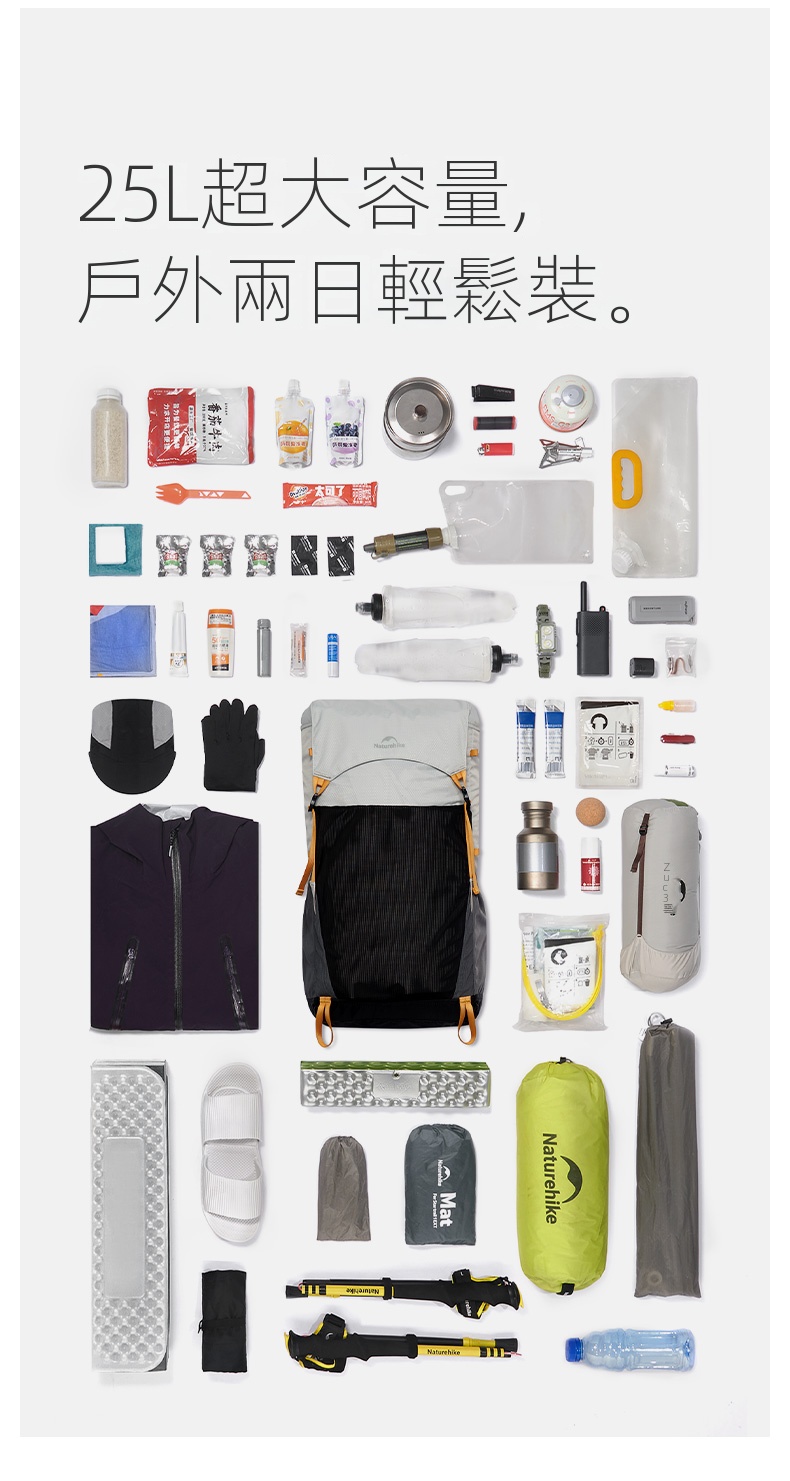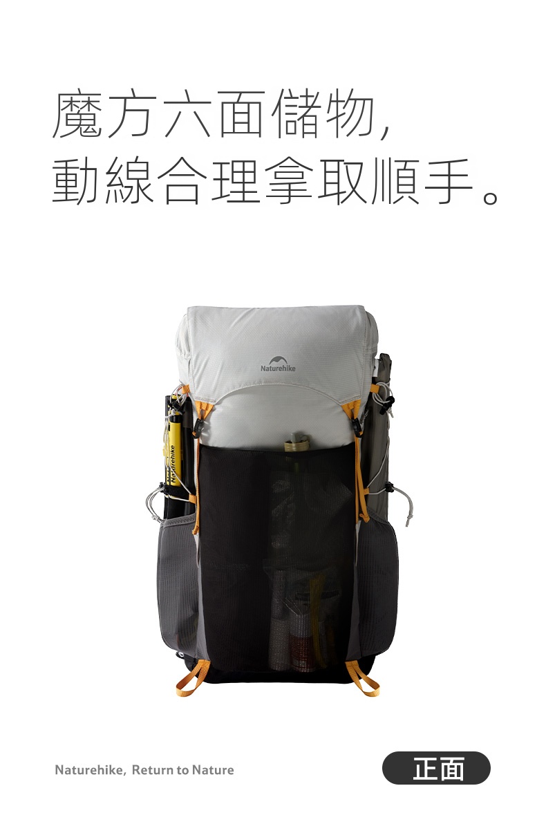 Naturehike Hydrogen·氫系列輕量化可折疊雙肩背包,超大容量,適合戶外兩日行程。採用透氣背板與可拆卸透氣腰封設計,提升背負舒適度。魔方六側儲物結構,動線合理,取物順手。搭載鏤空PP背板與EVA支撐背板,實現輕量貼合穩定負載。內置多區立體透氣設計,肩腰背板全面透氣。配備YKK拉鍊、ITW扣具及自帶求生口哨等細節,兼具實用與安全,是徒步旅行的理想選擇。