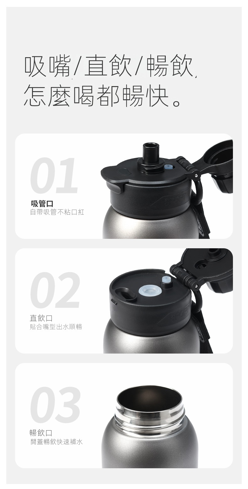 • 三種飲用方式:吸管口、直飲口、暢飲口,滿足不同需求