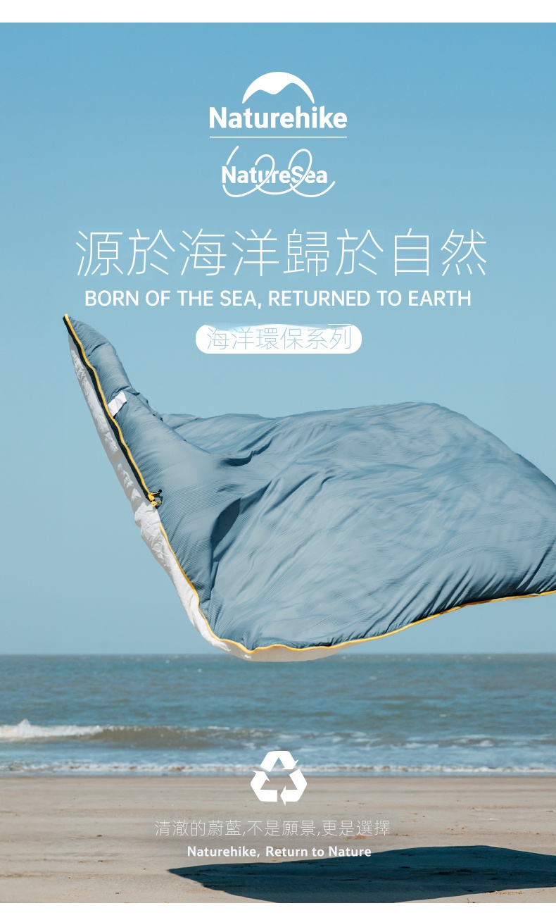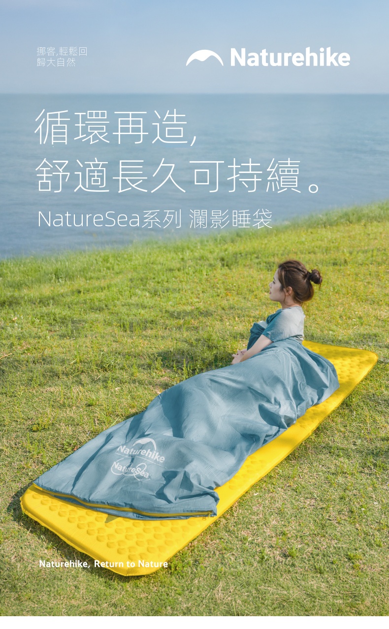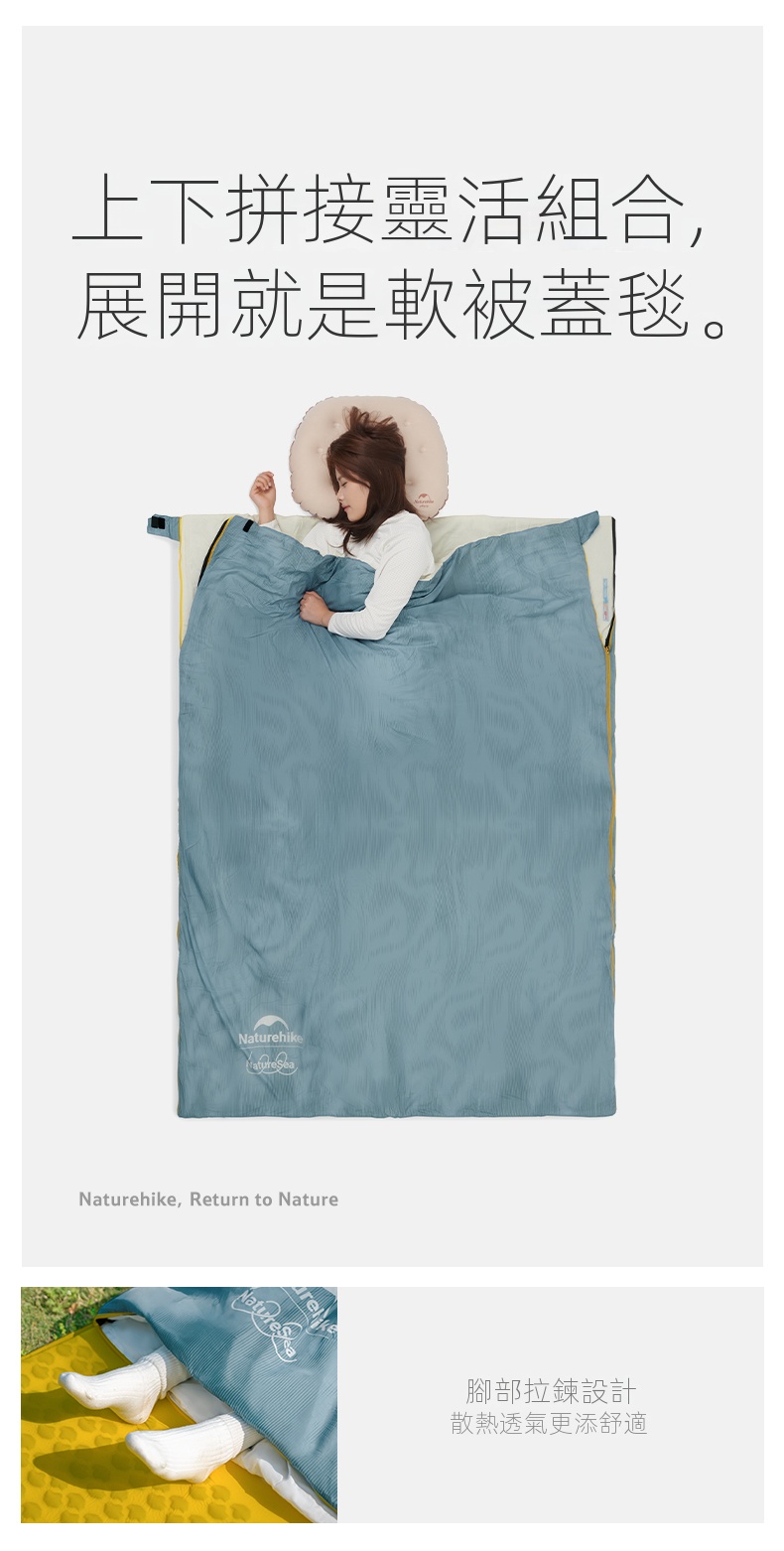 Naturehike NatureSea 瀾影成人戶外露營輕量化睡袋,採用柔軟海洋棉填充,搭配20D環保尼龍面料與春亞紡里料,親膚透氣,整夜舒適好眠。上下拼接設計可靈活組合,展開即為軟被蓋毯,適合露營、戶外、居家多種場景使用。具備腳部拉鏈設計,提升散熱透氣性,並通過甲醛安全檢測,環保安心。